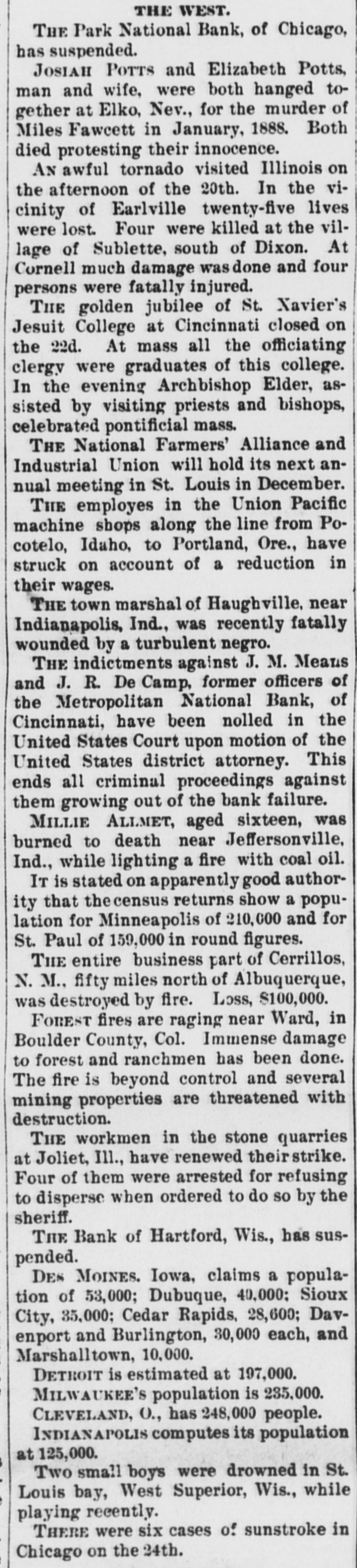 THE WEST. THE Park National Bank, of Chicago, has suspended. JOSIAH POTTS and Elizabeth Potts, man and wife, were both hanged together at Elko, Nev., for the murder of Miles Fawcett in January, 1888. Both died protesting their innocence. AN awful tornado visited Illinois on the afternoon of the 20th. In the vicinity of Earlville twenty-five lives were lost. Four were killed at the village of Sublette, south of Dixon. At Cornell much damage wasdone and four persons were fatally injured. THE golden jubilee of St. Navier's Jesuit College at Cincinnati closed on the 22d. At mass all the officiating clergy were graduates of this college. In the evening Archbishop Elder, assisted by visiting priests and bishops, celebrated pontificial mass. THE National Farmers' Alliance and Industrial Union will hold its next annual meeting in St. Louis in December. THE employes in the Union Pacific machine shops along the line from Pocotelo, Idaho, to Portland, Ore., have struck on account of a reduction in their wages. THE town marshal of Haughville, near Indianapolis, Ind., was recently fatally wounded by a turbulent negro. THE indictments against J. M. Means and J. R. De Camp, former officers of the Metropolitan National Bank, of Cincinnati, have been nolled in the United States Court upon motion of the United States district attorney. This ends all criminal proceedings against them growing out of the bank failure. MILLIE ALLMET, aged sixteen, was burned to death near Jeffersonville, Ind., while lighting a fire with coal oil. IT is stated on apparently good authority that thecensus returns show a population for Minneapolis of 210,000 and for St. Paul of 159,000 in round figures. THE entire business part of Cerrillos, N. M., fifty miles north of Albuquerque, was destroyed by fire. Loss, $100,000. FOREST fires are raging near Ward, in Boulder County, Col. Immense damage to forest and ranchmen has been done. The fire is beyond control and several mining properties are threatened with destruction. THE workmen in the stone quarries at Joliet, Ill., have renewed their strike. Four of them were arrested for refusing to disperse when ordered to do so by the sheriff. THE Bank of Hartford, Wis., has suspended. DES MOINES. Iowa, claims a population of 53,000; Dubuque, 40,000; Sioux City, 35,000; Cedar Rapids, 28,600; Davenport and Burlington, 30,000 each, and Marshalltown, 10,000. DETROIT is estimated at 197,000. MILWAUKEE'S population is 235,000. CLEVELAND, o., has 248,000 people. INDIANAPOLIS computes its population at 125,000. Two small boys were drowned in St. Louis bay, West Superior, Wis., while playing recently. THERE were six cases of sunstroke in Chicago on the 24th.