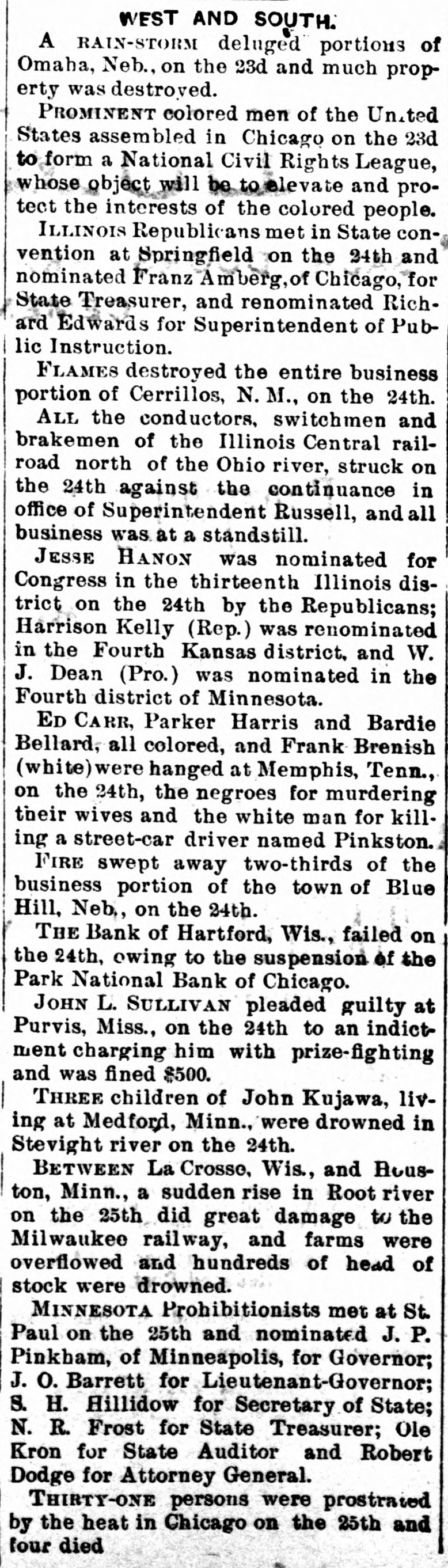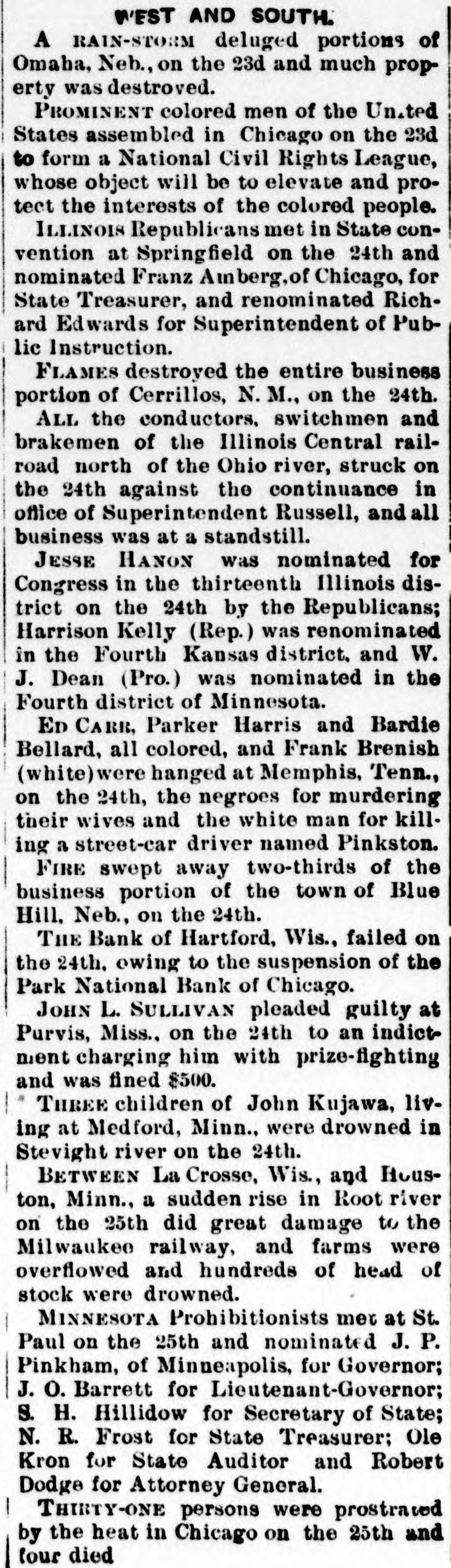 WEST AND SOUTH. A RAIN-STORM deluged portions of Omaha, Neb., on the 23d and much property was destroyed. PROMINENT colored men of the United States assembled in Chicago on the 23d to form a National Civil Rights League, whose object will be to elevate and protect the interests of the colored people. ILLINOIS Republicans met in State convention at Springfield on the 24th and nominated Franz Amberg, of Chicago, for State Treasurer, and renominated Richard Edwards for Superintendent of Public Instruction. FLAMES destroyed the entire business portion of Cerrillos, N. M., on the 24th. ALL the conductors, switchmen and brakemen of the Illinois Central railroad north of the Ohio river, struck on the 24th against the continuance in office of Superintendent Russell, and all business was at a standstill. JESSE HANON was nominated for Congress in the thirteenth Illinois district on the 24th by the Republicans; Harrison Kelly (Rep.) was renominated in the Fourth Kansas district. and W. J. Dean (Pro.) was nominated in the Fourth district of Minnesota. ED CARR, Parker Harris and Bardie Bellard, all colored, and Frank Brenish (white) were hanged at Memphis, Tenn., on the 24th, the negroes for murdering their wives and the white man for killing a street-car driver named Pinkston. FIRE swept away two-thirds of the business portion of the town of Blue Hill, Neb, on the 24th. THE Bank of Hartford, Wis., failed on the 24th, owing to the suspension of the Park National Bank of Chicago. JOHN L. SULLIVAN pleaded guilty at Purvis, Miss., on the 24th to an indictment charging him with prize-fighting and was fined $500. THREE children of John Kujawa, living at Medford, Minn., were drowned in Stevight river on the 24th. BETWEEN La Crosse, Wis., and Houston, Minn., a sudden rise in Root river on the 25th did great damage to the Milwaukee railway, and farms were overflowed and hundreds of head of stock were drowned. MINNESOTA Prohibitionists met at St. Paul on the 25th and nominated J.P. Pinkham, of Minneapolis, for Governor; J. O. Barrett for Lieutenant-Governor; S. H. Hillidow for Secretary of State; N. R. Frost for State Treasurer; Ole Kron for State Auditor and Robert Dodge for Attorney General. THIRTY-ONE persons were prostrated by the heat in Chicago on the 25th and four died