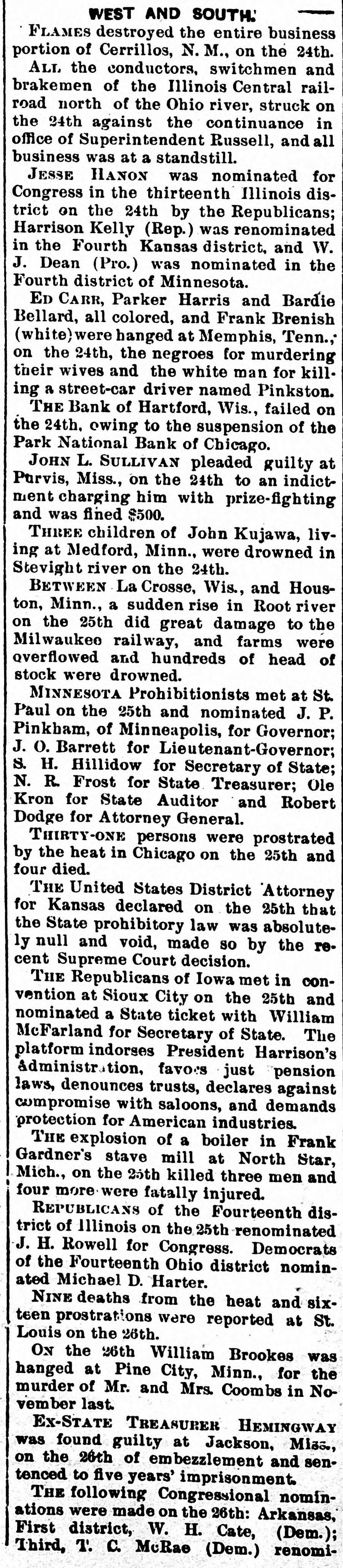 WEST AND SOUTH.' FLAMES destroyed the entire business portion of Cerrillos, N. M., on the 24th. ALL the conductors, switchmen and brakemen of the Illinois Central railroad north of the Ohio river, struck on the 24th against the continuance in office of Superintendent Russell, and all business was at a standstill. JESSE HANON was nominated for Congress in the thirteenth Illinois district on the 24th by the Republicans; Harrison Kelly (Rep.) was renominated in the Fourth Kansas district, and W. J. Dean (Pro.) was nominated in the Fourth district of Minnesota. ED CARR, Parker Harris and Bardie Bellard, all colored, and Frank Brenish (white) were hanged at Memphis, Tenn.; on the 24th, the negroes for murdering their wives and the white man for killing a street-car driver named Pinkston. THE Bank of Hartford, Wis., failed on the 24th. owing to the suspension of the Park National Bank of Chicago. JOHN L. SULLIVAN pleaded guilty at Purvis, Miss., on the 24th to an indictment charging him with prize-fighting and was fined $500. THREE children of John Kujawa, living at Medford, Minn., were drowned in Stevight river on the 24th. BETWEEN La Crosse, Wis., and Houston, Minn., a sudden rise in Root river on the 25th did great damage to the Milwaukee railway, and farms were overflowed and hundreds of head of stock were drowned. MINNESOTA Prohibitionists met at St. Paul on the 25th and nominated J. P. Pinkham, of Minneapolis, for Governor; J. O. Barrett for Lieutenant-Governor; S. H. Hillidow for Secretary of State; N. R. Frost for State Treasurer; Ole Kron for State Auditor and Robert Dodge for Attorney General. THIRTY-ONE persons were prostrated by the heat in Chicago on the 25th and four died. THE United States District Attorney for Kansas declared on the 25th that the State prohibitory law was absolutely null and void, made so by the recent Supreme Court decision. THE Republicans of Iowa met in convention at Sioux City on the 25th and nominated a State ticket with William McFarland for Secretary of State. The platform indorses President Harrison's Administration, favors just pension laws, denounces trusts, declares against compromise with saloons, and demands protection for American industries. THE explosion of a boiler in Frank Gardner's stave mill at North Star, Mich., on the 25th killed three men and four more were fatally injured. REPUBLICANS of the Fourteenth district of Illinois on the 25th renominated J. H. Rowell for Congress. Democrats of the Fourteenth Ohio district nominated Michael D. Harter. NINE deaths from the heat and sixteen prostrations were reported at St. Louis on the 26th. ON the 26th William Brookes was hanged at Pine City, Minn., for the murder of Mr. and Mrs. Coombs in November last. EX-STATE TREASURER HEMINGWAY was found guilty at Jackson, Miss., on the 26th of embezzlement and sentenced to five years' imprisonment. THE following Congressional nominations were made on the 26th: Arkansas, First district, W. H. Cate, (Dem.); Third, T. C. McRae (Dem.) renomi-