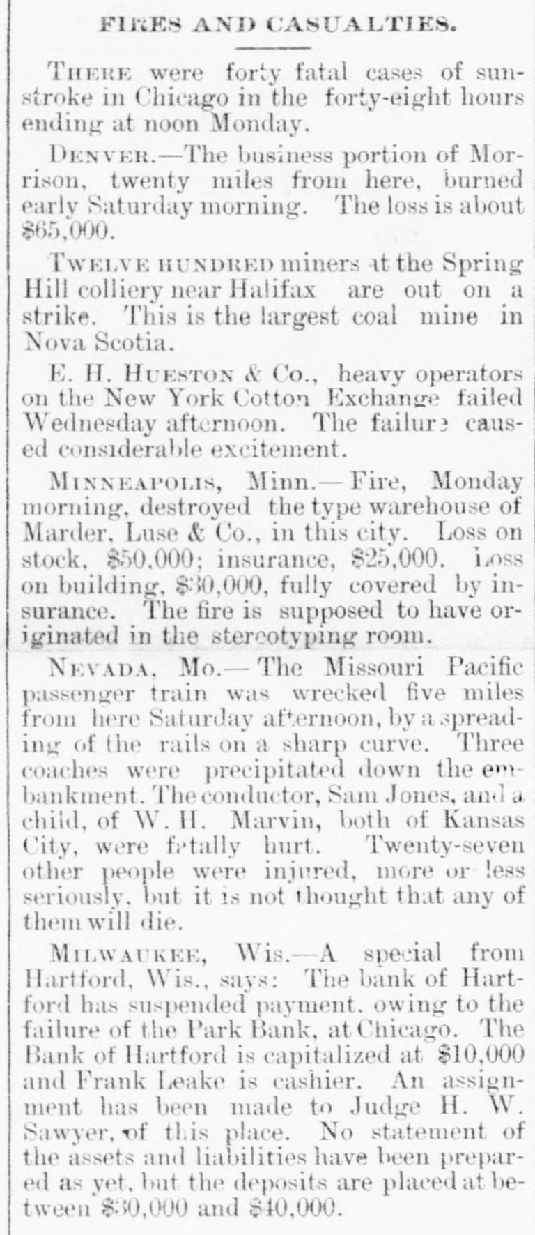 FIRES AND CASUALTIES. THERE were forty fatal cases of sunstroke in Chicago in the forty-eight hours ending at noon Monday. DENVER.-The business portion of Morrison, twenty miles from here, burned early Saturday morning. The loss is about $65,000. TWELVE HUNDRED miners at the Spring Hill colliery near Halifax are out on a strike. This is the largest coal mine in Nova Scotia. E. H. HUESTON & Co., heavy operators on the New York Cotton Exchange failed Wednesday afternoon. The failure caused considerable excitement. MINNEAPOLIS, Minn.-Fire, Monday morning, destroyed the type warehouse of Marder, Luse & Co., in this city. Loss on stock, $50,000; insurance, $25,000. Loss on building, $30,000, fully covered by insurance. The fire is supposed to have originated in the stereotyping room. NEVADA, Mo.- The Missouri Pacific passenger train was wrecked five miles from here Saturday afternoon, by a spreading of the rails on a sharp curve. Three coaches were precipitated down the embankment. The conductor, Sam Jones, and a child, of W. H. Marvin, both of Kansas City, were fetally hurt. Twenty-seven other people were injured, more or less seriously, but it is not thought that any of them will die. MILWAUKEE, Wis.-A special from Hartford, Wis., says: The bank of Hartford has suspended payment. owing to the failure of the Park Bank, at Chicago. The Bank of Hartford is capitalized at $10,000 and Frank Leake is cashier. An assignment has been made to Judge H. W. Sawyer, of this place. No statement of the assets and liabilities have been prepared as yet. but the deposits are placed at between $30,000 and $40,000.