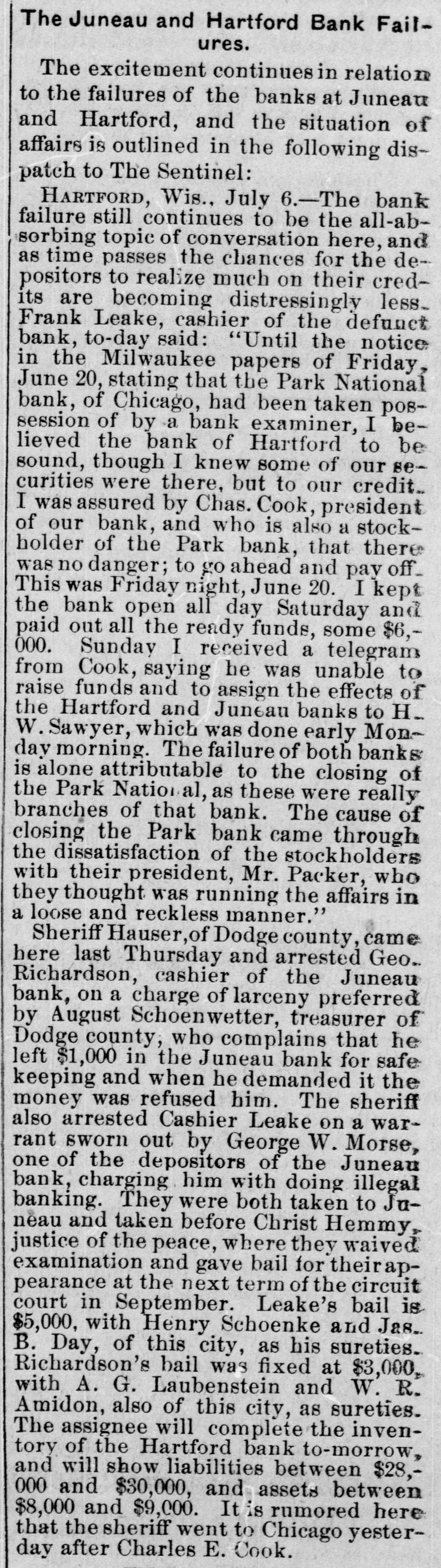 The Juneau and Hartford Bank Failures. The excitement continues in relation to the failures of the banks at Juneau and Hartford, and the situation of affairs is outlined in the following dispatch to The Sentinel: HARTFORD, Wis., July 6.-The bank failure still continues to be the all-absorbing topic of conversation here, and as time passes the chances for the depositors to realize much on their credits are becoming distressingly less_ Frank Leake, cashier of the defunct bank, to-day said: "Until the notice in the Milwaukee papers of Friday, June 20, stating that the Park National bank, of Chicago, had been taken possession of by a bank examiner, I believed the bank of Hartford to be sound, though I knew some of our securities were there, but to our credit.. I was assured by Chas. Cook, president of our bank, and who is also a stockholder of the Park bank, that there was no danger; to go ahead and pay off_ This was Friday night, June 20. I kept the bank open all day Saturday and paid out all the ready funds, some $6,000. Sunday I received a telegram from Cook, saying he was unable to raise funds and to assign the effects of the Hartford and Juneau banks to H. W. Sawyer, which was done early Mon~ day morning. The failure of both banks is alone attributable to the closing of the Park Nation al, as these were really branches of that bank. The cause of closing the Park bank came through the dissatisfaction of the stockholders with their president, Mr. Packer, who they thought was running the affairs in a loose and reckless manner." Sheriff Hauser, of Dodge county, came here last Thursday and arrested Geo.. Richardson, cashier of the Juneau bank, on a charge of larceny preferred by August Schoenwetter, treasurer of Dodge county, who complains that he left $1,000 in the Juneau bank for safe keeping and when he demanded it the money was refused him. The sheriff also arrested Cashier Leake on a warrant sworn out by George W. Morse, one of the depositors of the Juneau bank, charging him with doing illegal banking. They were both taken to Juneau and taken before Christ Hemmy, justice of the peace, where they waived examination and gave bail for theirappearance at the next term of the circuit court in September. Leake's bail is $5,000, with Henry Schoenke and Jas... B. Day, of this city, as his sureties. Richardson's bail was fixed at $3,000, with A. G. Laubenstein and W. R. Amidon, also of this city, as sureties. The assignee will complete the inventory of the Hartford bank to-morrow, and will show liabilities between $28,000 and $30,000, and assets between $8,000 and $9,000. It is rumored here that the sheriff went to Chicago yesterday after Charles E. Cook.