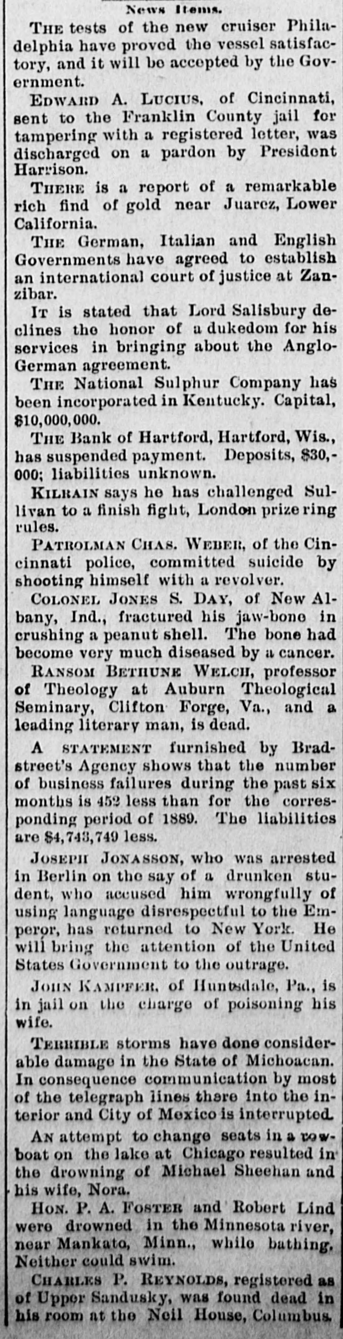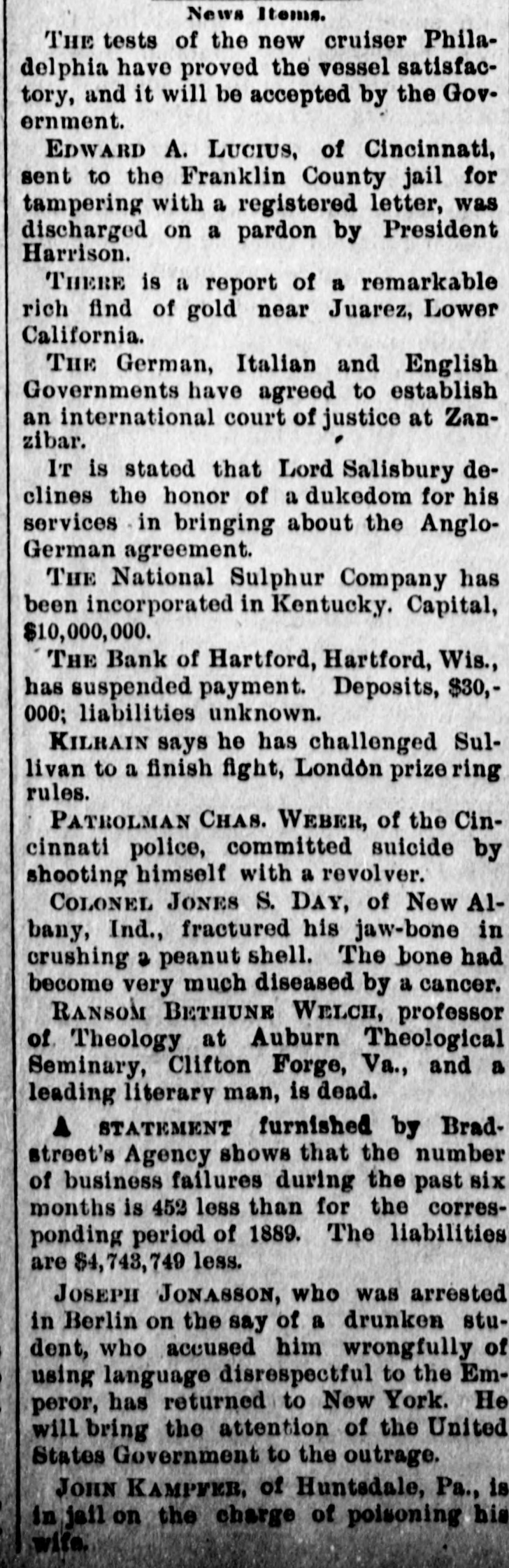 News Items. THE tests of the new cruiser Philadelphia have proved the vessel satisfactory, and it will be accepted by the Government. Edward A. LUCIUS, of Cincinnati, sent to the Franklin County jail for tampering with a registered letter, was discharged on a pardon by President Harrison. THERE is a report of a remarkable rich find of gold near Juarez, Lower California. THE German, Italian and English Governments have agreed to establish an international court of justice at Zanzibar. IT is stated that Lord Salisbury declines the honor of a dukedom for his services in bringing about the AngloGerman agreement. THE National Sulphur Company has been incorporated in Kentucky. Capital, $10,000,000. THE Bank of Hartford, Hartford, Wis., has suspended payment. Deposits, $30,000; liabilities unknown. KILBAIN says he has challenged Sullivan to a finish fight, London prize ring rules. PATROLMAN CHAS. WEBER, of the Cincinnati police, committed suicide by shooting himself with a revolver. COLONEL JONES S. DAY, of New Albany, Ind., fractured his jaw-bone in crushing a peanut shell. The bone had become very much diseased by a cancer. RANSOM BETHUNE WELCH, professor of Theology at Auburn Theological Seminary, Clifton Forge, Va., and a leading literary man, is dead. STATEMENT furnished by Bradstreet's Agency shows that the number of business failures during the past six months is 452 less than for the corresponding period of 1889. The liabilities are $4,743,749 less. JOSEPH JONASSON, who was arrested in Berlin on the say of a drunken student, who accused him wrongfully of using language disrespectful to the Emperor, has returned to New York. He will bring the attention of the United States Government to the outrage. JOHN KAMPΓEB, of Huntsdale, Pa., is in jail on the charge of poisoning his wife.