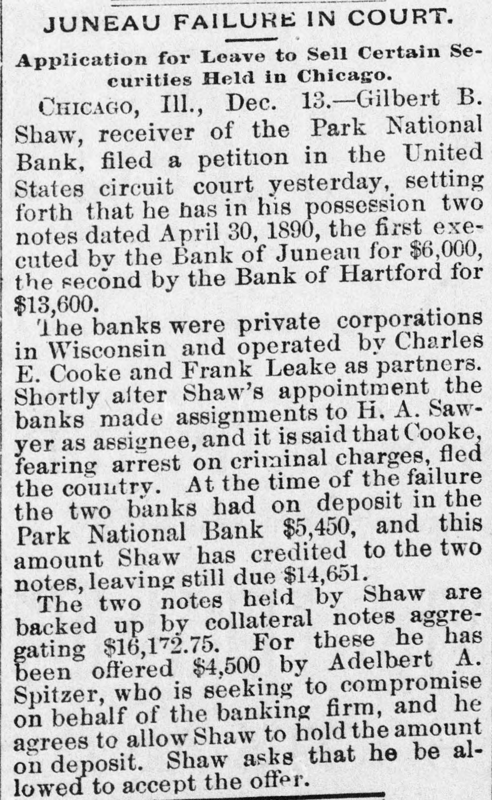 JUNEAU FAILURE IN COURT. Application for Leave to Sell Certain Securities Held in Chicago. CHICAGO, Ill., Dec. 13.-Gilbert B. Shaw, receiver of the Park National Bank, filed a petition in the United States circuit court yesterday, setting forth that he has in his possession two notes dated April 30, 1890, the first executed by the Bank of Juneau for $6,000, the second by the Bank of Hartford for $13,600. The banks were private corporations in Wisconsin and operated by Charles E. Cooke and Frank Leake as partners. Shortly after Shaw's appointment the banks made assignments to H. A. Sawyer as assignee, and it is said that Cooke, fearing arrest on criminal charges, fled the country. At the time of the failure the two banks had on deposit in the Park National Bank $5,450, and this amount Shaw has credited to the two notes, leaving still due $14,651. The two notes held by Shaw are backed up by collateral notes aggregating $16,172.75. For these he has been offered $4,500 by Adelbert A. Spitzer, who is seeking to compromise on behalf of the banking firm, and he agrees to allow Shaw to hold the amount on deposit. Shaw asks that he be allowed to accept the offer.