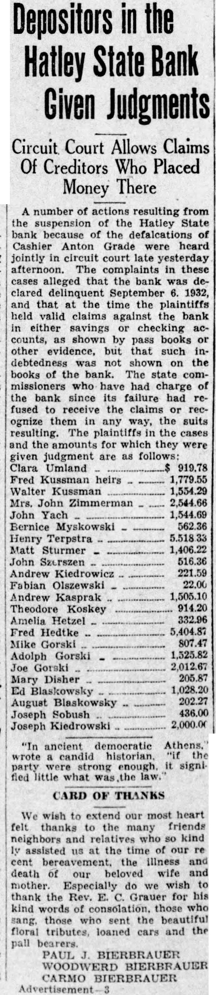 Depositors in the Hatley Given Judgments Circuit Court Allows Claims Of Creditors Who Placed Money There number of actions resulting from the suspension of the Hatley State bank because of the defalcations of Cashier Anton Grade were heard jointly circuit court late yesterday afternoon. The complaints in these cases alleged that the bank clared September 1932, and that the time the plaintiffs held valid claims against the bank either savings checking accounts, shown pass books or other evidence, but such debtedness not shown on the books of the bank. The state commissioners who have had charge bank since its failure had fused receive the claims recognize them the suits resulting. The plaintiffs in the cases and the amounts for which they judgment are follows: Clara Umland 919.78 Fred Kussman heirs 1,779.55 Walter Kussman Mrs. John Zimmerman John Yach Bernice Myskowski Henry Terpstra Matt Sturmer John 516.36 Andrew Kiedrowicz Fabian Olszewski 22.00 Andrew Kasprak 1,505.10 Theodore Koskey Amelia Hetzel Fred Hedtke Gorski Adolph Gorski 1,525.82 Joe Gorski 2,012.67 205.87 Mary Disher Ed 1,028.20 August Blaskowsky 202.27 Joseph Sobush 436.00 Joseph Kiedrowski 2,000.00 ancient democratic strong little what CARD OF THANKS We wish to extend our most heart felt thanks the many friends neighbors and kind the time the illness death beloved wife Especially do wish thank the Rev. Grauer for kind consolation. those sent the floral tributes, loaned and the PAUL BIERBRAUER BIERBRAUER CARMO