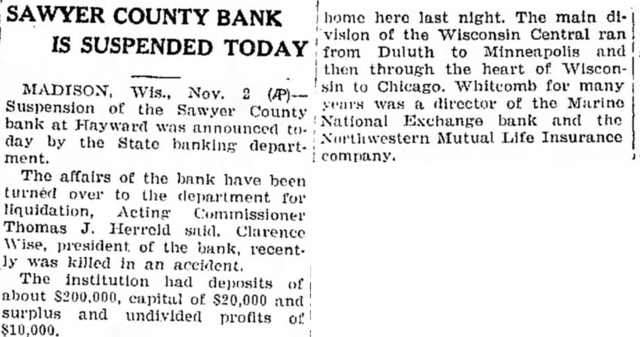 SAWYER COUNTY BANK IS SUSPENDED TODAY MADISON, Wis., Nov. 2 (AP)-Suspension of the Sawyer County bank at Hayward was announced to. day by the State banking department. The affairs of the bank have been turned over to the department for liquidation, Acting Commissioner Thomas J. Herrold said. Clarence Wise, president of the bank, recent. ly was killed in an accident. The institution had deposits of about $200,000. capital of $20,000 and surplus and undivided profits of $10,000. home here last night. The main division of the Wisconsin Central ran from Duluth to Minneapolis and then through the heart of Wisconsin to Chicago. Whitcomb for many years was director of the Marine National Exchange bank and the Northwestern Mutual Life Insurance company.
