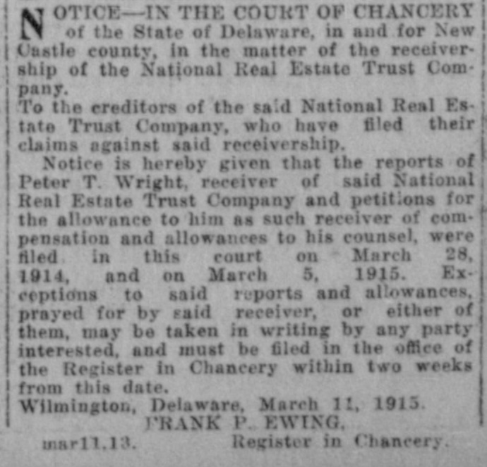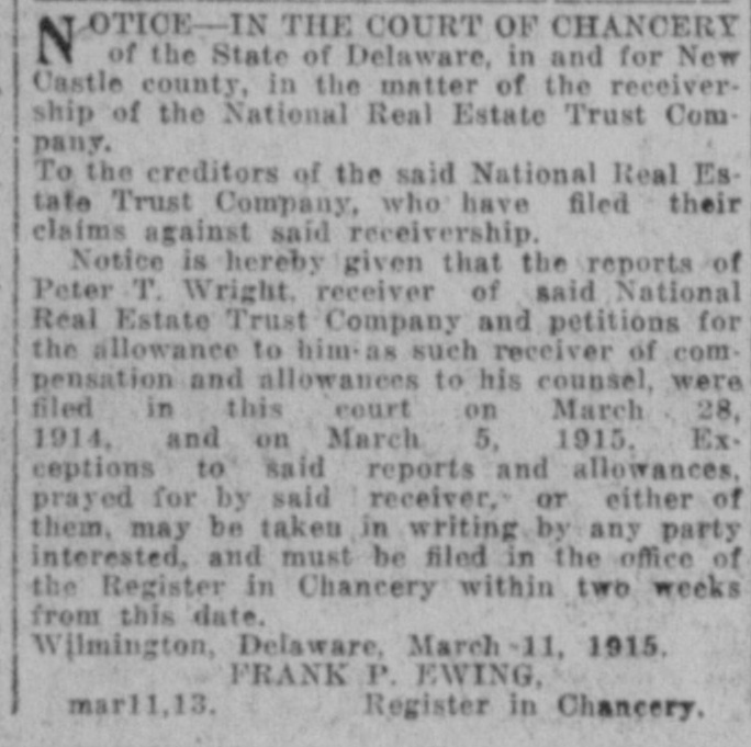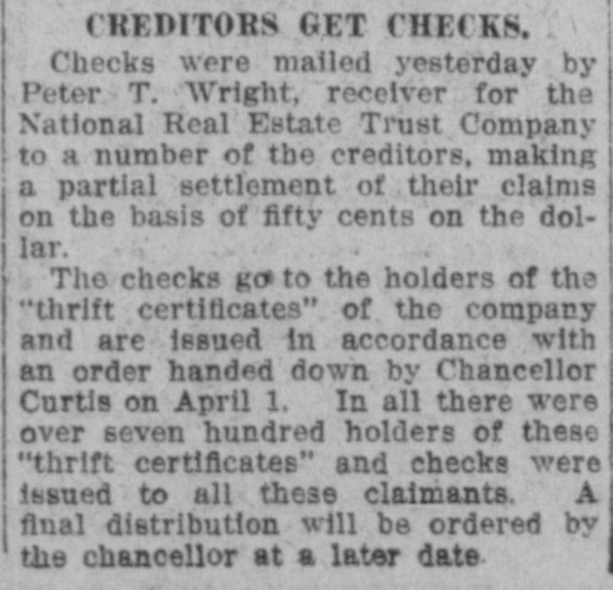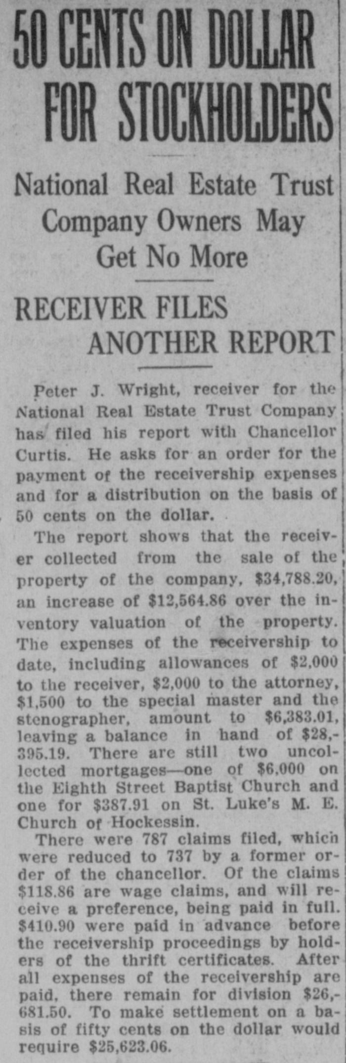 50 CENTS ON DOLLAR FOR STOCKHOLDERS National Real Estate Trust Company Owners May Get No More RECEIVER FILES ANOTHER REPORT Peter J. Wright, receiver for the National Real Estate Trust Company has filed his report with Chancellor Curtis. He asks for an order for the payment of the receivership expenses and for a distribution on the basis of 50 cents on the dollar. The report shows that the receiver collected from the sale of the property of the company, $34,788.20, an increase of $12,564.86 over the inventory valuation of the property. The expenses of the receivership to date, including allowances of $2,000 to the receiver, $2,000 to the attorney, $1,500 to the special master and the stenographer, amount to $6,383.01, leaving a balance in hand of $28,395.19. There are still two uncollected mortgages-one of $6,000 on the Eighth Street Baptist Church and one for $387.91 on St. Luke's M. E. Church of Hockessin. There were 787 claims filed, which were reduced to 737 by a former order of the chancellor. Of the claims $118.86 are wage claims, and will receive a preference, being paid in full. $410.90 were paid in advance before the receivership proceedings by holders of the thrift certificates. After all expenses of the receivership are paid, there remain for division $26,681.50. To make settlement on a basis of fifty cents on the dollar would require $25,623.06.