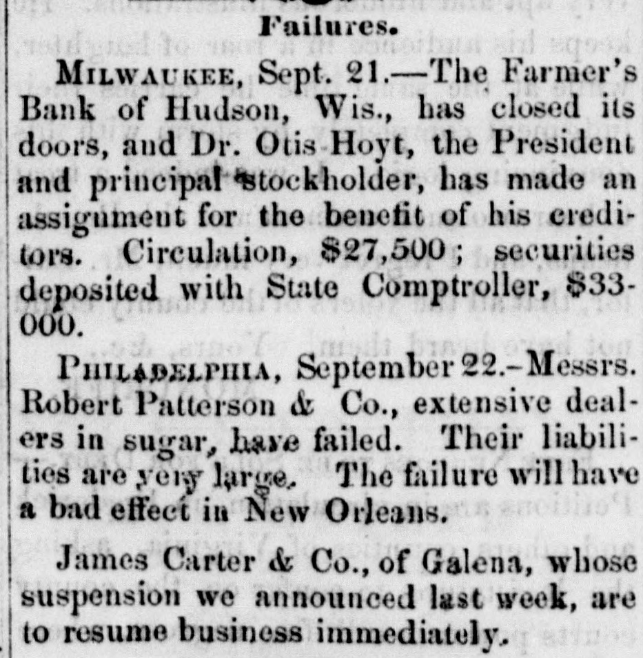 Failures. MILWAUKEE, Sept. 21.-The Farmer's Bank of Hudson, Wis., has closed its doors, and Dr. Otis Hoyt, the President and principal stockholder, has made an assignment for the benefit of his creditors. Circulation, $27,500; securities deposited with State Comptroller, $33000. PHILADELPHIA, September 22.-Messrs. Robert Patterson & Co., extensive dealers in sugar, have failed. Their liabilities are yery large, The failure will have a bad effect in New Orleans. James Carter & Co., of Galena, whose suspension we announced last week, are to resume business immediately.