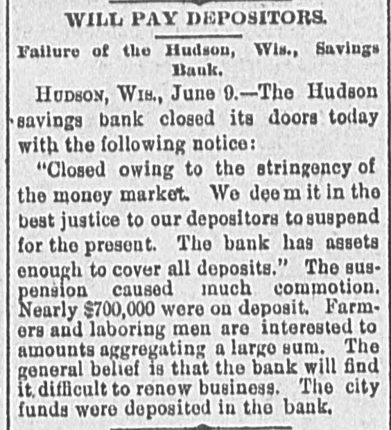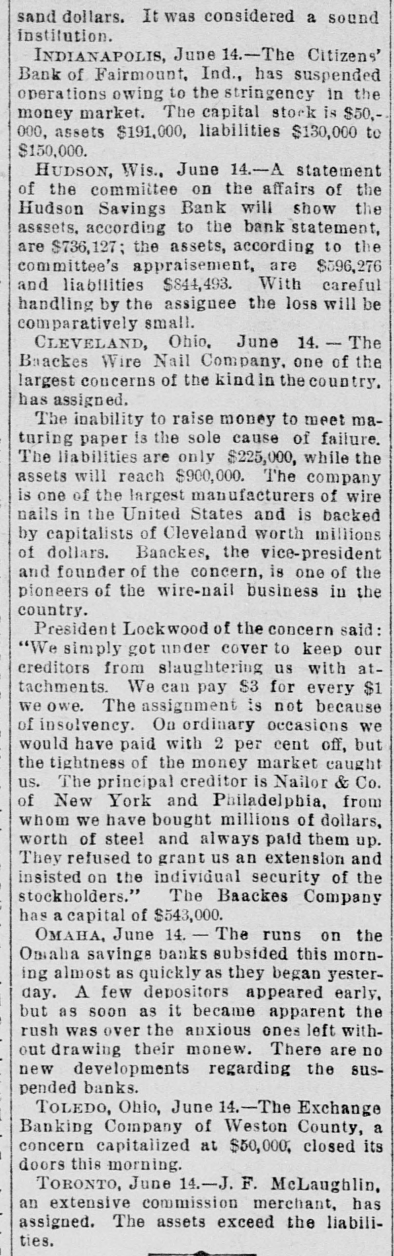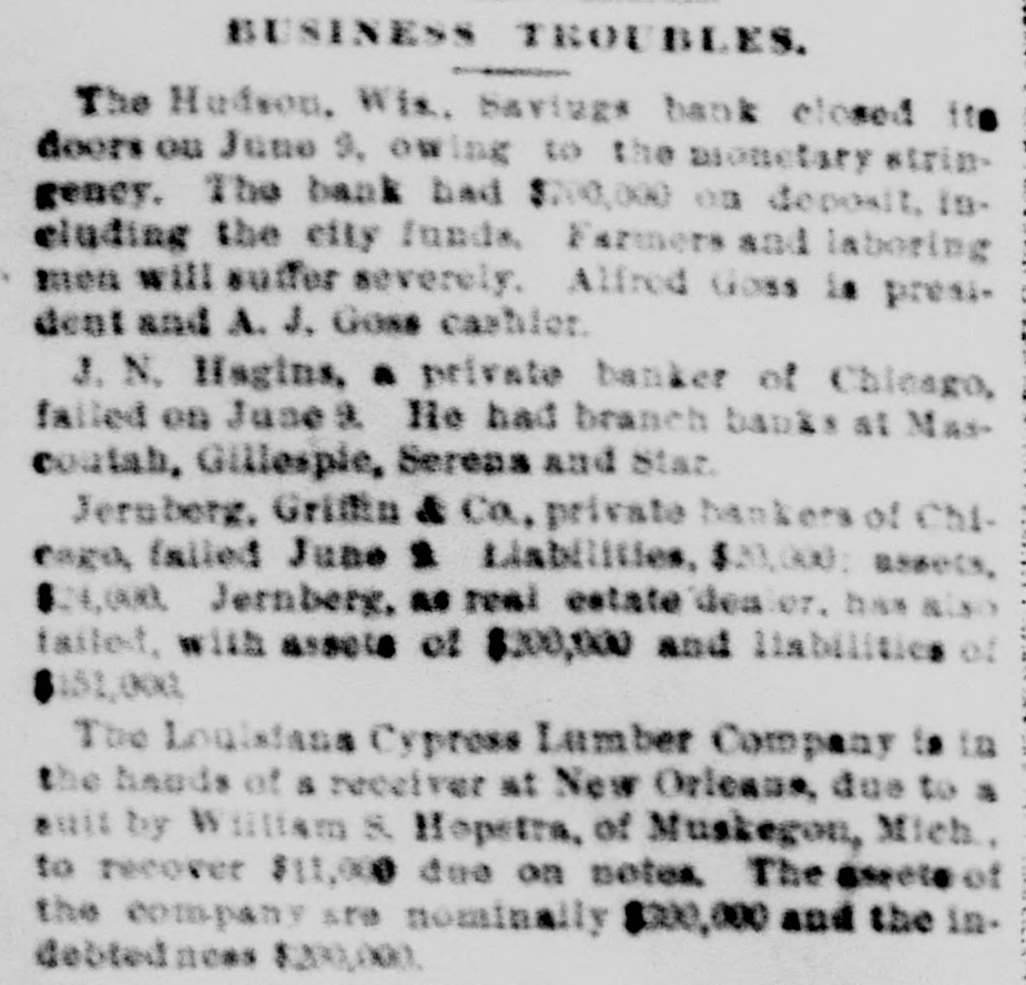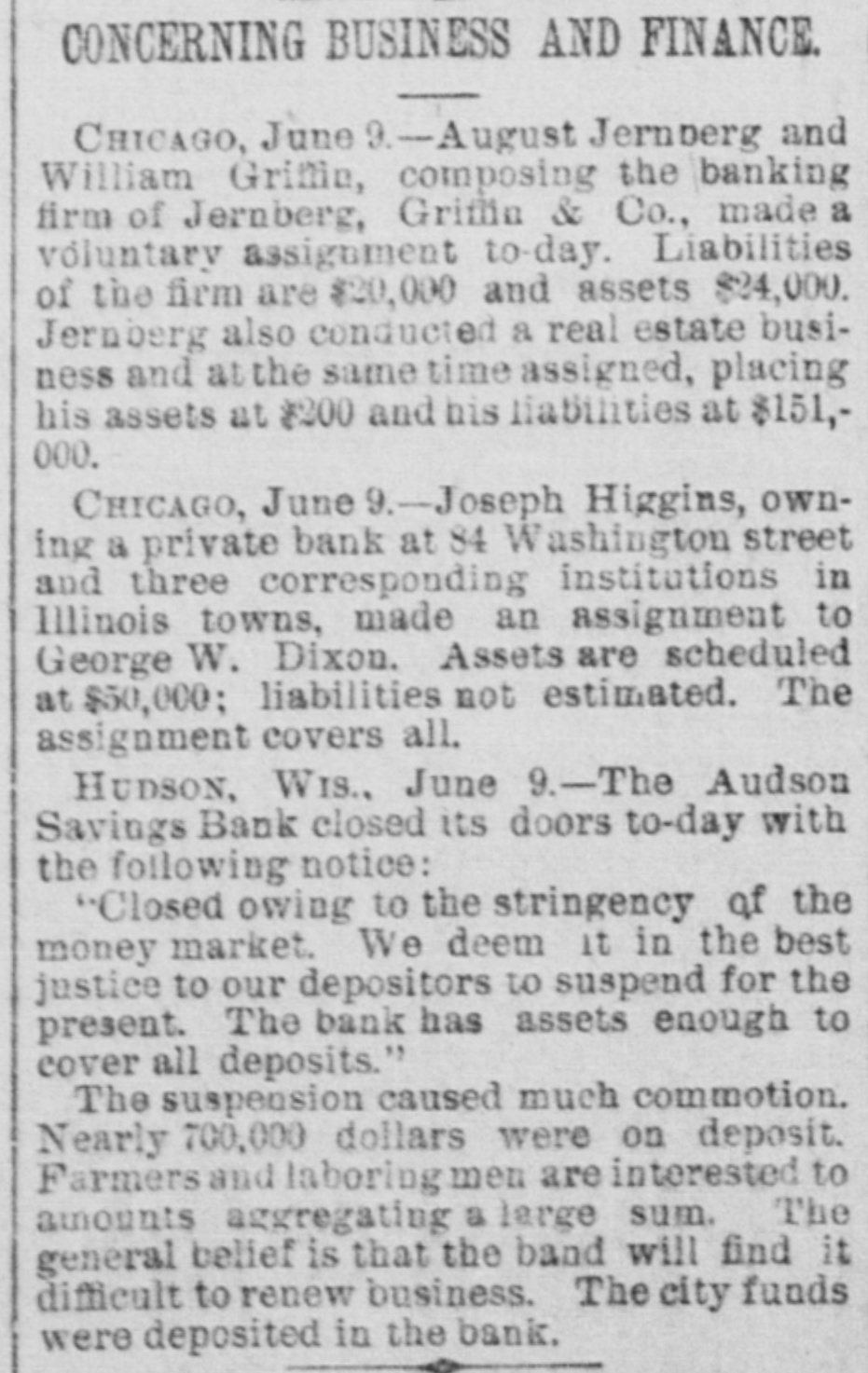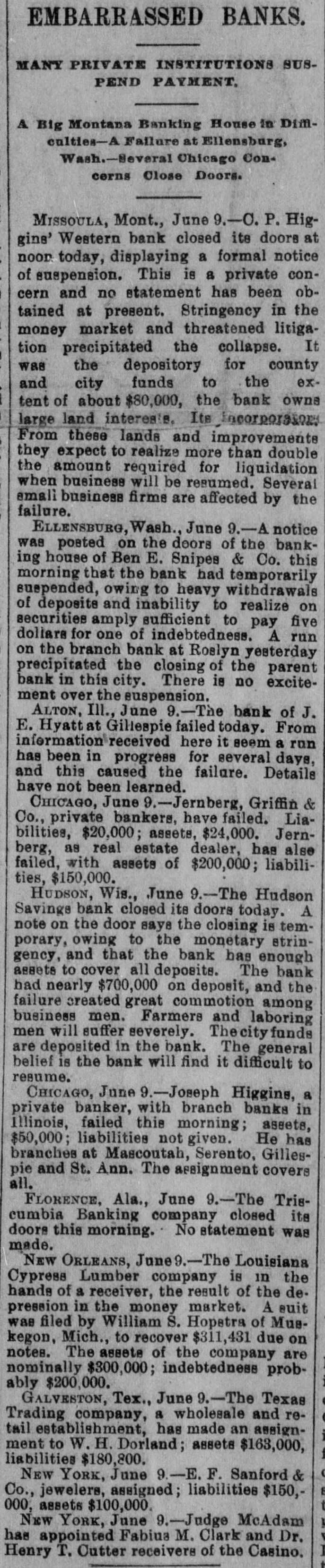 EMBARRASSED BANKS. MANY PRIVATE INSTITUTIONS SUSPEND PAYMENT. A Big Montana Banking House in Dimculties-A Failure at Ellensburg, Wash.-Several Chicago Concorns Close Doors. MISSOULA, Mont., June 9.-C.P.Higgins' Western bank closed its doors at noor today, displaying a formal notice of suspension. This is a private concern and no statement has been obtained at present. Stringency in the money market and threatened litigation precipitated the collapse. It was the depository for county and city funds to the extent of about $80,000, the bank owns large land intereste. Its Encorporators From these lands and improvements they expect to realize more than double the amount required for liquidation when business will be resumed. Several emali business firms are affected by the failure. ELLENSBURG, Wash., June 9.-A notice was posted on the doors of the banking house of Ben E. Snipes & Co. this morning that the bank had temporarily suepended, owing to heavy withdrawals of deposite and inability to realize on securities amply sufficient to pay five dollars for one of indebtedness. A run on the branch bank at Roslyn yesterday precipitated the closing of the parent bank in this city. There is no excitement over the suspension. ALTON, Ill., June 9.-The bank of J. E. Hyattat Gillespie failed today. From information received here it seem a run has been in progress for several days, and this caused the failare. Details have not been learned. CHICAGO, June 9.-Jernberg, Griffin & Co., private bankers, have failed. Liabilities, $20,000; assets, $24,000. Jernberg, as real estate dealer, has also failed, with assets of $200,000; liabilities, $150,000. HUDSON, Wis., June 9.-The Hudson Savings bank closed its doors today. A note on the door saye the closing is temporary, owing to the monetary stringency, and that the bank has enough assets to cover all deposits. The bank had nearly $700,000 on deposit, and the failure created great commotion among business men. Farmers and laboring men will suffer severely. The city: funds are deposited in the bank. The general belief is the bank will find it difficult to resume. CHICAGO, June 9.-Joseph Higgins, a private banker, with branch banks in Illinois, failed this morning; assets, $50,000; liabilities not given. He has branches at Mascoutah, Serento, Gillespie and St. Ann. The assignment covers all. FLORENCE, Ala., June 9.-The Triscumbia Banking company closed its doors this morning. No statement was made. NEW ORLEANS, June9.-The Louisiana Cypress Lumber company is in the hands of a receiver, the result of the depression in the money market. A euit was filed by William S. Hopetra of Muskegon, Mich., to recover $311,431 due on notes. The assets of the company are nominally $300,000; indebtedness probably $200,000. GALVESTON, Tex., June 9.-The Texas Trading company, a wholesale and retail establishment, has made an assignment to W. H. Dorland; assets $163,000, liabilities $180,800. NEW YORK, June 9.-E.1 F. Sanford & Co., jewelers, assigned; liabilities $150,000, assets $100,000. New YORK, June 9.-Judge McAdam has appointed Fabiua M. Clark and Dr. Henry T. Cutter receivers of the Casino.