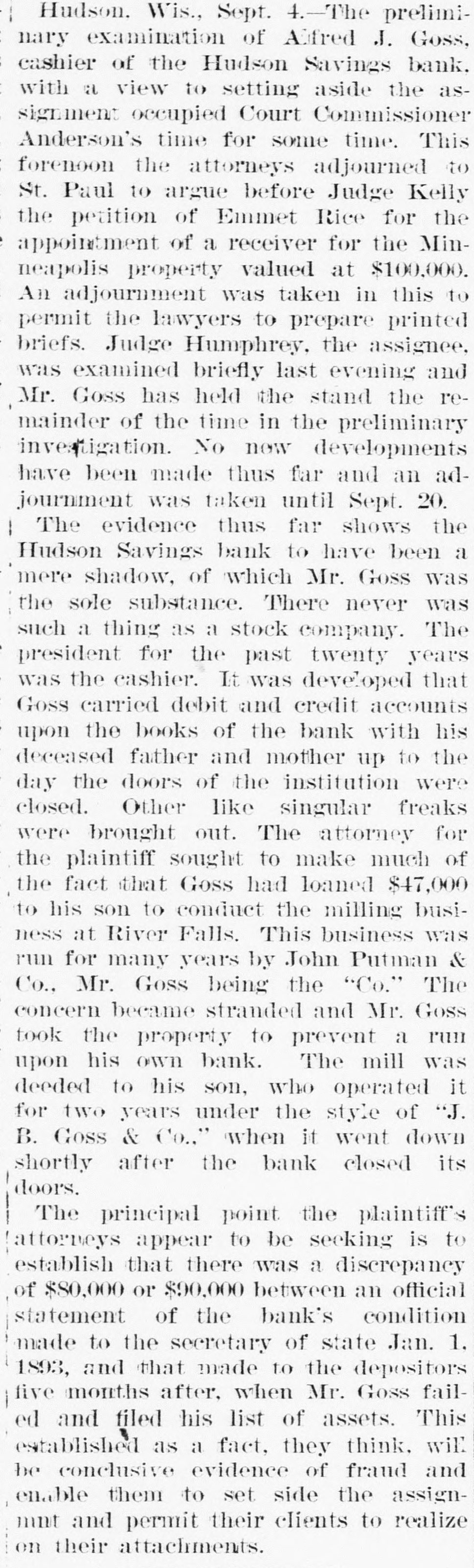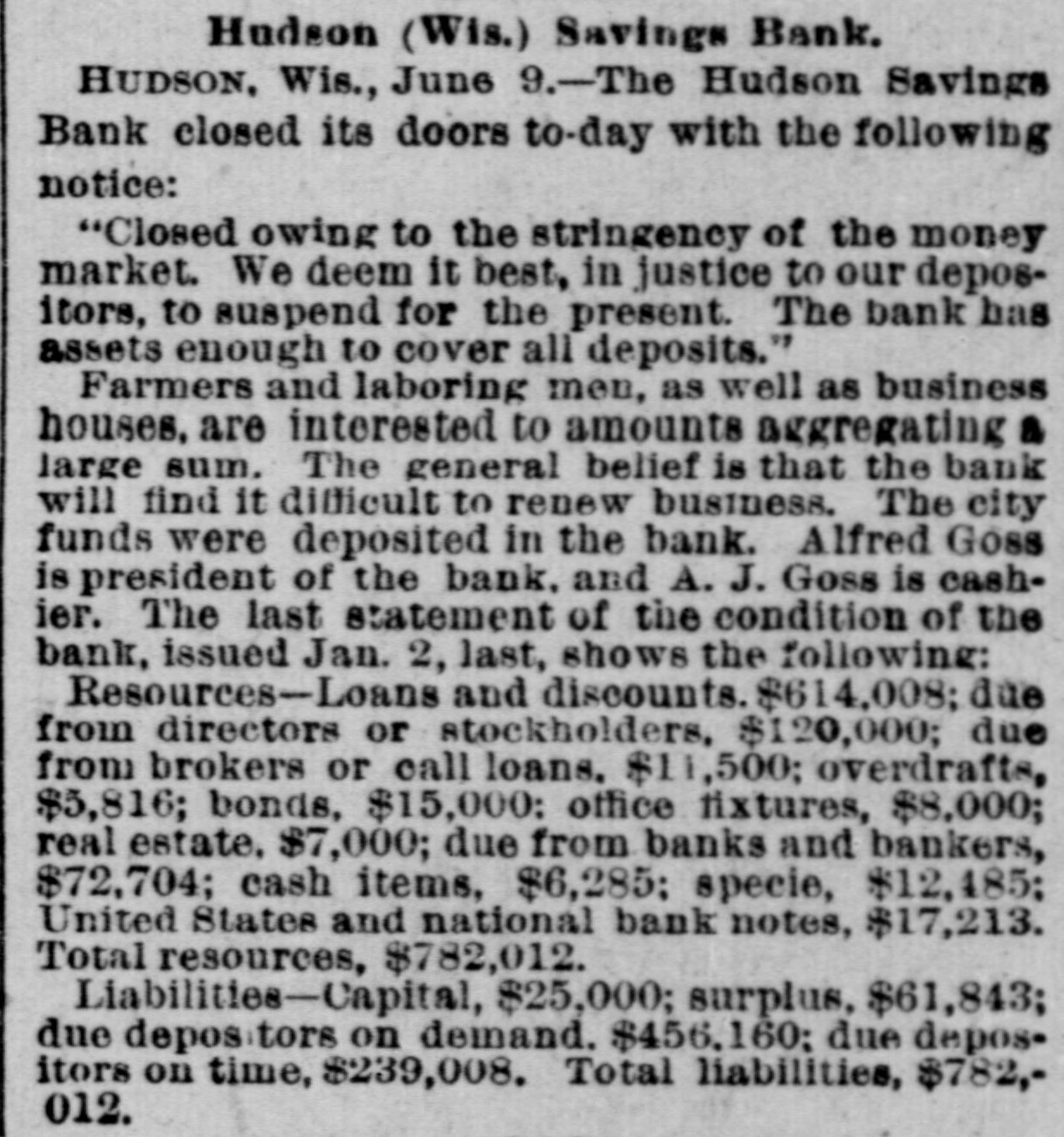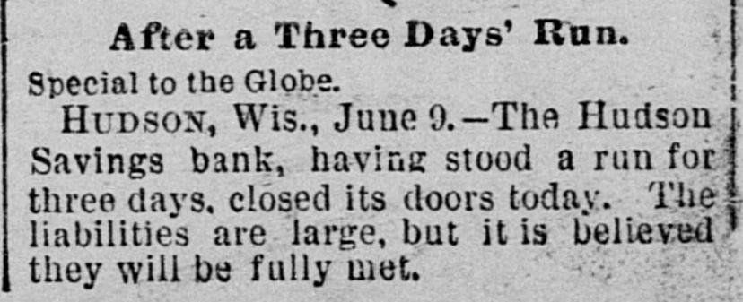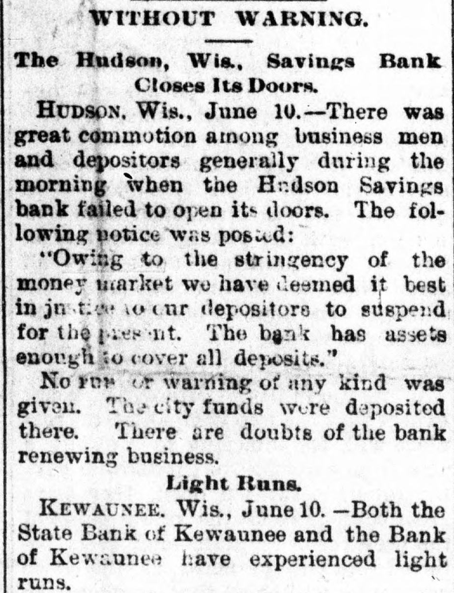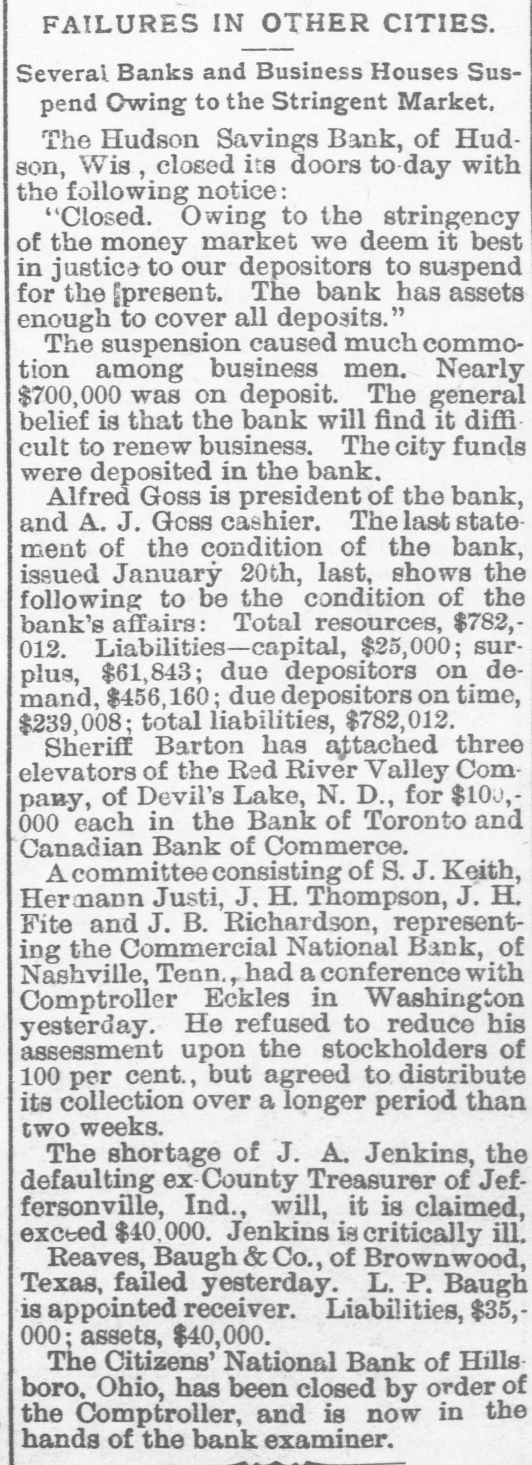 EMBARRASSED BANKS. MANY PRIVATE INSTITUTIONS SUSPEND PAYMENT. A Big Montana Banking House in Dimculties-A Failure at Ellensburg, Wash.-Several Chicago Concorns Close Doors. MISSOULA, Mont., June 9.-C.P.Higgins' Western bank closed its doors at noor today, displaying a formal notice of suspension. This is a private concern and no statement has been obtained at present. Stringency in the money market and threatened litigation precipitated the collapse. It was the depository for county and city funds to the extent of about $80,000, the bank owns large land intereste. Its Encorporators From these lands and improvements they expect to realize more than double the amount required for liquidation when business will be resumed. Several emali business firms are affected by the failure. ELLENSBURG, Wash., June 9.-A notice was posted on the doors of the banking house of Ben E. Snipes & Co. this morning that the bank had temporarily suepended, owing to heavy withdrawals of deposite and inability to realize on securities amply sufficient to pay five dollars for one of indebtedness. A run on the branch bank at Roslyn yesterday precipitated the closing of the parent bank in this city. There is no excitement over the suspension. ALTON, Ill., June 9.-The bank of J. E. Hyattat Gillespie failed today. From information received here it seem a run has been in progress for several days, and this caused the failare. Details have not been learned. CHICAGO, June 9.-Jernberg, Griffin & Co., private bankers, have failed. Liabilities, $20,000; assets, $24,000. Jernberg, as real estate dealer, has also failed, with assets of $200,000; liabilities, $150,000. HUDSON, Wis., June 9.-The Hudson Savings bank closed its doors today. A note on the door saye the closing is temporary, owing to the monetary stringency, and that the bank has enough assets to cover all deposits. The bank had nearly $700,000 on deposit, and the failure created great commotion among business men. Farmers and laboring men will suffer severely. The city: funds are deposited in the bank. The general belief is the bank will find it difficult to resume. CHICAGO, June 9.-Joseph Higgins, a private banker, with branch banks in Illinois, failed this morning; assets, $50,000; liabilities not given. He has branches at Mascoutah, Serento, Gillespie and St. Ann. The assignment covers all. FLORENCE, Ala., June 9.-The Triscumbia Banking company closed its doors this morning. No statement was made. NEW ORLEANS, June9.-The Louisiana Cypress Lumber company is in the hands of a receiver, the result of the depression in the money market. A euit was filed by William S. Hopetra of Muskegon, Mich., to recover $311,431 due on notes. The assets of the company are nominally $300,000; indebtedness probably $200,000. GALVESTON, Tex., June 9.-The Texas Trading company, a wholesale and retail establishment, has made an assignment to W. H. Dorland; assets $163,000, liabilities $180,800. NEW YORK, June 9.-E.1 F. Sanford & Co., jewelers, assigned; liabilities $150,000, assets $100,000. New YORK, June 9.-Judge McAdam has appointed Fabiua M. Clark and Dr. Henry T. Cutter receivers of the Casino.