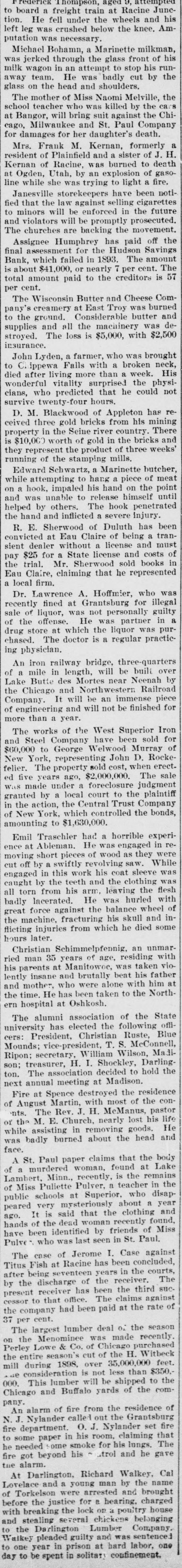 H. C. Renke has been appointed postmaster at Wells, vice R. C. Renke, resigned. John Lauermann, a resident of Fox Lake, has fallen heir to $2,500 left to him in Germany. In a runaway at Bloomington Mr. was cut head Lyness severely about the and shoulders. While working in a sawmill at WoneWOC Charles Eaton of Marion fell on the saw and was killed. The W. W. Cargill company of La Crosse has closed a contract to build a 20,000-bushel elevator at Seymour. Joseph Rondeau, a brakeman on the St. Paul road, whose home was in Marinette, was run over by the cars at St. Paul and killed. August Marunde, a brakeman on the Northwestern road, fell under a train near Appleton and was probably fatally injured. The salaries of city officials of Superior have not been paid for the months, been fund for that purpose having exhausted. The La Crosse Carriage Company has filed articles to succeed the La Crosse Wallis Carriage Company. The capital stock is $25,000. The Seventh Day Advent Society of Baraboo have withdrawn all their children from the public schools and started an institution of their own. a farmer, was Edward Paten, Claire assault- and ed while returning from Eau knocked insensible. He was then robbed of $25 and left in the road. Malchow, aged 3, of Menasha, over a pot of on tipped Minna boiling coffee that there her head and was so badly scalded is little hope of her recovery. William McGee of Antigo captured a in a rabbit trap. The bird about twenty black weighs eagle pounds, from and meas- tip LTCS seven feet three inches to tip of its wings. Frederick Thompson, aged 9, attempted board a freight train at Racine JuneHe fell under the left was crushed below the to tion. leg wheels knee. and Am- his putation was necessary. Michael Bohamn, a Marinette milkman, his through the glass front of in an attempt to stop run- the milk was jerked wagon his by away team. He was badly cut glass on the head and shoulders. The mother of Miss Naomi Melville, the school teacher who was killed by the Chi- cars Bangor, will bring suit against the at Milwaukee and St. Paul Company for cago, damages for her daughter's death. M. Kernan, formerly a of Plainfield and a sister of Racine, was burned to Utah, by an fire. at line she was trying to a Kernan resident Mrs. Ogden, while Frank explosion light of of death J. gaso- noti- H. Janesville storekeepers have been that the law against selling cigarettes future fied minors will be enforced in the to violators will be promptly prosecuted. The and churches are backing the movement. the Assignee Humphrey has paid Savings off assessment for the Hudson amount final which failed in 1893. The The Bank, about $41,000. or nearly 7 per cent. is 57 is total amount paid to the creditors per cent. Wisconsin Butter and Cheese burned ComThe creamery at East Troy was butter and pany's the ground. Considerable was deto and all the machinery $2,500 supplies stroyed. The loss is $5,000, with insurance. John Lyden, a farmer, who was brought neck, Chippewa Falls with a broken week. His to after living more than a physidied vitality surprised the could not wonderful cians, who predicted that he survive twenty-four hours. M. Blackwood of Appleton has mining reD. three gold bricks from his There ceived in the Seine river country. bricks and property $10,000 worth of gold in the weeks' is represent the product mills. of three running they of the stamping Edward Schwartz, a Marinette butcher, of meat attempting to hang a piece the point while impaled his hand on until on a unable to release and was hook, himself penetrated by others. The hook injury. helped the hand and inflicted a severe E. Sherwocd of Duluth has tran- been R. at Eau Claire of being and a must convicted dealer without a license costs sient $25 for a State license and books of in pay Mr. Sherwood sold Eau the trial. Claire, claiming that he represented a local firm. Lawrence A. Hoffmier, for who illegal was Dr. fined at Grantsburg guilty recently liquor, was not personally in a sale of offense. He was partner of the at which the liquor was practic- purdrug chased. store The doctor is a regular ing physician. iron railway bridge, three-quarters built over An mile in length, will be Neenah by of a Butte des Mortes near Railroad Lake Chicago and Northwestern piece the It will be an immense for of Company. engineering and will not be finished more than a year. t works of the West Superior Iron for f The Steel Company have been Murray sold of S and to George Welwood Rocke$60,000 York, representing John when D. erectNew The property sold cost, sale feller. ed five years ago, $2,000,000. indamont The