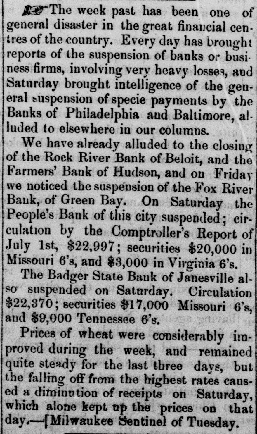 Financial Matters. As the condition of the money market in New York and Philadelphia, regulates to a Considerable extent that of the balance of the country, the following condensed state. ment we clip from the New York Times of the 26th FRIDAY, Sept. 25-P. M. The business day in Wall street was'one of the most unsettled of the present panic season. The trouble, however, was mainly. if not wholly, a reflected one, creating at once a pause in all pending money negotiations, and unfixing public opinion as to the course and probable future bearings of the financial storm. The transactions at Bank went on satisfactorily, the exchanges through the Clearing House smoothly, and there were no additional failures, as far as we are advised, up to 4 o'clock, among our own merchants. The offerings at most of the large banks that held their discount ses sions this morning, denoted less pressure among their ordinary dealers than last week. At an early hour came the first news by telegraph of the Bank suspensions in Philadelphia, still leaving the extent and duration of the heavy trial which has fallen to that city in doubt. It was previously surmised in particular quarters, that the crash among the old domestic commission and job bing firms, whose heaviest sales are distribbuted to the most solvent States in the Southwest, from which no general complaint of backward collections had been heard could not have been produced without the agency of some important, though until today, hidden local cause of weakness. There were even confidential hints thrown out of Bank trouble by parties who had recently made direct inquiry on the subject but the public here were not prepared for the simultaneous explosion of the Bank of Pennsylvania, Girard Bank, and Commer cial Bank, with an aggregate capital of four millions of dollars, and it would be affectation to attempt to conceal the profound sen sation which the news created in a Street somewhat used of late to unpleasant excitements of the sort. It is not surprising, therefore, that the question as to the effect all over the country, should at once suggest itself, and that Stocks should have lost the whole improvement of the past day or two. under the doubt and apprehension as to its solution. The same feeling produced hesi tation in the purchase of mercantile bills outside of Bank though, happily, there was less eagerness to press sales, owing to the rather more quieting accounts which came this morning from the East. We make no change in the quotation of rates, as. when transactions were made at all. they were on prime bills at the currency of Thurs day, say 18a24 per cent. The Bank of Pennsylvania is an institution of sixty years' standing. It was the transfer agent and one of the treasury depositories of the Commonwealth. The capital $1,875,000. Until late years it was under Quaker management. It had its trou bles in the United States Bank panies of 1837 39-41, but rapidly recovered after 1833, when the Commonwealth resumed payment upon the public debt. The circulation was usually about $800.020. The Girard Bank had a capital of $1,250,000, reduced to thissum after the great break-up of the United States Bank, with which it was unfortunately connected in its Missis sippi, Texas and local Post Note operations, from 1837 to 1842. The circulation about $470.000. The Commercial Bank of Penn sylvania isan old institution. with $1,000,000 of capital; never had serious trouble before, and managed for a great many years with extreme prudence by Mr. James Dundas, who left about the year 1846 or 1847. The circulation $260,000. As a further indication of the market in New York, we copy the following paragraph: The Stock Market. which had shown eviden ces of reaction. and had brought forward some few speculative buyers, earlier in the week flattened out to-day, and closed under depres sion New York Central. 65$: Erie 16: Reading 374; Illinois Central, 89; New York Central, 54 Michigan Southern, 19: La Crosse, 8: Galena, 67; Toledo, 33; Virginias, 841 Missouri, 70: THE nois Central Bonds, 833: and New York Central Sixes, 741. On Saturday the Peoples' Bank of Mil waukee, and the Badger State Bank of Janesville suspended. Both these Banks will resume as soon as the pressure is over and have considerable assets over liabilities. The other W isconsin Banks which have