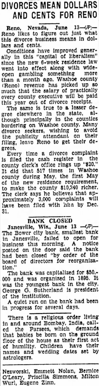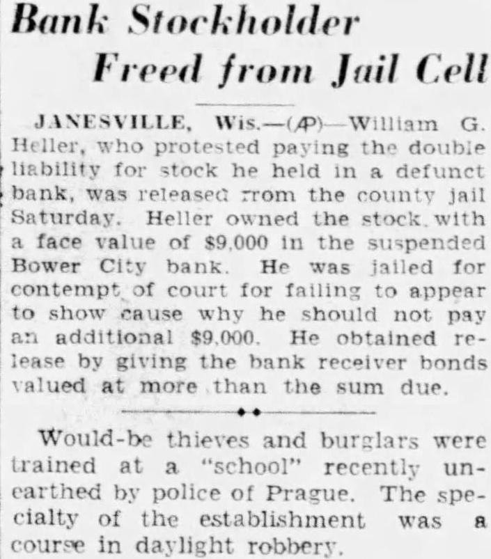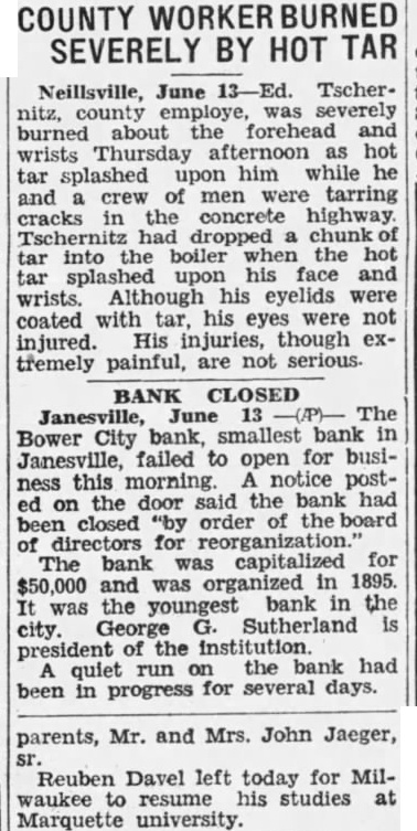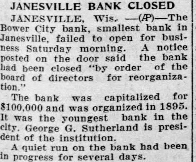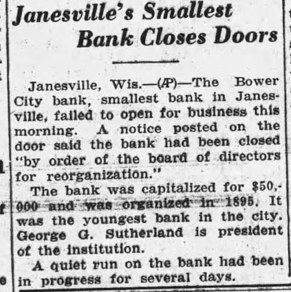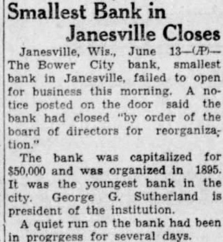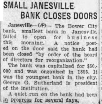 Janesville-The Bower City bank, smallest bank here, failed to open its doors on June 13. There had been a quiet run on the bank for several days.