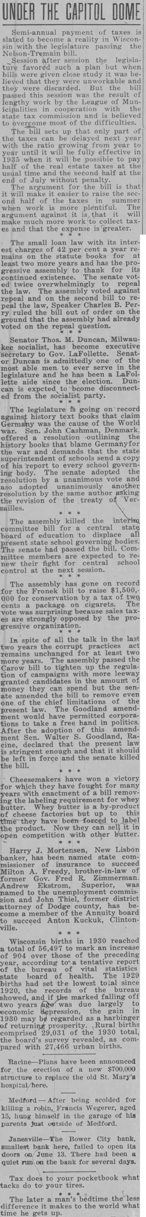 Semi-annual payment of taxes is slated to become reality in Wisconsin with the legislature passing the Nelson-Tremain bill. Session after session the legislature favored such a plan but when bills were given close study it was believed that they were unworkable and they were discarded. But the bill passed this session was the result of lengthy work by the League of Municipalities in cooperation with the state tax commission and is believed to overcome most of the difficulties. The bill sets up that only part of the taxes can be delayed next year with the ratio growing from year to year until it will be fully effective in 1935 when it will be possible to pay half of the real estate taxes at the usual time and the second half at the end of July without penalty. The argument for the bill is that it will make it easier to raise the second half of the taxes in summer when work is more plentiful. The argument against it is that it will make much more work to collect taxes and that the expense is greater.