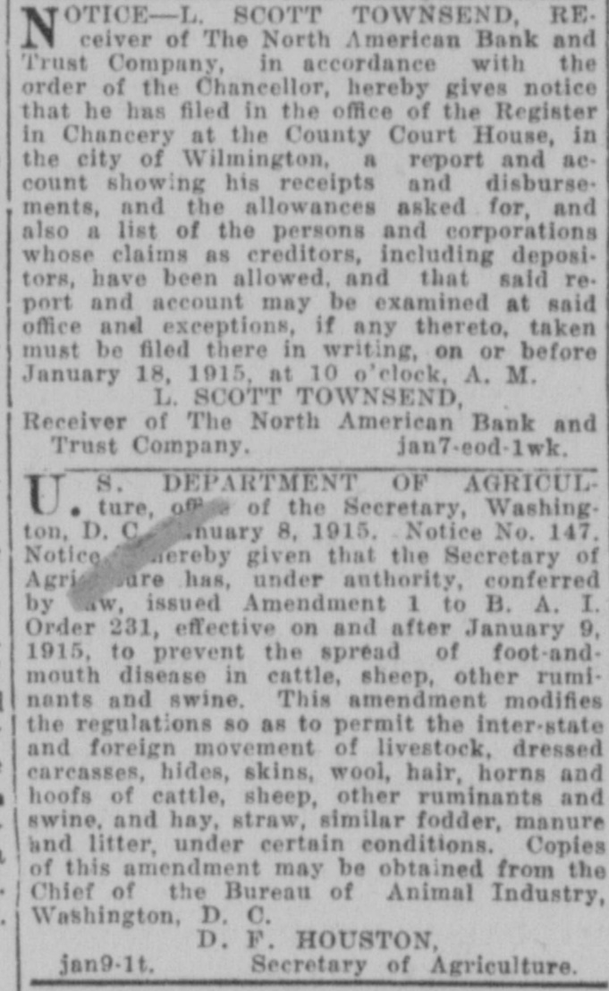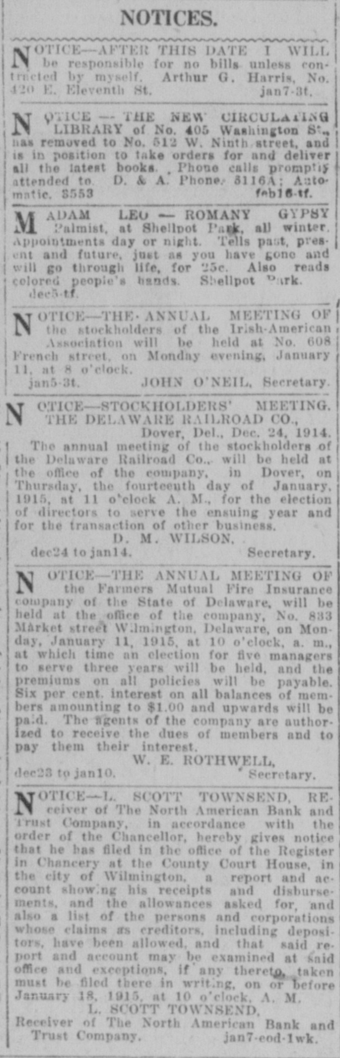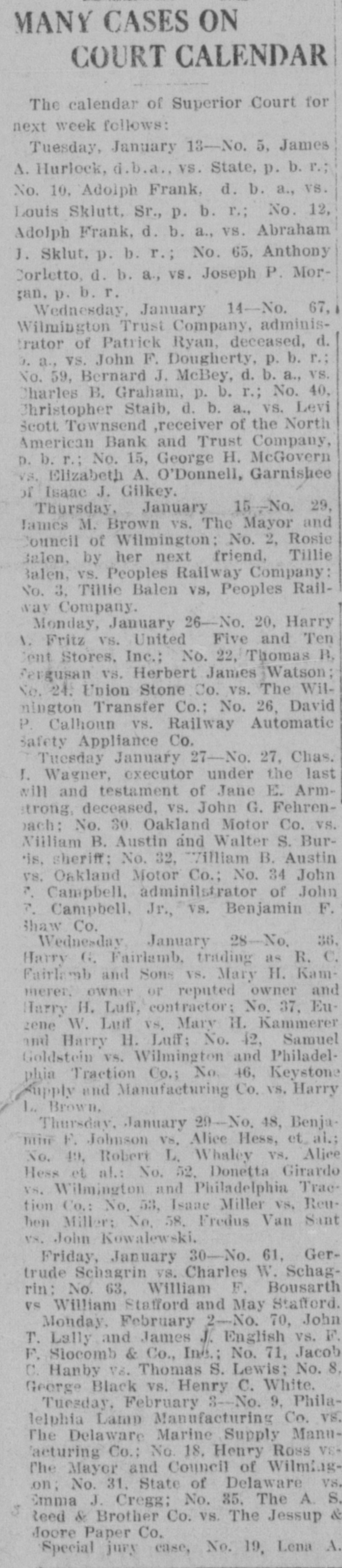 MANY CASES ON COURT CALENDAR The calendar of Superior Court for next week follows: Tuesday, January 13-No. 5, James A. Hurlock, d.b.a., vs. State, p. b. Γ.; No. 10. Adolph Frank. d. b. a., vs. Louis Sklutt, Sr., p. b. Γ.; No. 12, Adolph Frank, d. b. a., vs. Abraham J. Sklut, p. b. Γ.; No. 65, Anthony Corletto, d. b. a., vs. Joseph P. Morgan, p. b. Γ. Wednesday, January 14-No. 67, Wilmington Trust Company, administrator of Patrick Ryan, deceased, d. 1. a., vs. John F. Dougherty, p. b. Γ.; No. 59, Bernard J. McBey, d. b. a., vs. Charles B. Graham, p. b. Γ.; No. 40, Christopher Staib, d. b. a., vs. Levi Scott Townsend ,receiver of the North American Bank and Trust Company, D. b. Γ.; No. 15, George H. McGovern vs. Elizabeth A. O'Donnell, Garnishee of Isaac J. Gilkey. Thursday, January 15 No. 29, James M. Brown vs. The Mayor and Council of Wilmington; No. 2, Rosie Balen, by her next friend, Tillie Balen, vs. Peoples Railway Company: No. 3. Tillie Balen vs, Peoples Railway Company. Monday, January 26-No. 20, Harry 1. Fritz vs. United Five and Ten lent Stores, Inc.: No. 22, Thomas P, Fergusan VS. Herbert James Watson; No. 24. Union Stone Co. vs. The Wilnington Transfer Co.: No. 26, David P. Calhoun vs. Railway Automatic Safety Appliance Co. Tuesday January 27-No. 27, Chas. I. Wagner, executor under the last will and testament of Jane E. Armstrong, deceased, vs. John G. Fehreneach: No. 30 Oakland Motor Co. vs. Villiam B. Austin and Walter S. Buris, sheriff; No. 32, William B. Austin vs. Oakland Motor Co.; No. 34 John P. Campbell, adminilstrator of John 7. Campbell, Jr., vs. Benjamin F. Shaw Co. Wednesday January 28-No. 36, Harry G. Fairlamb, trading as R. C. Fairlamb and Sons vs. Mary H. Kammerer. owner or reputed owner and Harry H. Luff, contractor: No. 37. Eugene W. Luff vs, Mary H. Kammerer and Harry H. Luff: No. 12, Samuel Goldstein vs. Wilmington and Philadelphia Traction Co.; No. 46, Keystone supply and Manufacturing Co. vs. Harry L. Brown, Thursday, January 29-No. 48, Benjamine F. Johnson vs, Alice Hess, et, al.; No. 19, Robert L. Whaley vs. Alice Hess et al.: No. 52. Donetta Girardo vs. Wilmington and Philadelphia Traction Co.: No. 53, Isane Miller vs. Reuhen Miller: No. 58, Fredus Van Sant VS. John Kowalewski. Friday, January 30-No. 61, Gertrude Schagrin vs. Charles W. Schagrin: No. 63, William F. Bousarth VS William Stafford and May Stafford. Monday, February 2-No. 70, John T. Lally and James J. English vs. F F. Slocomb & Co., Inc.: No. 71, Jacob C. Hanby VS. Thomas S. Lewis: No. 8 George Black vs. Henry C. White. Tuesday, February 3--No. 9, Philalelphia Lamp Manufacturing Co. VS. The Delaware Marine Supply Manuacturing Co.: No. 18, Henry Ross VS* The Mayor and Council of Wilmingon; No. 31. State of Delaware vs. Emma J. Cregg; No. 35. The A. S. Reed & Brother Co. vs. The Jessup & Moore Paper Co. Special jury case, No. 19, Lena A.