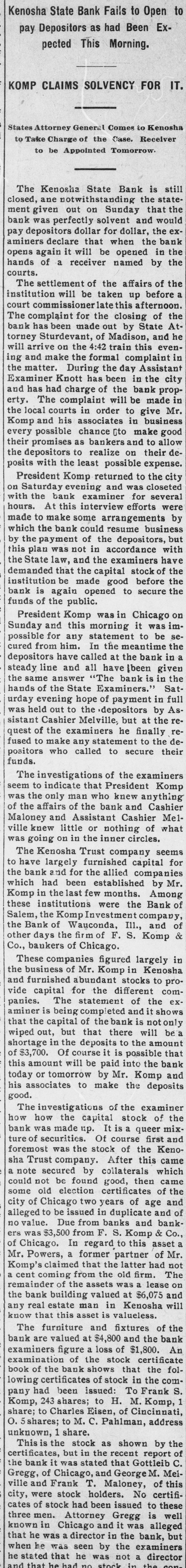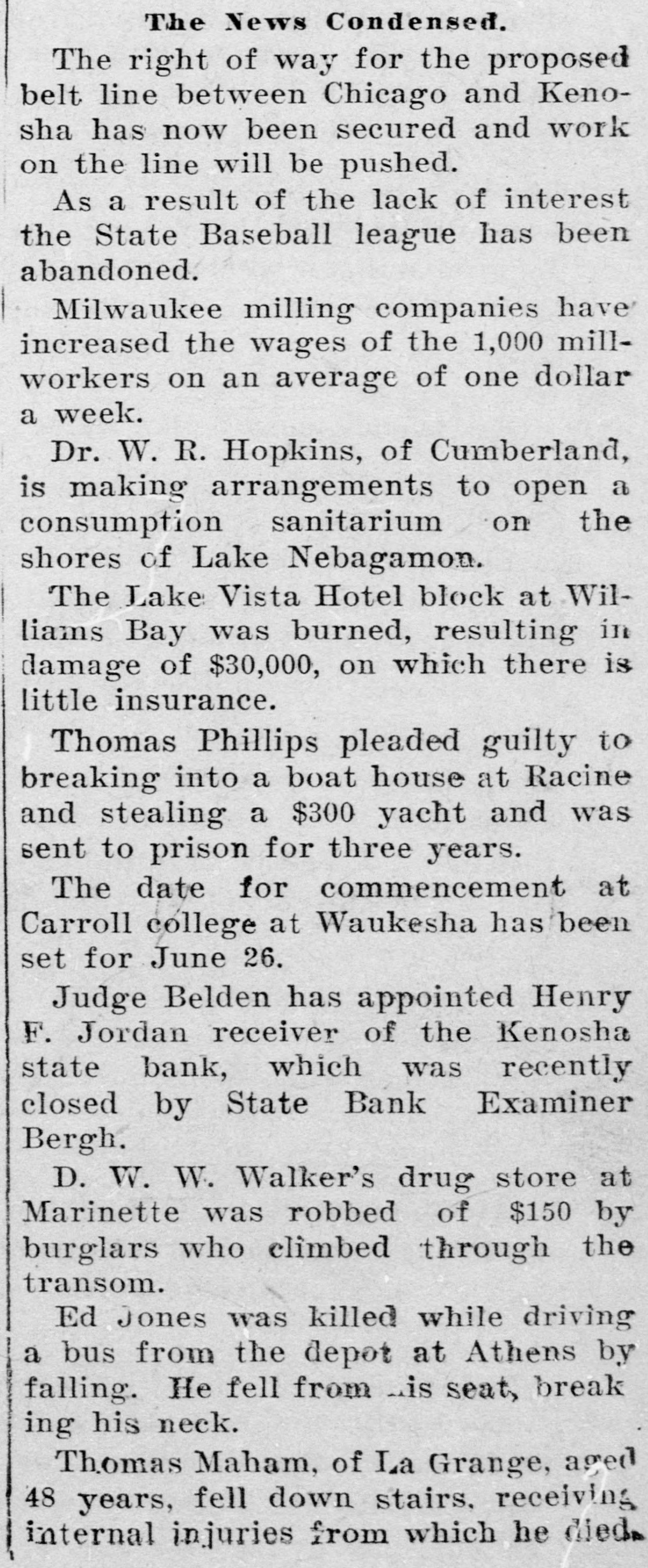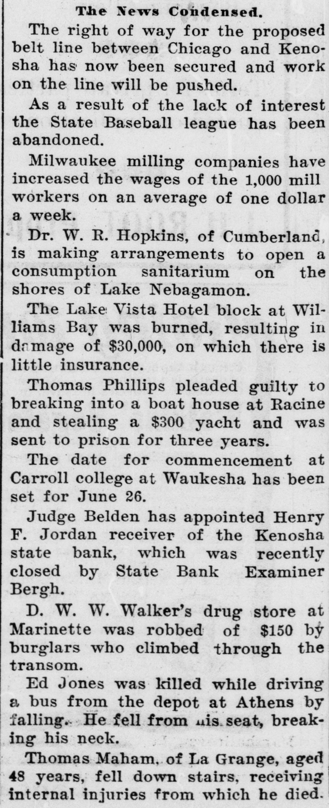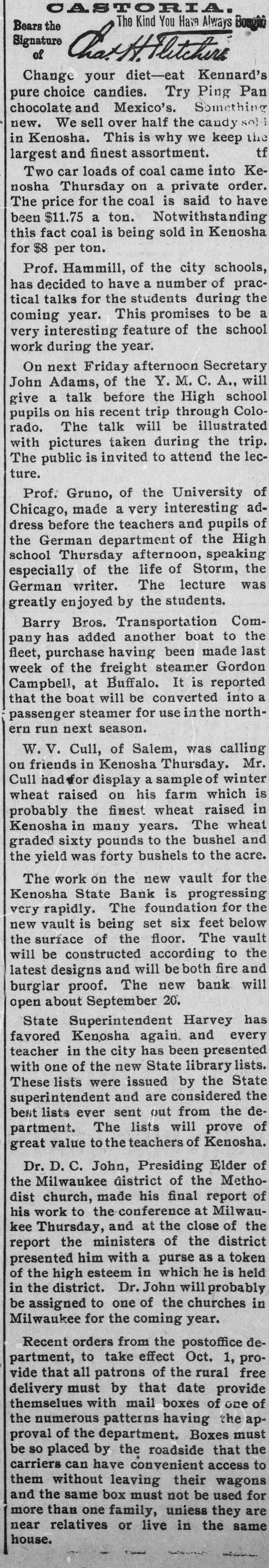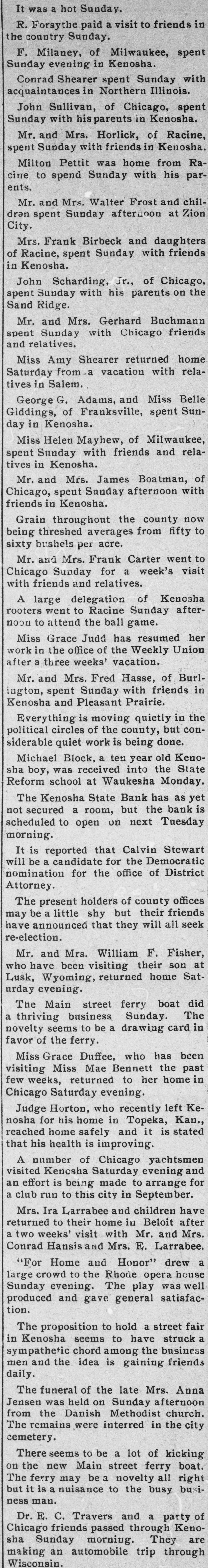 Sunday with sparents in Kenosha. Mr. and Mrs. Horlick, of Racin spent Sunday with friends in Kenosh Milton Pettit was home from R cine to spend Sunday with his pa ents. Mr. and Mrs. Walter Frost and ch dran spent Sunday afternoon at Zio City. Mrs. Frank Birbeck and daughte of Racine, spent Sunday with frien in Kenosha. John Scharding, Jr., of Chicag spent Sunday with his parents on tl Sand Ridge. Mr. and Mrs. Gerhard Buchmar spent Sunday with Chicago frien and relatives. Miss Amy Shearer returned hon Saturday from a vacation with rel tives in Salem. George G. Adams, and Miss Bel Giddings, of Franksville, spent Su day in Kenosha. Miss Helen Mayhew, of Milwauke spent Sunday with friends and rel tives in Kenosha. Mr. and Mrs. James Boatman, Chicago, spent Sunday afternoon wit friends in Kenosha. Grain throughout the county no being threshed averages from fifty sixty bushels per acre. Mr. and Mrs. Frank Carter went Chicago Sunday for a week's vis with friends and relatives. A large delegation of Kenosh rooters went to Racine Sunday afte noon to attend the ball game. Miss Grace Judd has resumed h work in the office of the Weekly Unio after a three weeks' vacation. Mr. and Mrs. Fred Hasse, of Bur ington, spent Sunday with friends Kenosha and Pleasant Prairie. Everything is moving quietly in tl political circles of the county, but CO siderable quiet work is being done. Michael Block, a ten year old Ken sha boy, was received into the Sta Reform school at Waukesha Monda The Kenosha State Bank has as y not secured a room, but the bank scheduled to open on next Tuesda morning. It is reported that Calvin Stewa will be a candidate for the Democrat nomination for the office of District Attorney. The present holders of county office may be a little shy but their friend have announced that they will all see re-election. Mr. and Mrs. William F. Fishe who have been visiting their son a Lusk, Wyoming, returned home Sa urday evening. The Main street ferry boat di a thriving business Sunday. Th novelty seems to be a drawing card i favor of the ferry. Miss Grace Duffee, who has bee visiting Miss Mae Bennett the pas few weeks, returned to her home i Chicago Saturday evening. Judge Horton, who recently left K nosha for his home in Topeka, Kan reached home safely and it is state that his health is improving. A number of Chicago yachtsme visited Kenosha Saturday evening an an effort is being made to arrange f a club run to this city in September. Mrs. Ira Larrabee and children hav returned to their home in Beloit after a two weeks' visit with Mr. and Mr Conrad Hansis and Mrs. E. Larrabe "For Home and Honor" drew large crowd to the Rhode opera hous Sunday evening. The play was we produced and gave general satisfa tion. The proposition to hold a street fa in Kenosha seems to have struck sympathetic chord among the busine: men and the idea is gaining friend daily. The funeral of the late Mrs. Anr Jensen was held on Sunday afternoo from the Danish Methodist churcl The remains were interred in the cit cemetery. There seems to be a lot of kickin on the new Main street ferry boa The ferry may be a novelty all rigl but it is a nuisance to the busy bus ness man.