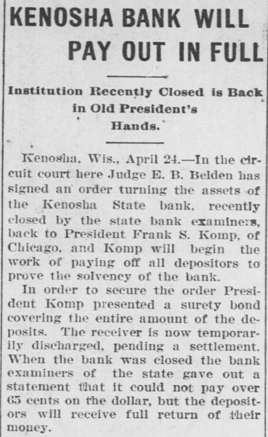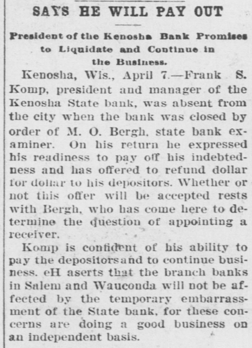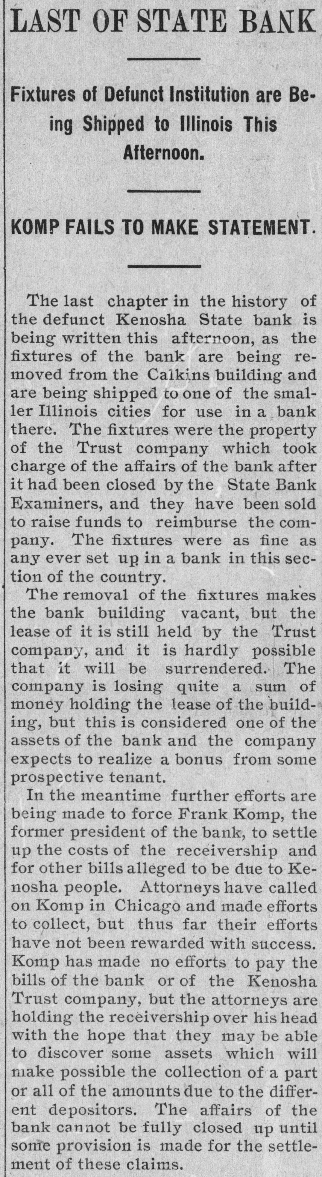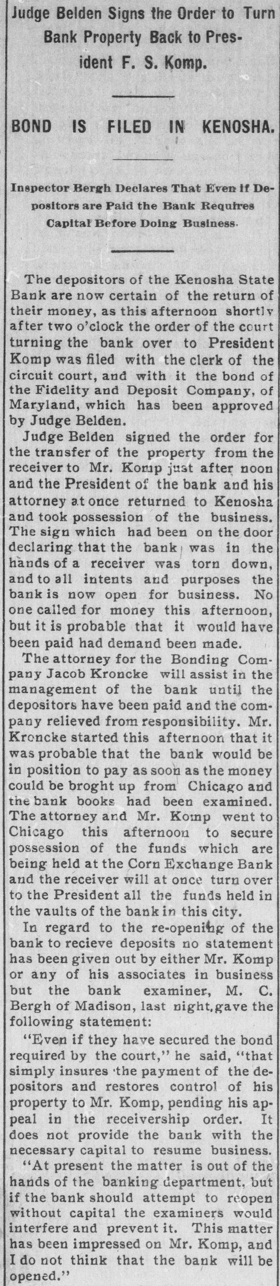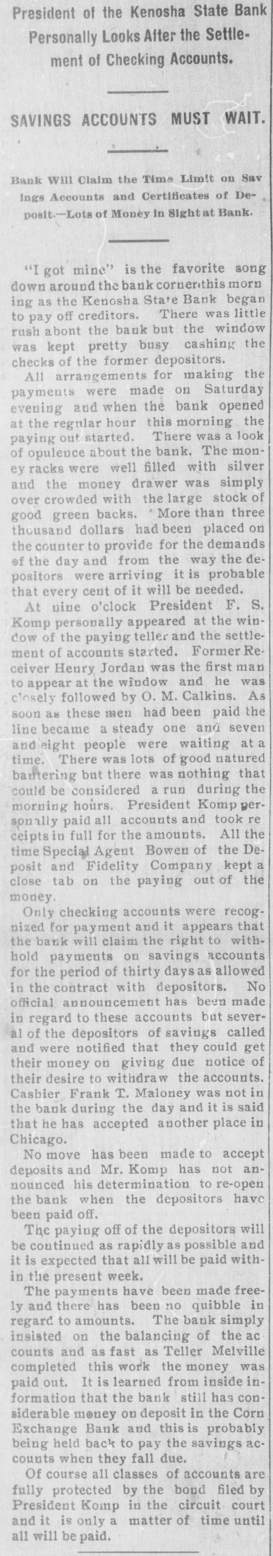 Sunday with sparents in Kenosha. Mr. and Mrs. Horlick, of Racin spent Sunday with friends in Kenosh Milton Pettit was home from R cine to spend Sunday with his pa ents. Mr. and Mrs. Walter Frost and ch dran spent Sunday afternoon at Zio City. Mrs. Frank Birbeck and daughte of Racine, spent Sunday with frien in Kenosha. John Scharding, Jr., of Chicag spent Sunday with his parents on tl Sand Ridge. Mr. and Mrs. Gerhard Buchmar spent Sunday with Chicago frien and relatives. Miss Amy Shearer returned hon Saturday from a vacation with rel tives in Salem. George G. Adams, and Miss Bel Giddings, of Franksville, spent Su day in Kenosha. Miss Helen Mayhew, of Milwauke spent Sunday with friends and rel tives in Kenosha. Mr. and Mrs. James Boatman, Chicago, spent Sunday afternoon wit friends in Kenosha. Grain throughout the county no being threshed averages from fifty sixty bushels per acre. Mr. and Mrs. Frank Carter went Chicago Sunday for a week's vis with friends and relatives. A large delegation of Kenosh rooters went to Racine Sunday afte noon to attend the ball game. Miss Grace Judd has resumed h work in the office of the Weekly Unio after a three weeks' vacation. Mr. and Mrs. Fred Hasse, of Bur ington, spent Sunday with friends Kenosha and Pleasant Prairie. Everything is moving quietly in tl political circles of the county, but CO siderable quiet work is being done. Michael Block, a ten year old Ken sha boy, was received into the Sta Reform school at Waukesha Monda The Kenosha State Bank has as y not secured a room, but the bank scheduled to open on next Tuesda morning. It is reported that Calvin Stewa will be a candidate for the Democrat nomination for the office of District Attorney. The present holders of county office may be a little shy but their friend have announced that they will all see re-election. Mr. and Mrs. William F. Fishe who have been visiting their son a Lusk, Wyoming, returned home Sa urday evening. The Main street ferry boat di a thriving business Sunday. Th novelty seems to be a drawing card i favor of the ferry. Miss Grace Duffee, who has bee visiting Miss Mae Bennett the pas few weeks, returned to her home i Chicago Saturday evening. Judge Horton, who recently left K nosha for his home in Topeka, Kan reached home safely and it is state that his health is improving. A number of Chicago yachtsme visited Kenosha Saturday evening an an effort is being made to arrange f a club run to this city in September. Mrs. Ira Larrabee and children hav returned to their home in Beloit after a two weeks' visit with Mr. and Mr Conrad Hansis and Mrs. E. Larrabe "For Home and Honor" drew large crowd to the Rhode opera hous Sunday evening. The play was we produced and gave general satisfa tion. The proposition to hold a street fa in Kenosha seems to have struck sympathetic chord among the busine: men and the idea is gaining friend daily. The funeral of the late Mrs. Anr Jensen was held on Sunday afternoo from the Danish Methodist churcl The remains were interred in the cit cemetery. There seems to be a lot of kickin on the new Main street ferry boa The ferry may be a novelty all rigl but it is a nuisance to the busy bus ness man.
