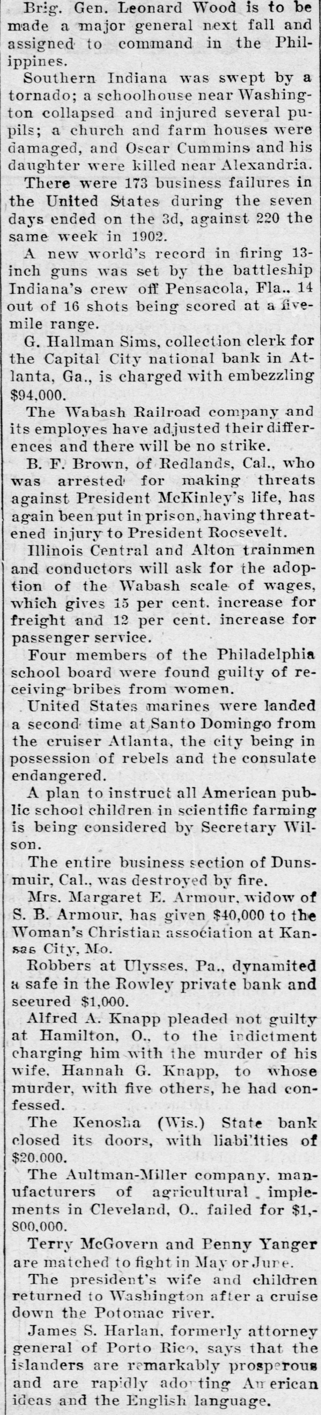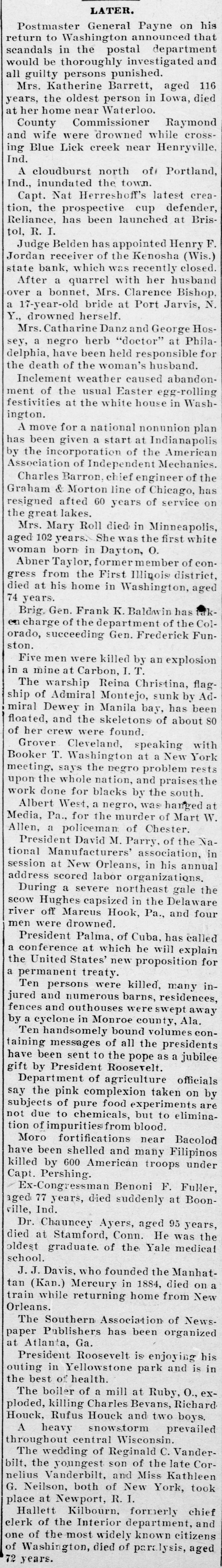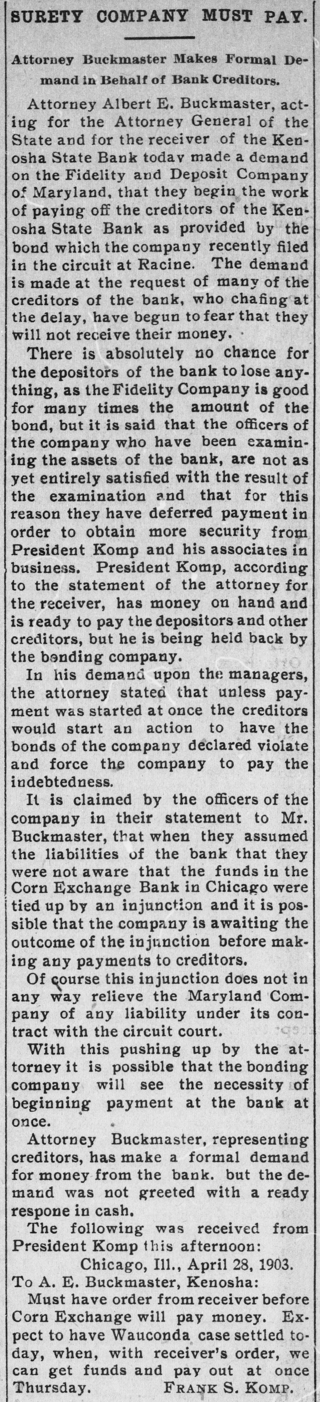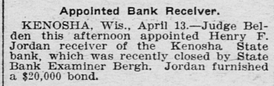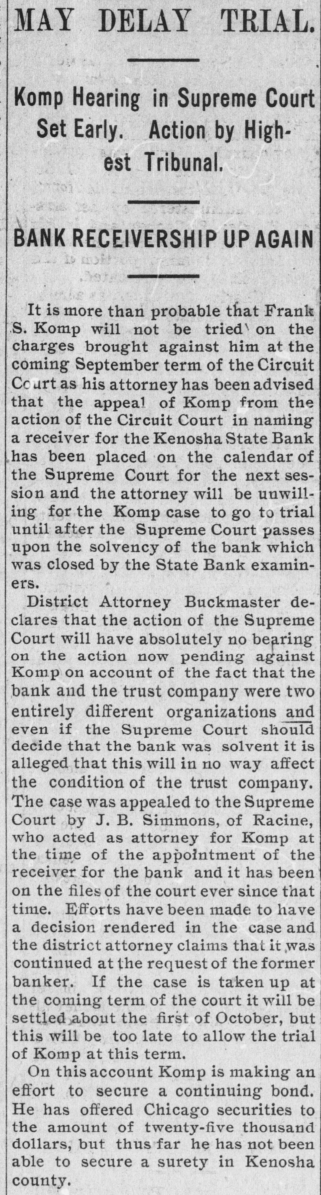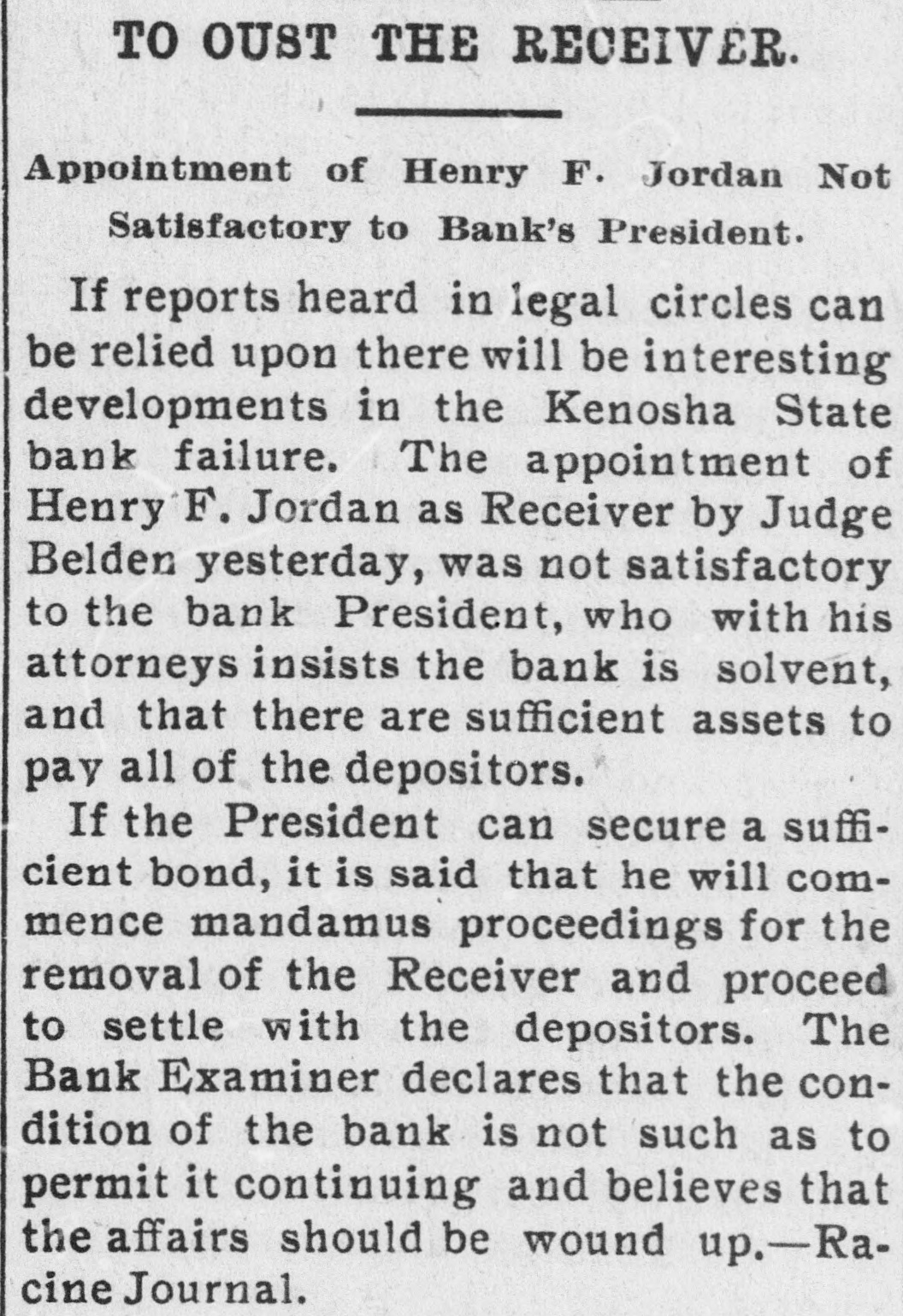 Sunday with sparents in Kenosha. Mr. and Mrs. Horlick, of Racin spent Sunday with friends in Kenosh Milton Pettit was home from R cine to spend Sunday with his pa ents. Mr. and Mrs. Walter Frost and ch dran spent Sunday afternoon at Zio City. Mrs. Frank Birbeck and daughte of Racine, spent Sunday with frien in Kenosha. John Scharding, Jr., of Chicag spent Sunday with his parents on tl Sand Ridge. Mr. and Mrs. Gerhard Buchmar spent Sunday with Chicago frien and relatives. Miss Amy Shearer returned hon Saturday from a vacation with rel tives in Salem. George G. Adams, and Miss Bel Giddings, of Franksville, spent Su day in Kenosha. Miss Helen Mayhew, of Milwauke spent Sunday with friends and rel tives in Kenosha. Mr. and Mrs. James Boatman, Chicago, spent Sunday afternoon wit friends in Kenosha. Grain throughout the county no being threshed averages from fifty sixty bushels per acre. Mr. and Mrs. Frank Carter went Chicago Sunday for a week's vis with friends and relatives. A large delegation of Kenosh rooters went to Racine Sunday afte noon to attend the ball game. Miss Grace Judd has resumed h work in the office of the Weekly Unio after a three weeks' vacation. Mr. and Mrs. Fred Hasse, of Bur ington, spent Sunday with friends Kenosha and Pleasant Prairie. Everything is moving quietly in tl political circles of the county, but CO siderable quiet work is being done. Michael Block, a ten year old Ken sha boy, was received into the Sta Reform school at Waukesha Monda The Kenosha State Bank has as y not secured a room, but the bank scheduled to open on next Tuesda morning. It is reported that Calvin Stewa will be a candidate for the Democrat nomination for the office of District Attorney. The present holders of county office may be a little shy but their friend have announced that they will all see re-election. Mr. and Mrs. William F. Fishe who have been visiting their son a Lusk, Wyoming, returned home Sa urday evening. The Main street ferry boat di a thriving business Sunday. Th novelty seems to be a drawing card i favor of the ferry. Miss Grace Duffee, who has bee visiting Miss Mae Bennett the pas few weeks, returned to her home i Chicago Saturday evening. Judge Horton, who recently left K nosha for his home in Topeka, Kan reached home safely and it is state that his health is improving. A number of Chicago yachtsme visited Kenosha Saturday evening an an effort is being made to arrange f a club run to this city in September. Mrs. Ira Larrabee and children hav returned to their home in Beloit after a two weeks' visit with Mr. and Mr Conrad Hansis and Mrs. E. Larrabe "For Home and Honor" drew large crowd to the Rhode opera hous Sunday evening. The play was we produced and gave general satisfa tion. The proposition to hold a street fa in Kenosha seems to have struck sympathetic chord among the busine: men and the idea is gaining friend daily. The funeral of the late Mrs. Anr Jensen was held on Sunday afternoo from the Danish Methodist churcl The remains were interred in the cit cemetery. There seems to be a lot of kickin on the new Main street ferry boa The ferry may be a novelty all rigl but it is a nuisance to the busy bus ness man.