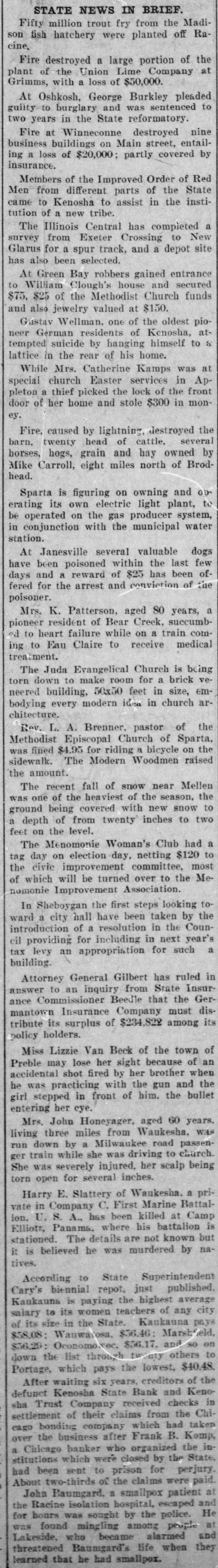 STATE NEWS IN BRIEF. Fifty million trout fry from the Madison fish hatchery were planted off Racine, Fire destroyed a large portion of the plant of the Union Lime Company at Grimms, with a loss of $50,000. At Oshkosh, George Burkley pleaded guilty to burglary and was sentenced to two years in the State reformatory. Fire at Winneconne destroyed nine business buildings on Main street, entailing a loss of $20,000; partly covered by insurance. Members of the Improved Order of Red Men from different parts of the State came to Kenosha to assist in the institution of a new tribe. The Illinois Central has completed a survey from Exeter Crossing to New Glarus for a spur track, and a depot site has also been selected. At Green Bay robbers gained entrance to William Clough's house and secured $75, $25 of the Methodist Church funds and also jewelry valued at $150. Gustav Wellman, one of the oldest pioneer German residents of Kenosha, attempted suicide by hanging himself to & lattice in the rear of his home. While Mrs. Catherine Kamps was at special church Easter services in Appleton a thief picked the lock of the front door of her home and stole $300 in money, Fire, caused by lightning, destroyed the barn. twenty head of cattle, several horses, hogs, grain and hay owned by Mike Carroll, eight miles north of Brodhead. Sparta is figuring on owning and operating its own electric light plant, to be operated on the gas producer system, in conjunction with the municipal water station. At Janesville several valuable dogs have been poisoned within the last few days and a reward of $25 has been offered for the arrest and conviction of the poisoner. Mrs. K. Patterson, aged S0 years, a pioneer resident of Bear Creek, succumbed to heart failure while on a train coming to Eau Claire to receive medical treatment. The Juda Evangelical Church is being torn down to make room for a brick veneered building, 50x50 feet in size, embodying every modern idea in church architecture. Rev. L. A. Brenner. pastor of the Methodist Episcopal Church of Sparta, was fined $4.95 for riding a bicycle on the sidewalk. The Modern Woodmen raised the amount. The recent fall of snow near Mellen was one of the heaviest of the season. the ground being covered with new snow to a depth of from twenty inches to two feet on the level. The Menomonie Woman's Club had a tag day on election day, netting $120 to the civic improvement committee, most of which will be turned over to the Menomonie Improvement Association. In Sheboygan the first steps looking toward a city hall have been taken by the introduction of a resolution in the Council providing for including in next year's tax levy an appropriation for such a building. Attorney General Gilbert has ruled in answer to an inquiry from State Insurance Commissioner Beedle that the Germantown Insurance Company must distribute its surplus of $234,822 among its policy holders. Miss Lizzie Van Beck of the town of Preble may lose her sight because of an accidental shot fired by her brother when he was practicing with the gun and the girl stepped in front of him. the bullet entering her eye. Mrs. John Honeyager, aged 60 years, living three miles from Waukesha. was run down by a Milwaukee road passenger train while she was driving to church. She was severely injured, her scalp being torn open for several inches. Harry E. Slattery of Wankesha. a private in Company C, First Marine Battalion. U. S. A., has been killed at Camp Elliott, Panama, where his battalion is stationed. The details are not known but it is believed he was murdered by natives. According to State Superintendent Cary's biennial repot, just published. Kaukauna is paying the highest average salary to its women teachers of any city of its size in the State. Kaukauna pays $58.08: Wanwatosa, $56.40: Marsh $56.29: Oconomo: rec. $56.17. and so on down the list through tw Qty others to Portage, which pays the lowest, $40.48. After waiting six years, creditors of the defunct Kenosha State Bank and Kenosha Trust Company received checks in settlement of their claims from the Chicago bonding company which had taken over the business after Frank B. Komp, a Chicago banker who organized the institutions which were closed by the State, had been sent to prison for perjury. About two-thirds of the claims were paid. John Baumgard, a smallpox patient at the Racine isolation hospital, escaped and for hours was sought by the police. He was found mingling among people at Lakeside, who became alarmed and threatened Baumgard's life when they learned that he had smallpox.