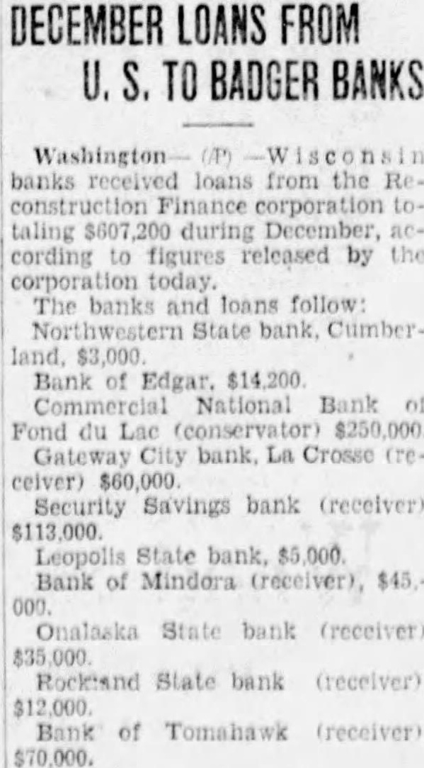 LOANS FROM BADGER banks received loans from the Finance taling during December, cording figures released by today. The banks loans follow State bank Cumber$3,000 Bank of Edgar. $14,200 National Bank Fond du Lac Gateway bank, La Crosse ceiver) Security Savings bank (receiver) Leopolis State Bank of Mindora (receiver), Onalaska bank State bank Bank of Tomahawk $70,000.