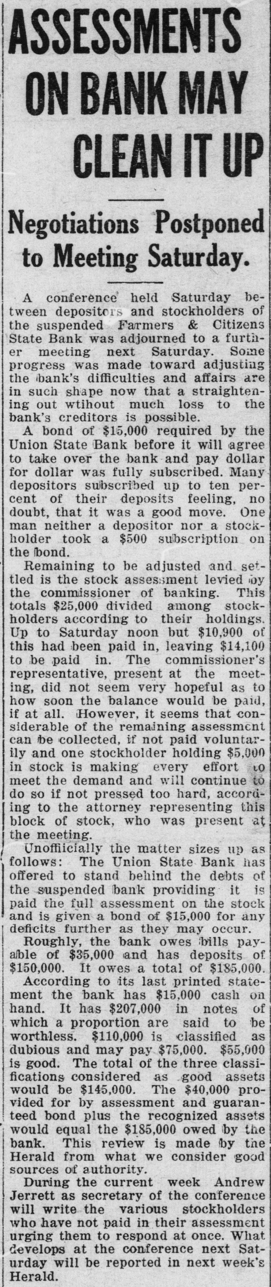 ASSESSMENTS ON BANK MAY CLEAN IT UP Negotiations Postponed to Meeting Saturday. A conference held Saturday between depositors and stockholders of the suspended Farmers & Citizens State Bank was adjourned to a further meeting next Saturday. Some progress was made toward adjusting the bank's difficulties and affairs are in such shape now that a straightening out wtihout much loss to the bank's creditors is possible. A bond of $15,000 required by the Union State Bank before it will agree to take over the bank and pay dollar for dollar was fully subscribed. Many depositors subscribed up to ten percent of their deposits feeling, no doubt, that it was a good move. One man neither a depositor nor a stockholder took a $500 subscription on the bond. Remaining to be adjusted and settled is the stock assessment levied by the commissioner of banking. This totals $25,000 divided among stockholders according to their holdings. Up to Saturday noon but $10,900 of this had been paid in, leaving $14,100 to be paid in. The commissioner's representative, present at the meeting, did not seem very hopeful as to how soon the balance would be paid, if at all. However, it seems that considerable of the remaining assessment can be collected, if not paid voluntarily and one stockholder holding $5,000 in stock is making every effort to meet the demand and will continue to do SO if not pressed too hard, according to the attorney representing this block of stock, who was present at the meeting. Unoffiicially the matter sizes up as follows: The Union State Bank has offered to stand behind the debts of the suspended bank providing it is paid the full assessment on the stock and is given a bond of $15,000 for any deficits further as they may occur. Roughly, the bank owes bills paya/ble of $35,000 and has deposits of $150,000. It owes a total of $185,000. According to its last printed statement the bank has $15,000 cash on hand. It has $207,000 in notes of which a proportion are said to be worthless. $110,000 is classified as dubious and may pay $75,000. $55,000 is good. The total of the three classifications considered as good assets would be $145,000. The $40,000 provided for by assessment and guaranteed bond plus the recognized assets would equal the $185,000 owed by the bank. This review is made by the Herald from what we consider good sources of authority. During the current week Andrew Jerrett as secretary of the conference will write the various stockholders who have not paid in their assessment urging them to respond at once. What develops at the conference next Saturday will be reported in next week's Herald.