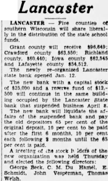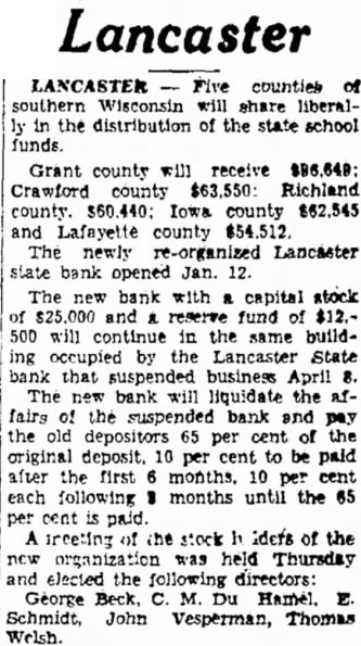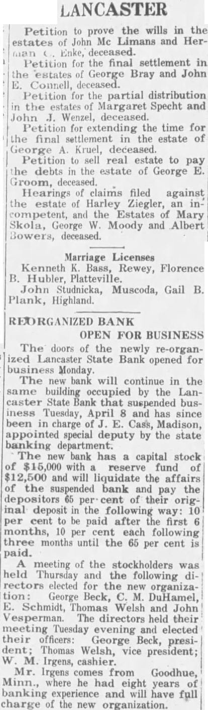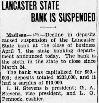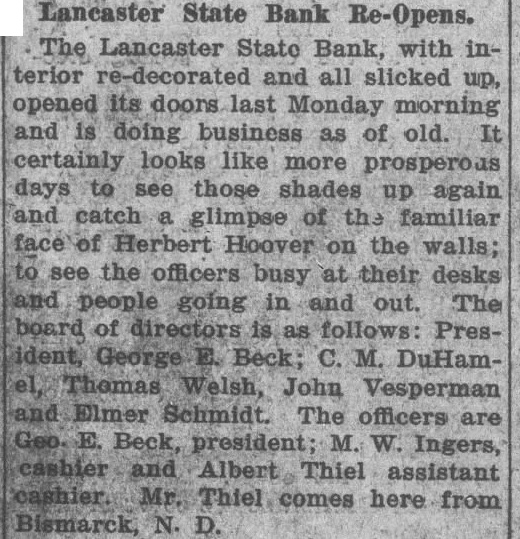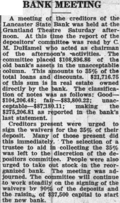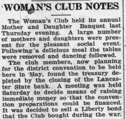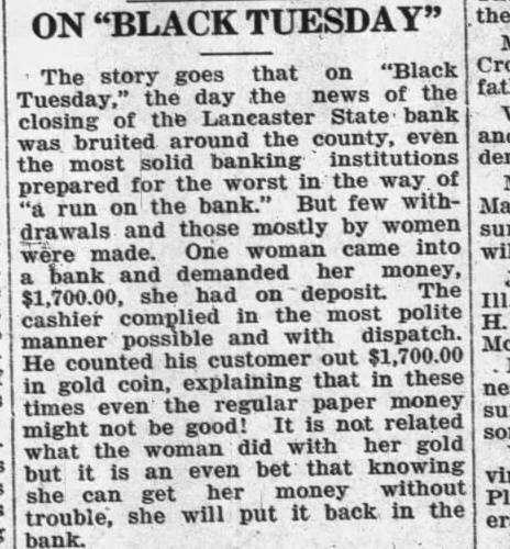 The story goes that on "Black Tuesday, the day of the news of the closing of the Lancaster State bank was bruited around the county, even the most solid banking institutions prepared for the worst the way run on the bank.' But few with drawals and those mostly by women were made. One woman came into bank and demanded her money, $1,700.00, she had on deposit. The cashier complied in the most polite manner possible and with dispatch. He counted his customer out 700.00 in gold coin, explaining that in these times even the regular paper money might not be good! It related what the woman did with her gold but it is an even bet that knowing can get her money without trouble, she will put it back in the bank. Lancaster Herald