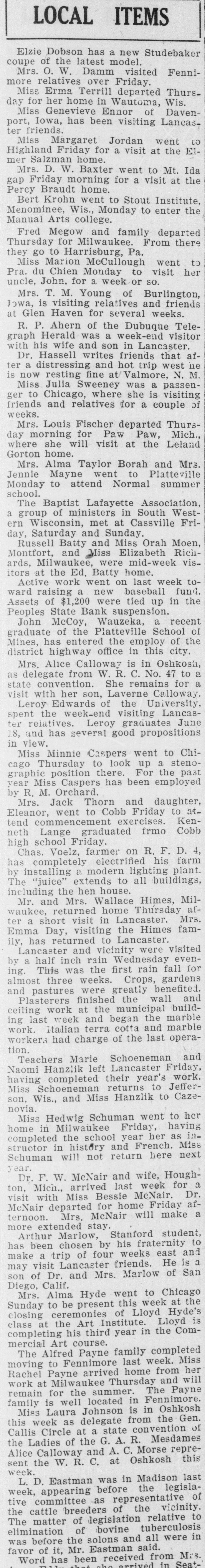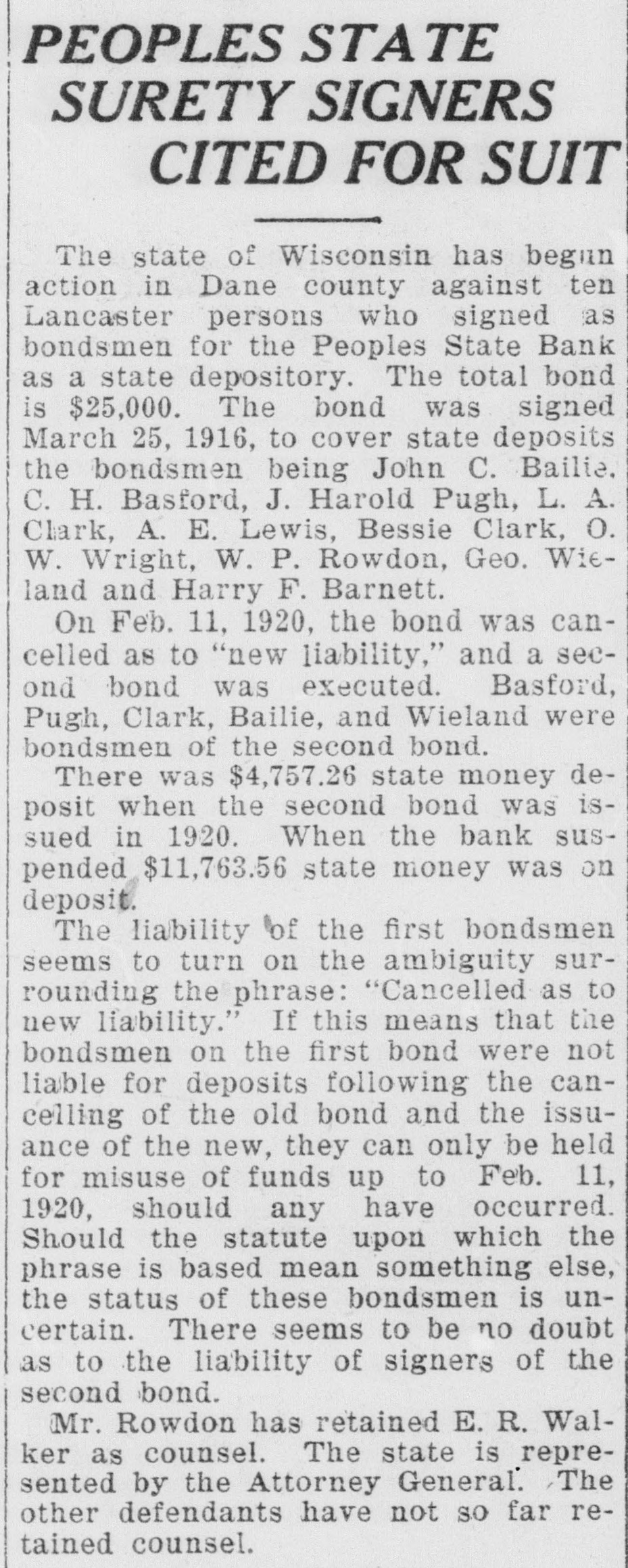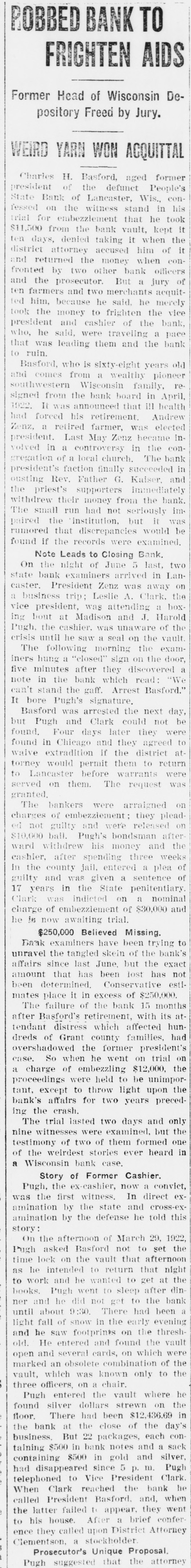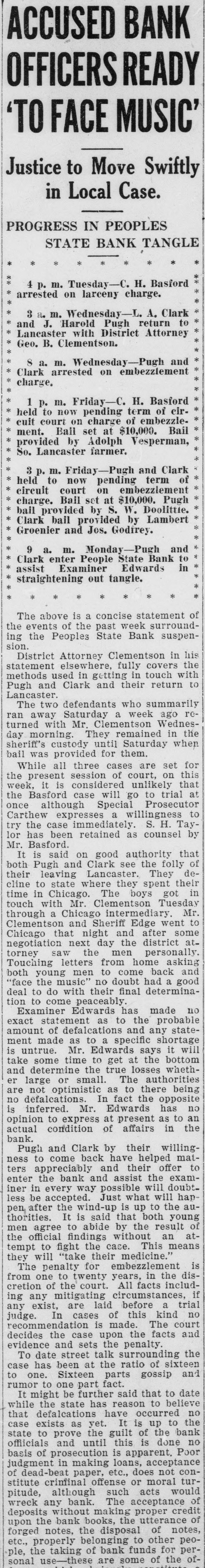 ACCUSED BANK OFFICERS READY 'TO FACE MUSIC' Justice to Move Swiftly in Local Case. PROGRESS IN PEOPLES STATE BANK TANGLE 4 p. m. Tuesday-C. H. Basford arrested on larceny charge. * 3 1. m. Wednesday-L. A. Clark * and J. Harold Pugh return to Lancaster with District Attorney Geo. B. Clementson. * * 8 a. m. Wednesday-Pugh and Clark arrested on embezzlement charge. * * 1 p. m. Friday-C. H. Basford held to now pending term of circuit court on charge of embezzlement. Bail set at $10,000. Bail provided by Adolph Vesperman, * So. Lancaster farmer. * 3 p. m. Friday-Pugh and Clark * held to now pending term of * * circuit court on embezzlement charge. Bail set at $10,000. Pugh bail provided by S. W. Doolittie. Clark bail provided by Lambert Groenier and Jos. Godfrey. * * 9 a. m. Monday-Pugh and Clark enter People State Bank to assist Examiner Edwards in * straightening out tangle. * * The above is a concise statement of the events of the past week surrounding the Peoples State Bank suspension. District Attorney Clementson in his statement elsewhere, fully covers the methods used in getting in touch with Pugh and Clark and their return to Lancaster. The two defendants who summarily ran away Saturday a week ago returned with Mr. Clementson Wednesday morning. They remained in the sheriff's custody until Saturday when bail was provided for them. While all three cases are set for the present session of court, on this week, it is considered unlikely that the Basford case will go to trial at once although Special Prosecutor Carthew expresses a willingness to try the case immediately. S. H. Taylor has been retained as counsel by Mr. Basford. It is said on good authority that both Pugh and Clark see the folly of their leaving Lancaster. They decline to state where they spent their time in Chicago. The boys got in touch with Mr. Clementson Tuesday through a Chicago intermediary. Mr. Clementson and Sheriff Edge went to Chicago that night and after some negotiation next day the district attorney saw the men personally. Touching letters from home asking both young men to come back and "face the music" no doubt had a good deal to do with their final determination to come peaceably. Examiner Edwards has made no exact statement as to the probable amount of defalcations and any statement made as to a specific shortage is untrue. Mr. Edwards says it will take some time to get at the bottom and determine the true losses whether large or small. The authorities are not optimistic as to there being no defalcations. In fact the opposite is inferred. Mr. Edwards has no opinion to express at present as to an actual condition of affairs in the bank. Pugh and Clark by their willingness to come back have helped matters appreciably and their offer to enter the bank and assist the exam-