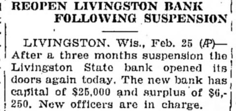 records. Mr. and Mrs. Fred Bullerman and son Neil spent Wednesday afternoon at the home of Mr. and Mrs. L. J. Blahnik, Rostok. Mrs. John Doden, Rostok, spent Tuesday afternoon at the home of Mrs. Minnie Waterstreet. Mrs. Josep hBrozek spent Wednesday morning at Green Bay. LIVINGSTON, Wis. (AP) After a three months suspension, the Livingston State Bank opened its doors again Thursday. The new bank has capital of $25,000 and surplus of $6,250. New officers are in charge.
