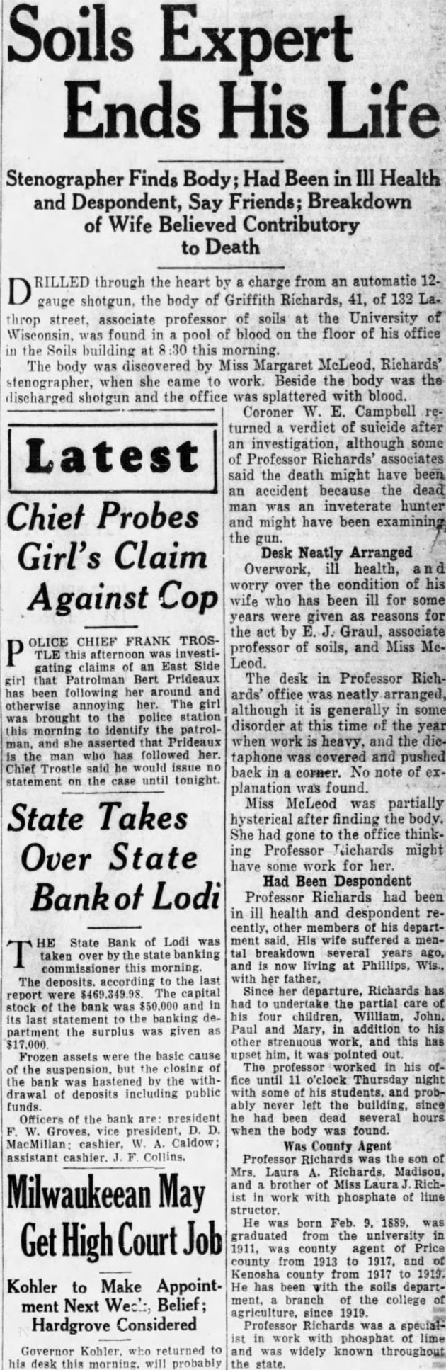 Soils Expert Ends His Life Stenographer Finds Body; Had Been in Ill Health and Despondent, Say Friends; Breakdown of Wife Believed Contributory to Death RILLED through the heart by a charge from an automatic 12D gauge shotgun, the body of Griffith Richards, 41, of 132 Lathrop street, associate professor of soils at the University of Wisconsin, was found in pool of blood on the floor of his office in the Soils building at this morning. The body was discovered by Miss Margaret McLeod, Richards' stenographer, when she came to work. Beside the body was the discharged shotgun and the office was splattered with blood. Coroner W. E. Campbell turned verdict of suicide after an investigation, although some Latest of Professor Richards' associates said the death might have been an accident because the dead man was an inveterate hunter Chief Probes and might have been examining the gun. Girl's Claim Desk Neatly Arranged Overwork, ill health, and worry over the condition of his Against Cop wife who has been ill for some years were given as reasons for the act by E. J. Graul, associate OLICE CHIEF FRANK TROSprofessor of soils, and Miss MeP TLE this afternoon was investiLeod. gating claims of an East Side girl that Patrolman Bert Prideaux The desk in Professor Richbeen following her around and ards' office was neatly arranged, otherwise annoying her. The girl although it is generally in some was brought to the police station disorder at this time of the year this morning to identify the patrolman, and she asserted that Prideaux when work is heavy, and the diethe man who has followed her. taphone was covered and pushed Chief Trostle said would issue no back in a corner. No note of exstatement on the case until tonight. planation was found. Miss McLeod was partially State Takes hysterical after finding the body. She had gone to the office thinking Professor Richards might Over State have some work for her. Had Been Despondent Banko Lodi Professor Richards had been in ill health and despondent recently, other of his departHE State Bank of Lodi was ment said, His wife suffered mentaken over by the state banking tal breakdown several years ago, commissioner this morning. and is now living at Phillips, Wis., with her The deposits. to the last Since her departure, Richards has report were $469,349.98. The capital stock of the bank was $50,000 and in had to undertake the partial care his four children, William, John, its last statement to the banking dePaul and Mary, in addition to his partment the surplus was given as other strenuous work, and this has Frozen assets were the basic cause upset him, was pointed out. The professor worked in his ofof the suspension, but the closing of the bank was hastened by the with- fice until 11 o'clock Thursday night drawal of deposits including public with some of his students. and probfunds. ably never left the building, since Officers of the bank are: president he had been dead several hours W. Groves. vice president, D. D. when the body was found. MacMillan: cashier, W. A. Caldow; Was County Agent assistant cashier. Collins. Professor Richards the son of Mrs. Laura A. Richards, Madison, and brother of Miss Laura RichMilwaukeean May ist in work with phosphate of lime He was born Feb. 9. 1889, was Job graduated from the university in 1911, county agent of Price county from 1913 to 1917, and of Kenosha county from 1917 to 1919. Kohler to Make Appoint- He has been with the soils department, branch of the college of ment Next Wech, Belief; agriculture, since 1919 Hardgrove Considered Professor Richards was specialist in work with phosphat of lime Governor Kohler. who returned to and was widely known throughout his desk this morning. will probably the state.