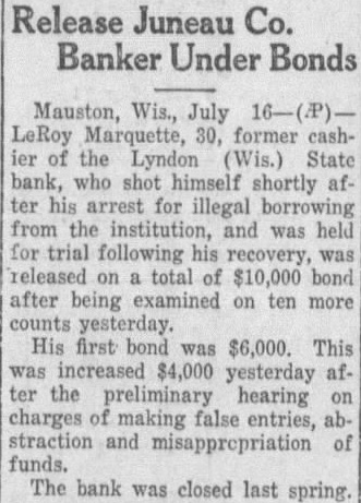 Release Juneau Co. Banker Under Bonds Mauston, LeRoy Marquette, former cashthe Lyndon (Wis.) State bank, who himself shortly af ter arrest for illegal from the institution, and was for trial following recovery, released total bond after being examined on ten more yesterday. His first bond was $6,000. This was increased $4,000 yesterday the preliminary hearing charges making false entries, straction and funds. The bank was closed last spring.