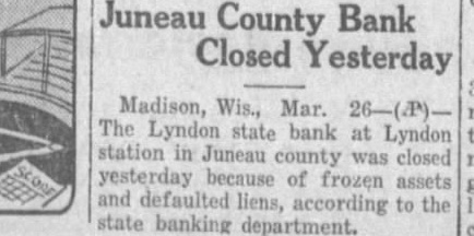 Juneau County Bank Closed Yesterday Madison, Wis., Mar. The Lyndon state bank at Lyndon station Juneau county closed because of frozen defaulted liens, according the banking department.