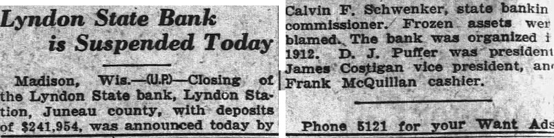 Lyndon State Bank is Suspended Today Madison, Wis.-(U.P)-Closing of the Lyndon State bank, Lyndon Station, Juneau county, with deposits of $241,954, was announced today by Calvin F. Schwenker, state bankin commissioner. Frozen assets wer blamed. The bank was organized 1912. D. J. Puffer was president James Costigan vice president, an Frank McQuillan cashier. Phone 5121 for your Want Ads
