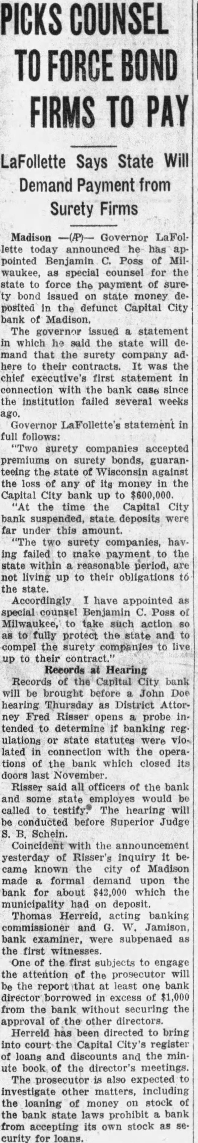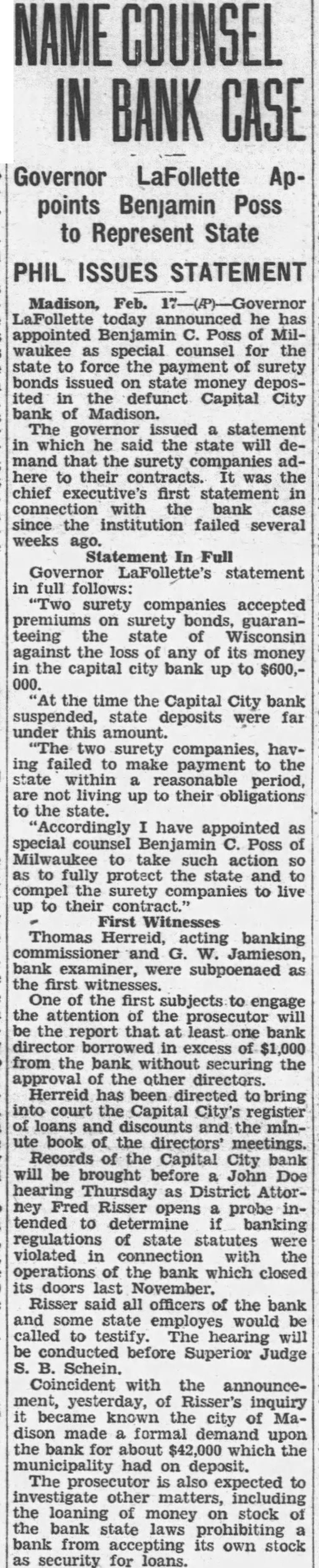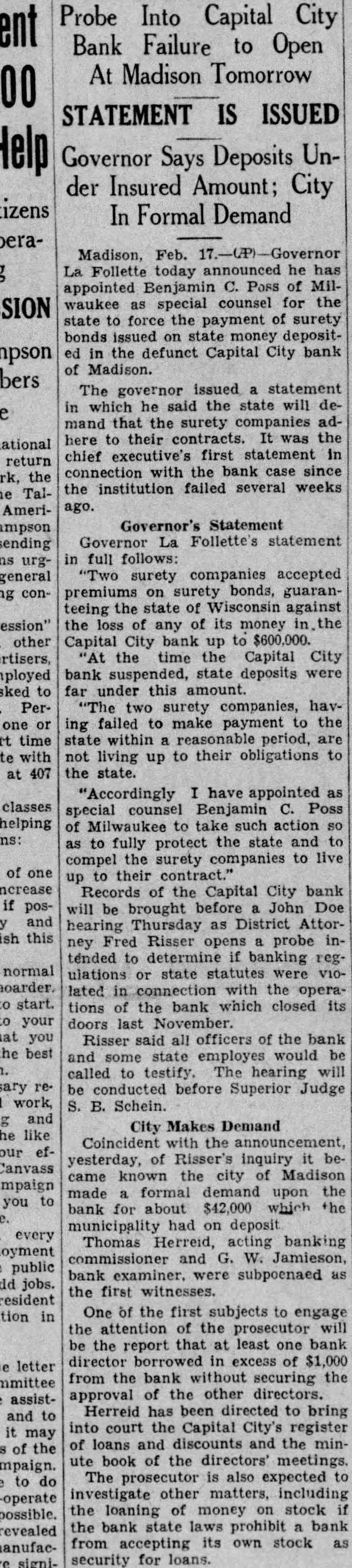 Stoughton body of STOUGHTON. Company's Stoughton Monday salesman bed Hotel dead his found to Anderson's Monday undertaking rooms after Coroner Campbell of had pronatural causes. due to nounced funeral arrangements other made pending the expected arrival on the dead man's Tuesday Johnson. from Bartelsville, Okla. Resumes Rehearsals having enjoyed vacation from November the Stoughcity resumed practicing Monday evening in for the coming open air concert which rule opens carly in June. By starting the period this early to have its repertoire the band expects of pretty well mastered by being held June. The rehearsals are the city hall. Miss Selma Burull spent Sunday in Madison with her niece. Miss Marion Burull employed the office of the Guardian Life Insurance company. Wilson Sun Prairie A. Wilson, who recently resigned manager of the Britting & Hixon Lumber Co.'s local yard. has accepted Chase Bros. lumber and fuel yard Sun Prairie. Mr. Wilson Sun Sunday and entered his new duties Monday. His family will join him after time. Baby Son Dies baby was born Mr. and Mrs. Alvin Everson the local hospital Sunday evening but the infant lived only half hour. It was Mr. and Mrs. an Everson's first child. Welcome Daughter From Edgerton word of the birth baby daughter to Mr. and Mrs. Gordon Voog that city which occurred last Friday at the Memorial hospital. Mrs. Voog was formerly Miss Elcanor Hansen and the younger daughter and Mrs. Elius Hansen this commuinty. This Mr. and Voog's first baby and also Mr. Mrs. first grandchild. Begins Collection City Treasurer Larson went to Monday after the tax receipt books and all set relieve taxpayers of shekels are due the city, Before went to he few payments for which he to be replaced later by the regular forms. Receipt No. made Severt Hellekve. 011 Giles night officer Peter Lee of Lake received No. cn his Turner Park cript No. was made out to John Park Cars Collide Bertram of Mr. and Borrud. his Pontiac Mrs. roadster badly late Saturday evening when Willis Orvold. Utica, also driving Pontiac roadster, crashed into him as was turning into the driveway at the Borrud home just of town Orvold and presumed the latter did the to the left to ahead of him swing car enter Both left fenders. the running board and part the hood Mr. Borrud's car were wrecked and the front axic Mr. Orvold's was damaged. suffer quite said. did not much damage but the front axle was Messrs. and Mmes. Gustav Torgeson, motored and John Quam, down Sunday Torgeson gradually from the effects with his the that Sunday before on Monroe Christmas. Collar Bone Breaks Rockford who man from A young companions was number terrior skating on Lake Kegonsa Sunday forefall in which he bad noon, broke his collarbone. He was Business taken to the Stoughton clinic where his to Drs. Horn FURNACE attended by injury 2336. and Schoenbeck. Celebrates 88th Birthday MACK'S of Sarah The 88th Birthday Rosendahl. old time of Stoughterns today, celewhich occurred brated ton, Sunday with family gathering PAINTING Dunkirk ave., at home 734 the which were present four of her five children and few old friends. din- KARL afternoon was served and the 8219 pleasantly spent in social chat. Besides the son and daughter. Oscar and ChrisLET ME tine live mother. Miss bish: Geda Rosendahl. superintendent of nurses at the hosattended the gather- ASHES pital in Mrs. Sven Grease did cleaned Rosendahl. ing Madison. Miss Rosendahl Monday afternoon. returned Chicago BADGER Waterworks Supt. S. Snyder, who has been under the weather for some bed at his now confined days. is and is reportPrairie home on with pneumonia. be threatened to Interview With M. Dahl of section the page New York Times last Sunday's Gerhard M. with Stoughton resident. Dahl. old time sentative which was written by Woolf. With the write-up is picture of Mr. Dahl. Few Stoughton people safe to say are aware that our former townsman second son of the late Rev. Times. and Mrs. Dahl, now practically the head what the Times article designates greatest munithe world" for in Experienced cipal system he the board directors of the Transit and the board the Interborough Rapid Transit. the big largest systems. Mr. Dahl graduate of the U. W. and 30 or more Help left Stoughton perhaps years Druliner years' training and MODERN Wisconsin corPARTLY Motors. DUPLEX perience office Write Commercial Ave 8:30 to poration. every day and Defendant. The Capital 2336. TAKE NOTICE. That and 4th Mon- THE TORCH PLEASE every 2nd EXPERIENCED. RESPONSIBLE STENOGdesires 59 and bookkeeper Housekeeping Rooms the exery Sunday rapher. cashier which judgment not Motors. position that notice Write Box SEE THESE TWO ATTRACTIVE ROOMS. other things provides Secretary. Excellent among Gerry. Rent creditors of Heat. light. be given Telephone The Capital Times. Your Ad in the hands of The Times Want Ad Robot is 3848 days. by publication. poration OF CHILD DURTAKE CARE said WANT TO creditors a torch, guiding and lighting the way into homes, time home. TWO and Second ing day to and telSteam light. gas the Visiting until the solution of your wants is found. The Times each NEEDS WORK OF 2217. WANTS Laundry privileges. filed day Knights cordially invited to attend all WOMAN ephone. which within any kind. Want Ad Robot works wonders. 1931. being LIGHT HOUSEFRONT ROOMS FOR thereof. and default Extrom. Commander 1314 sonable Geo. WOMAN WANTS WORK BY DAY OR Everything furnished. keeping. defendant corporaHenwood. Recorder. creditors the HOUR. Washington from benefits shall precluded tion the judgment made in this action LODGE NO. LIGHT HOUSEKEEPING SEVERAL ADDITIONAL DELIGHTFUL WILL TAKE Call Badger 2200 and Put Him to Stated held the First light. such Strictly modern. students high schools university hereinafter made and Third Thursdays each month Call heat furnished. No. 4th St. 6220. tribution coaching in Now desire the Temple Freemasonry. Corner pursuant ROOMS. NEAR this 22nd day of Wisconsin and East Johnson HOUSEKEEPING Da