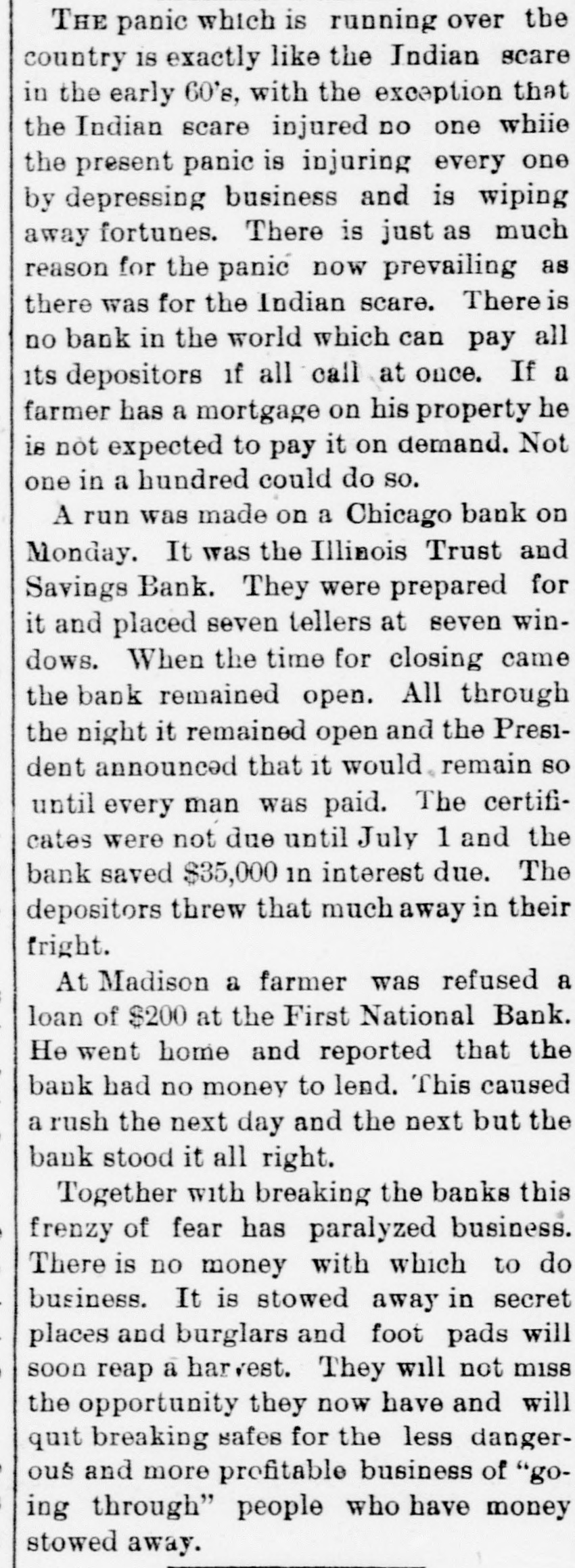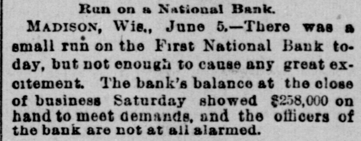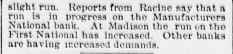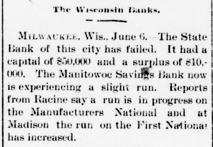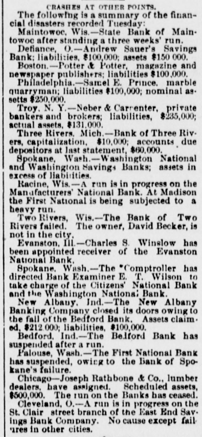 CRIPPLED BANKS. Small Country Banks in Wisconsin Suspend Payment. NEW YORK, June 6.-State Examiner Preston took charge of the affairs of the Canal Street bauk, at 206 Canal street, this morning. The bank went into voluntary liquidation yesterday because of the refusal of the Shoe and Leather bank to clear for the Canal Street bank. Two RIVERS, Wis., June 6.-The Bank of Two Rivers failed this morning. A statement from the officials as to the cause and condition of the bank cannot be had, as the cashier and principal owner, David Becker, is not in the city. MILWAUKEE, June 6.-The flurry in financial circles of last week has passed away. This morning there is not a run on a single bank in town. The Commercial, Second Ward and South Side Savings banks present their usual appearance, and confidence seems to have been completely restored. It was thought that the flurry in Chicago would have its effect here, but its influence does not seem to have been felt at all. TOLEDO, O., June 6.-A Blade special says the savings bank of Andrew Sauer, at Defiance, failed. Particulars soon as received. Liabilities, $100,000. TROY, N. Y., June 6.-The affairs of Neher & Carpenter, brokers and private bankers, who failed some time ago, are not in an encouraging condition. The liabilities are about $235,000 and the actual value of the assets $131,000. Neher & Carpenter were the Eastern agents of the North western Guaranty Loan association, of Minneapolis. MILWAUKEE, June 6.-A special from Manitowoc, Wis., says the State bank in that city has closed. Its capital stock was $50.000, and the surplus $10,000. The Manitowoc Savings bank is now experiencing a light run. Reports from Racine say a run is in progress on the Manufacturers' National bank. At Madison the run on the First National bank has increased in vigor, while other banks are having increased demands. SPOKANE, Wash., Jnne 6.-The Washington National bank and its adjunct, the Washington Savings bank, closed their doors this morning. They were crippled by the quiet run yesterday. Both show strong assets in excess of liabilities, but could not get money in time for the sudden whirl. The other banks are being subjected to a severe run, but seem to be standing the strain well.