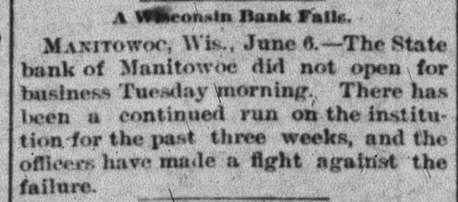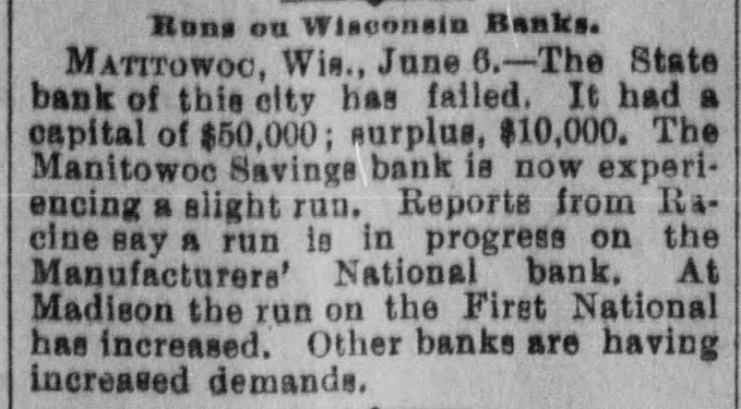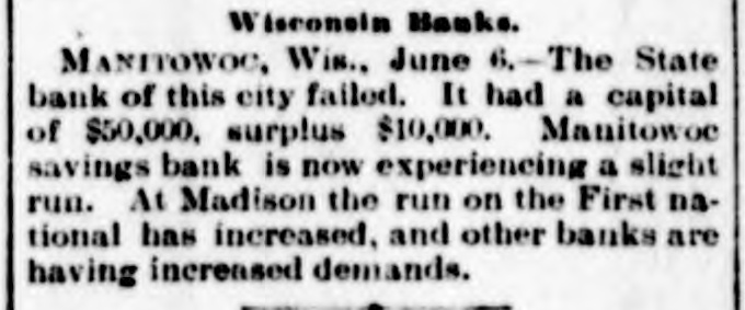 WISCONSIN BANKS, The State Bank of Manitowoc Succumbs -Runs on Others. MILWAUKEE, Wis., June 6.-The State Bank of Manitowoc has failed. It had a capital of $50,000 and a surplus of $10,000. The Manitowoc Savings bank is now experiencing a slight run. Returns from Racine say a slight run is in progress on the Manufacturers' National. At Madison the run on the First National has increased, and other banks are having increased demands.