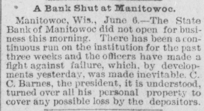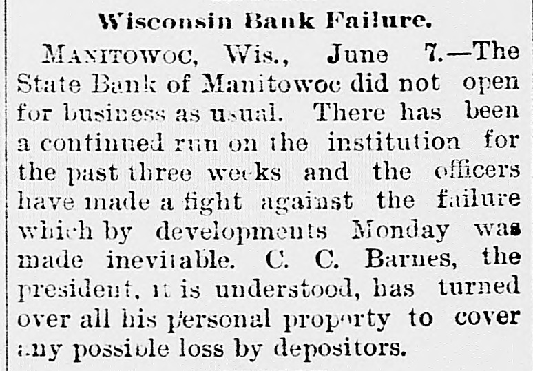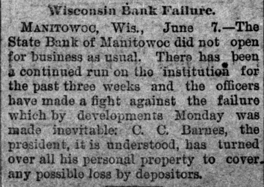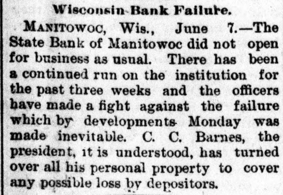 Wisconsin the Bank Failure. MANITOWOC, Wis., June 7.-The State Bank of Manitowoc did not open for business as usual. There has been a continued run on the institution for the past three weeks and the officers have made a fight against the failure which by developments Monday was made inevitable. C. C. Barnes, the president, it is understood, has turned over all his personal property to cover any possible loss by depositors.