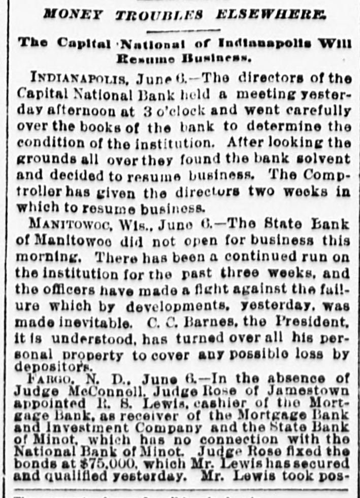 MONEY TROUBLES ELSEWHERE The Capital National of Indianapolis Will Resume Business. INDIANAPOLIS June 6. - The directors of the Capital National Bank held a meeting yesterday afternoon at 3 o'clock and went carefully over the books of the bank to determine the condition of the institution. After looking the grounds all over they found the bank solvent and decided to resume business. The Comptroller has given the directors two weeks in which to resume business. MANITOWOC, Wis.. June 6.-The State Bank of Manitowoo did not open for business this morning. There has been a continued run on the institution for the past three weeks, and the officers have made a flight against the failure which by developments. yesterday. was made inevitable. C. c. Barnes. the President. it is understood, has turned over all his personal property to cover any possible loss by depositors. FARGO. N. D., June 6.-In the absence of Judge McConnell. Judge Rose of Jamestown appointed R. S. Lewis. cashier of the Mortgage Bank, as receiver of the Mortgage Bank and Investment Company and the State Bank of Minot. which has no connection with the National Bank of Minot. Judge Rose fixed the bonds at $75,000. which Mr. Lewis has secured and qualified yesterday. Mr. Lewis took DOS-