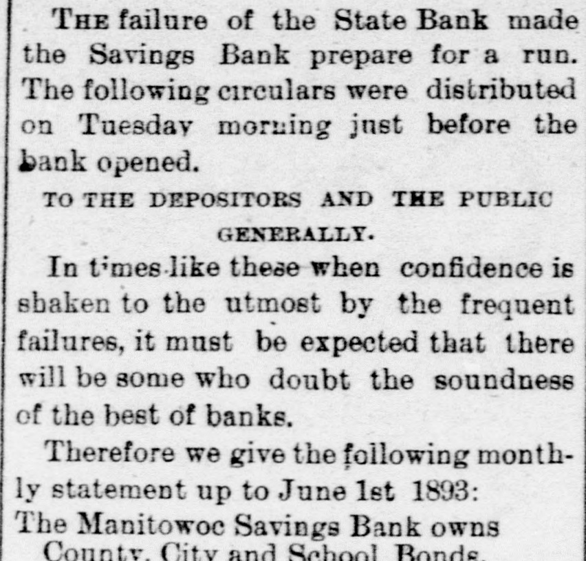 THE failure of the State Bank made the Savings Bank prepare for a run. The following circulars were distributed on Tuesday morning just before the bank opened. TO THE DEPOSITORS AND THE PUBLIC GENERALLY. In times.like these when confidence is sbaken to the utmost by the frequent failures, it must be expected that there will be some who doubt the soundness of the best of banks. Therefore we give the following monthly statement up to June 1st 1893: The Manitowoc Savings Bank owns County. City and School Bonds