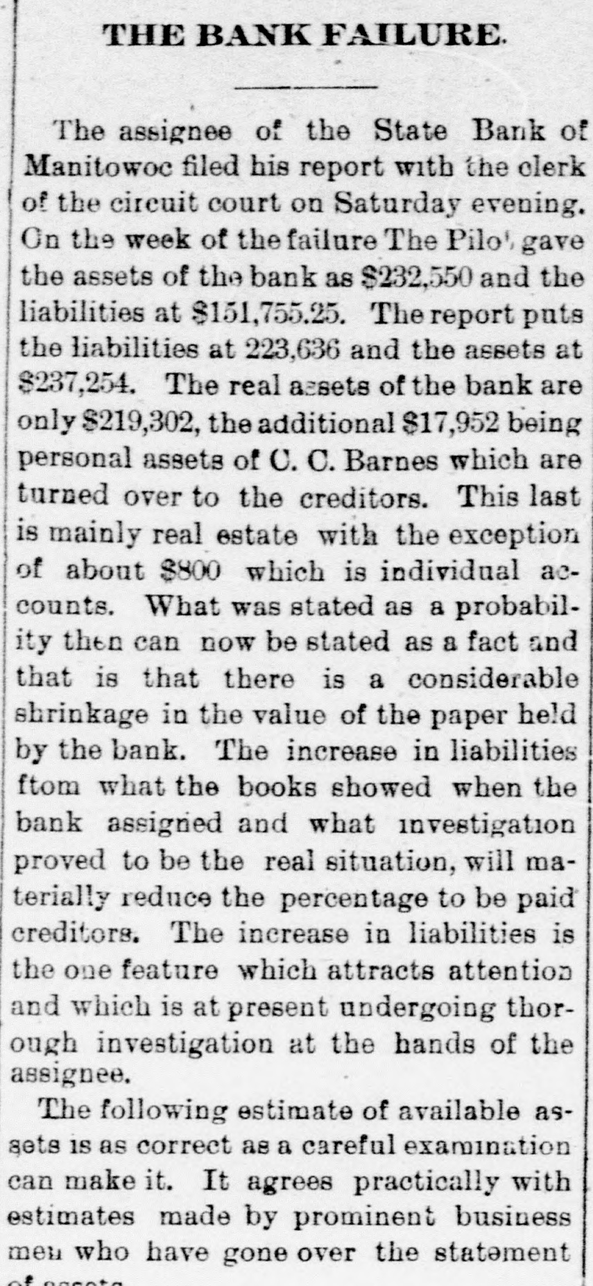 THE BANK FAILURE The assignee of the State Bank of Manitowoc filed his report with the clerk of the circuit court on Saturday evening. On the week of the failure The Pilo' gave the assets of the bank as $232,550 and the liabilities at $151,755.25. The report puts the liabilities at 223,636 and the assets at $237,254. The real assets of the bank are only $219,302, the additional $17,952 being personal assets of C. C. Barnes which are turned over to the creditors. This last is mainly real estate with the exception of about $800 which is individual accounts. What was stated as a probability then can now be stated as a fact and that is that there is a considerable shrinkage in the value of the paper held by the bank. The increase in liabilities ftom what the books showed when the bank assigned and what investigation proved to be the real situation, will materially reduce the percentage to be paid creditors. The increase in liabilities is the one feature which attracts attention and which is at present undergoing thorough investigation at the hands of the assignee. The following estimate of available assets is as correct as a careful examination can make it. It agrees practically with estimates made by prominent business men who have gone over the statement