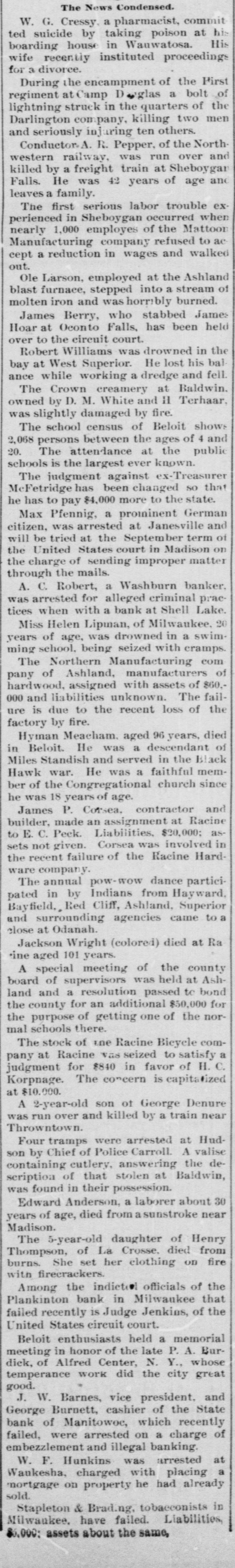 The News Condensed. W. G. Cressy, a pharmacist, commit ted suicide by taking poison at his boarding house in Wauwatosa. His wife recently instituted proceedings for a divorce. During the encampment of the Pirst regiment at Camp Deglas a bolt of lightning struck in the quarters of the Darlington company, killing two men and seriously inj tring ten others. Conductor R. Pepper, of the North western railway, was run over and killed by a freight train at Sheboygar Falls. He was 42 years of age ano leaves a family. The first serious labor trouble experienced in Sheboygan occurred when nearly 1,000 employes of the Mattoon Manufacturing company refused to ac cept a reduction in wages and walked out. Ole Larson, employed at the Ashland blast furnace, stepped into a stream of molten iron and was horribly burned. James Berry, who stabbed James Hoar at Oconto Falls, has been held over to the circuit court. Robert Williams was drowned in the bay at West Superior. He lost his balance while working a dredge and fell. The Crown creamery at Baldwin. owned by D. M. White and a Terhaar, was slightly damaged by fire. The school census of Beloit shows 2,068 persons between the ages of 4 and 20. The attendance at the public schools is the largest ever known. The judgment against ex-Treasurer McFetridge has been changed so that he has to pay $4,000 more to the state. Max Pfennig, a prominent German citizen, was arrested at Janesville and will be tried at the September term of the United States court in Madison on the charge of sending improper matter through the mails. A. C. Robert, a Washburn banker. was arrested for alleged criminal practices when with a bank at Shell Lake. Miss Helen Lipman, of Milwaukee. 20 years of age, was drowned in a swimming school. being seized with cramps. The Northern Manufacturing com pany of Ashland, manufacturers of hardwood, assigned with assets of $60.000 and liabilities unknown. The failure is due to the recent loss of the factory by fire. Hyman Meacham. aged 96 years, died in Beloit. He was a descendant of Miles Standish and served in the Black Hawk war. He was a faithful member of the Congregational church since he was 18 years of age. James P. Corsea. contractor and builder, made an assignment at Racine to E. C. Peck. Liabilities, $20,000; assets not given. Corsea was involved in the recent failure of the Racine Hardware company. The annual pow-wow dance participated in by Indians from Hayward, Bayfield, Red Cliff, Ashland, Superior and surrounding agencies came to a close at Odanah. Jackson Wright (colored) died at Ra tine aged 101 years. A special meeting of the county board of supervisors was held at Ashland and a resolution passed to bond the county for an additional $50,000 for the purpose of getting one of the normal schools there. The stock of the Racine Bicycle company at Racine vas seized to satisfy a judgment for $840 in favor of H. C. Korpnage. The concern is capitatized at $10.000. A 2-year-old son of George Denure was run over and killed by a train near Throwntown. Four tramps were arrested at Hudson by Chief of Police Carroll. A valise containing cutlery, answering the description of that stolen at Baldwin, was found in their possession. Edward Anderson, a laborer about 30 years of age, died from asunstroke near Madison. The 5-year-old daughter of Henry Thompson, of La Crosse, died from burns. She set her clothing on fire with firecrackers. Among the indictol officials of the Plankinton bank in Milwaukee that failed recently is Judge Jenkins, of the United States circuit court. Beloit enthusiasts held a memorial meeting in honor of the late P. A. Burdick, of Alfred Center, N. Y., whose temperance work did the city great good. J. W. Barnes, vice president, and George Burnett, cashier of the State bank of Manitowoe, which recently failed, were arrested on a charge of embezzlement and illegal banking. W. F. Hunkins was arrested at Waukesha, charged with placing a mortgage on property he had already sold. Stapleton & Brading, tobacconists in Milwaukee. have failed. Liabilities, $6,000: assets about the same,