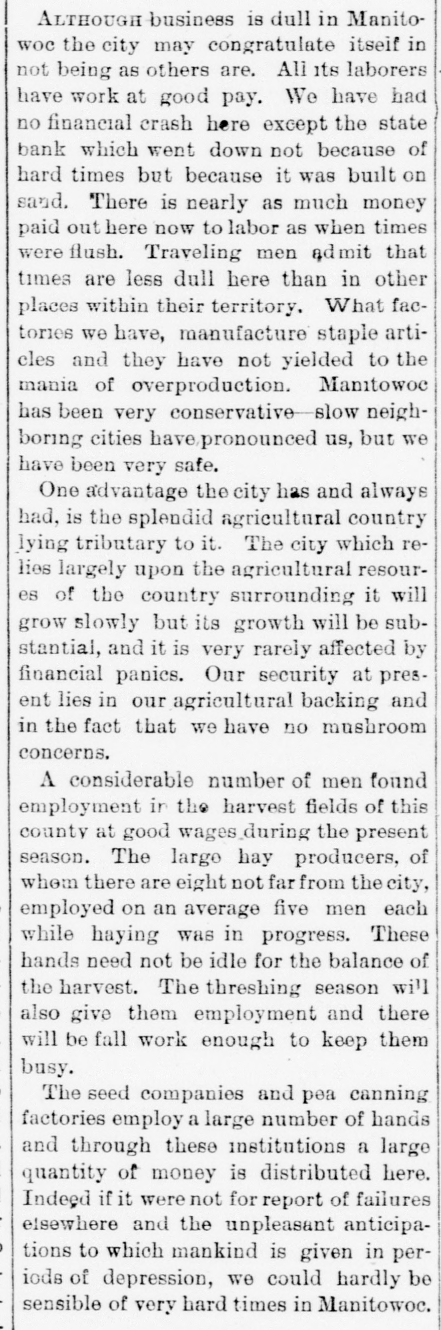 ALTHOUGH business is dull in Manitowoc the city may congratulate itself in not being as others are. All its laborers have work at good pay. We have had no financial crash here except the state bank which went down not because of hard times but because it was built on sand. There is nearly as much money paid out here now to labor as when times were flush. Traveling men admit that times are less dull here than in other places within their territory. What factories we have, manufacture staple articles and they have not yielded to the mania of overproduction. Manitowoc has been very conservative-slow neighboring cities have pronounced us, but we have been very safe. One advantage the city has and always had, is the splendid agricultural country lying tributary to it. The city which relies largely upon the agricultural resources of the country surrounding it will grow slowly but its growth will be substantial, and it is very rarely affected by financial panics. Our security at present lies in our agricultural backing and in the fact that we have no mushroom concerns. A considerable number of men found employment in the harvest fields of this county at good wages during the present season. The large hay producers, of whom there are eight not far from the city, employed on an average five men each while haying was in progress. These hands need not be idle for the balance of the harvest. The threshing season will also give them employment and there will be fall work enough to keep them busy. The seed companies and pea canning factories employ a large number of hands and through these institutions a large quantity of money is distributed here. Indeed if it were not for report of failures elsewhere and the unpleasant anticipations to which mankind is given in periods of depression, we could hardly be sensible of very hard times in Manitowoc.