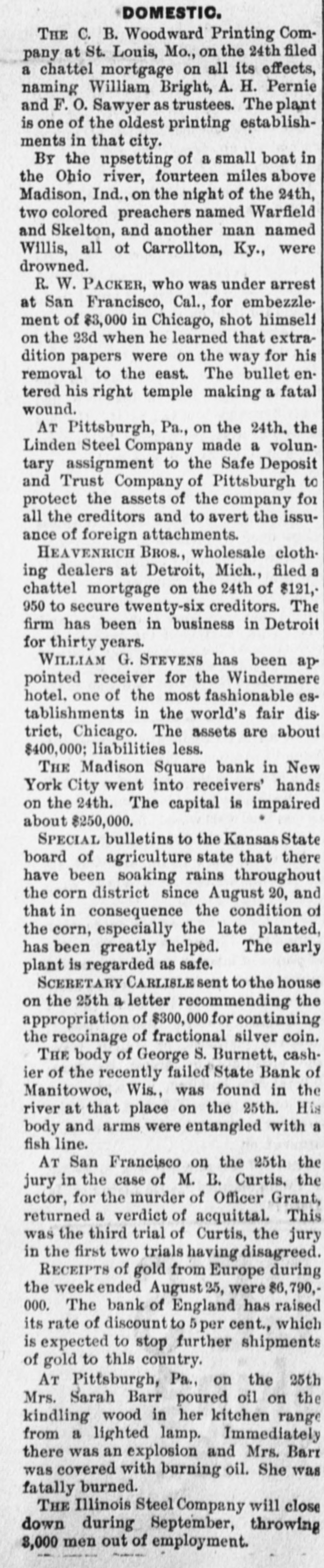 DOMESTIC. THE C. B. Woodward Printing Company at St. Louis, Mo., on the 24th filed a chattel mortgage on all its effects, naming William Bright, A. H. Pernie and F. O. Sawyer as trustees. The plant is one of the oldest printing establishments in that city. By the upsetting of a small boat in the Ohio river, fourteen miles above Madison, Ind., on the night of the 24th, two colored preachers named Warfield and Skelton, and another man named Willis, all of Carrollton, Ky., were drowned. R. W. PACKER, who was under arrest at San Francisco, Cal., for embezzlement of $3,000 in Chicago, shot himself on the 23d when he learned that extradition papers were on the way for his removal to the east. The bullet entered his right temple making a fatal wound. AT Pittsburgh, Pa., on the 24th, the Linden Steel Company made a voluntary assignment to the Safe Deposit and Trust Company of Pittsburgh to protect the assets of the company for all the creditors and to avert the issuance of foreign attachments. HEAVENRICH BROS., wholesale clothing dealers at Detroit, Mich., filed a chattel mortgage on the 24th of $121,950 to secure twenty-six creditors. The firm has been in business in Detroit for thirty years. WILLIAM G. STEVENS has been appointed receiver for the Windermere hotel. one of the most fashionable establishments in the world's fair district, Chicago. The assets are about $400,000; liabilities less. THE Madison Square bank in New York City went into receivers' hands on the 24th. The capital is impaired about $250,000. SPECIAL bulletins to the Kansas State board of agriculture state that there have been soaking rains throughout the corn district since August 20, and that in consequence the condition of the corn, especially the late planted, has been greatly helped. The early plant is regarded as safe. SCERETARY CARLISLE sent to the house on the 25th a letter recommending the appropriation of $300,000 for continuing the recoinage of fractional silver coin. THE body of George S. Burnett, cashier of the recently failed State Bank of Manitowoc, Wis., was found in the river at that place on the 25th. His body and arms were entangled with a fish line. AT San Francisco on the 25th the jury in the case of M. B. Curtis. the actor, for the murder of Officer Grant, returned a verdict of acquittal. This was the third trial of Curtis, the jury in the first two trials having disagreed. RECEIPTS of gold from Europe during the week ended August 25, were $6,790,000. The bank of England has raised its rate of discount to 5 per cent., which is expected to stop further shipments of gold to thls country. AT Pittsburgh, Pa., on the 25th Mrs. Sarah Barr poured oil on the kindling wood in her kitchen range from a lighted lamp. Immediately there was an explosion and Mrs. Barr was covered with burning oil. She was fatally burned. THE Illinois Steel Company will close down during September, throwing 3,000 men out of employment.