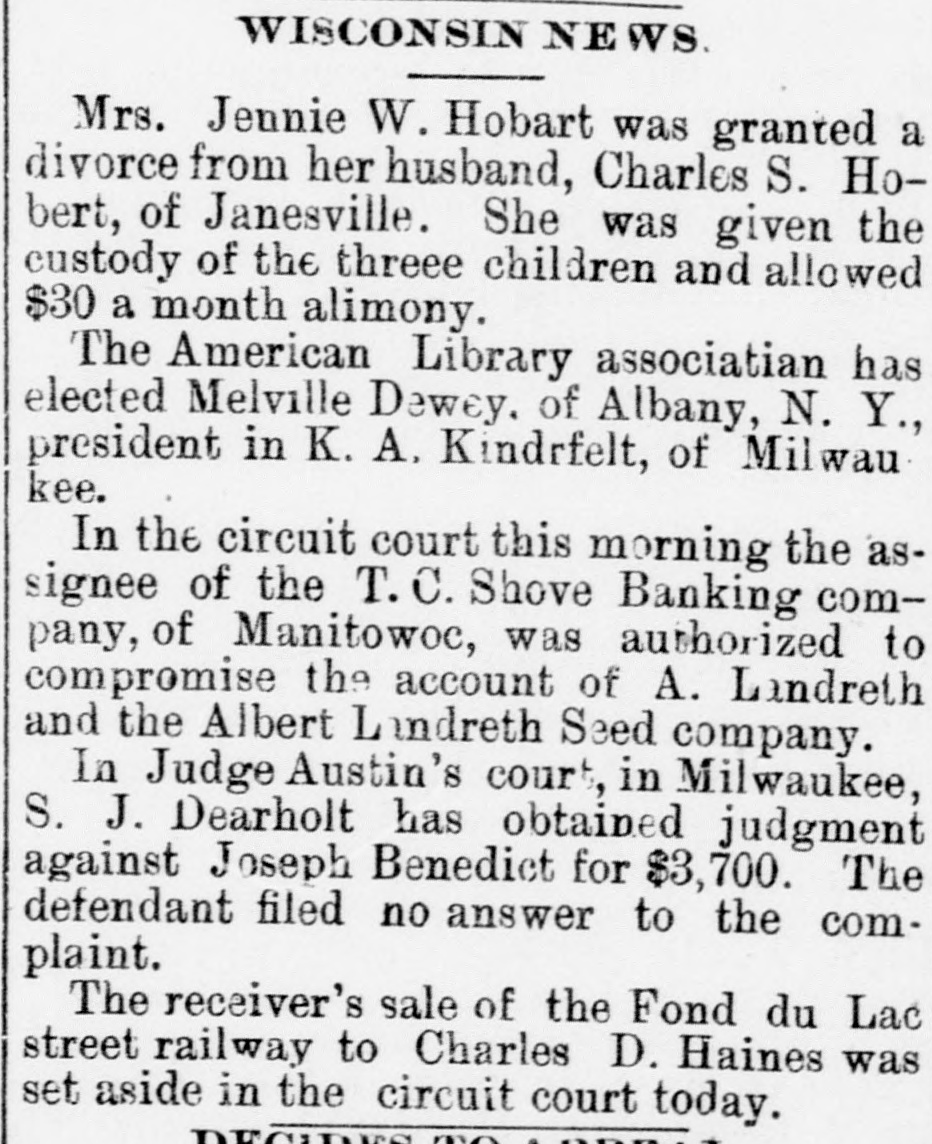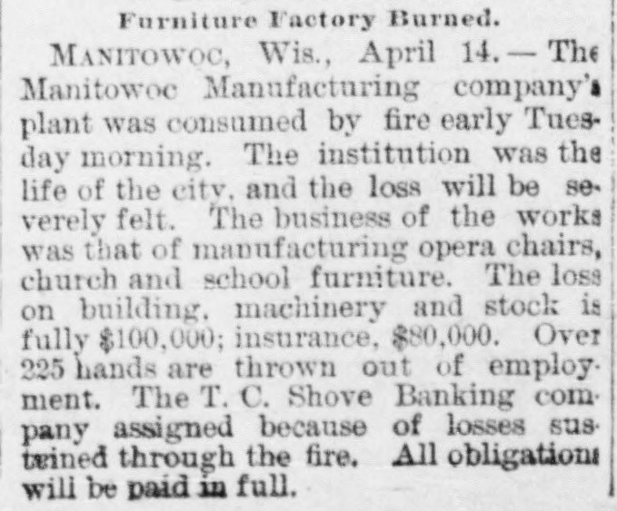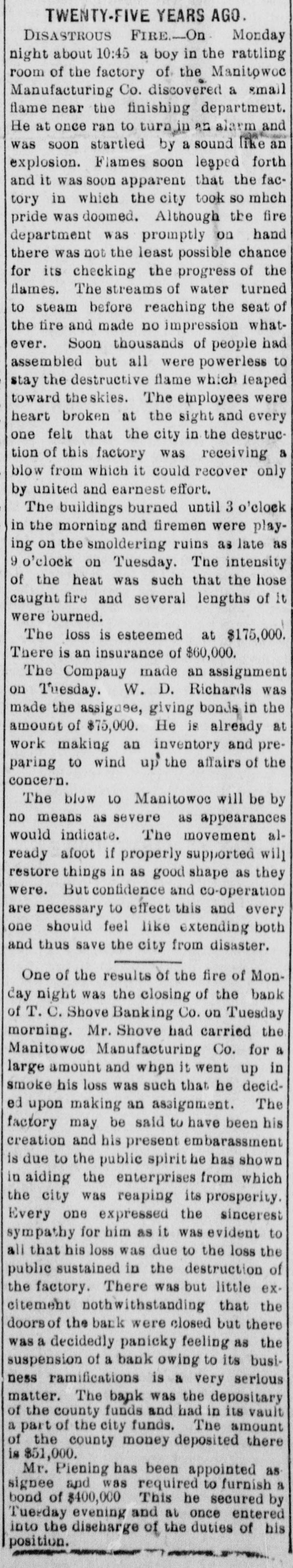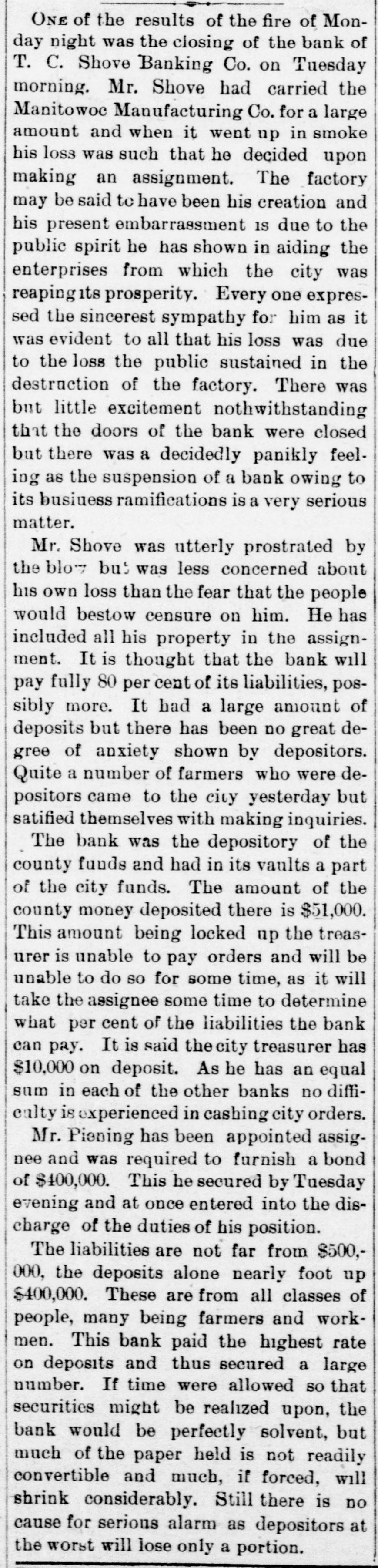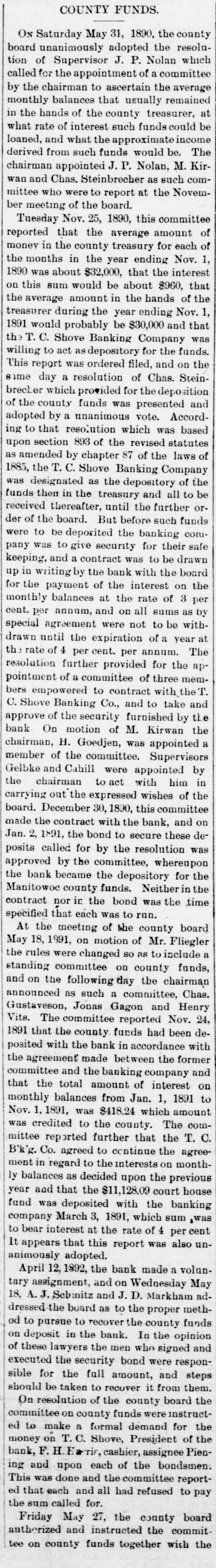 COUNTY FUNDS. ON Saturday May 31, 1890, the county board unanimously adopted the resolution of Supervisor J. P. Nolan which called for the appointment of a committee by the chairman to ascertain the average monthly balances that usually remained in the hands of the county treasurer, at what rate of interest such funds could be loaned, and what the approximate income derived from such funds would be. The chairman appointed J. P. Nolan, M. Kirwan and Chas. Steinbrecher as such committee who were to report at the November meeting of the board. Tuesday Nov. 25, 1890, this committee reported that the average amount of money in the county treasury for each of the months in the year ending Nov. 1, 1890 was about $32,000, that the interest on this sum would be about $960, that the average amount in the hands of the treasurer during the year ending Nov. 1, 1891 would probably be $30,000 and that the T. C. Shove Banking Company was willing to act as depository for the funds. This report was ordered filed, and on the sime day a resolution of Chas. Steinbrecher which provided for the deposition of the county funds was presented and adopted by a unanimous vote. According to that resolution which was based upon section 893 of the revised statutes as amended by chapter 87 of the laws of 1885, the T. C. Shove Banking Company was designated as the depository of the funds then in the treasury and all to be received thereafter, until the further order of the board. But before such funds were to be deposited the banking company was to give security for their safe keeping, and a contract was to be drawn up in writing by the bank with the board for the payment of the interest on the monthly balances at the rate of 3 per cent. per annum, and on all sums as by special agreement were not to be withdrawn until the expiration of a year at th rate of 4 per cent. per annum. The resolution further provided for the appointment of a committee of three members empowered to contract with the T. C. Shove Banking Co., and to take and approve of the security furnished by the bank On motion of M. Kirwan the chairman, H. Goedjen, was appointed a member of the committee. Supervisors Gelbke and Cahill were appointed by the chairman to act with him in carrying out the expressed wishes of the board. December 30, 1890, this committee made the contract with the bank, and on Jan. 2, 1891, the bond to secure these deposits called for by the resolution was approved by the committee, whereupon the bank became the depository for the Manitowoc county funds. Neither in the contract nor in the bond was the time specified that each was to run. At the meeting of the county board May 18, 1991, on motion of Mr. Fliegler the rules were changed SO as to include a standing committee on county funds, and on the following day the chairman announced as such a committee, Chas. Gustaveson, Jonas Gagon and Henry Vits. The committee reported Nov. 24, 1891 that the county funds had been deposited with the bank in accordance with the agreement made between the former committee and the banking company and that the total amount of interest on monthly balances from Jan. 1, 1891 to Nov. 1, 1891, was $418.24 which amount was credited to the county. The committee reported further that the T. C. B'k'g. Co. agreed to continue the agreement in regard to the interests on monthly balances as decided upon the previous year and that the $11,128.09 court house fund was deposited with the banking company March 3, 1891, which sum ,was to bear interest at the rate of 4 per cent It appears that this report was also unanimously adopted. April 12, 1892, the bank made a voluntary assignment, and on Wednesday May 18, A. J. Sebmitz and J. D. Markham addressed the board as to the proper method to pursue to recover the county funds on deposit in the bank. In the opinion of these lawyers the men who signed and executed the security bond were responsible for the full amount, and steps should be taken to recover it from them. On resolution of the county board the committee on county funds were instructed to make a formal demand for the money on T.C. Shove, President of the bank, F. H.Earis, cashier, assignee Piening and upon each of the bondsmen. This was done and the committee reported that each and all had refused to pay the called for
