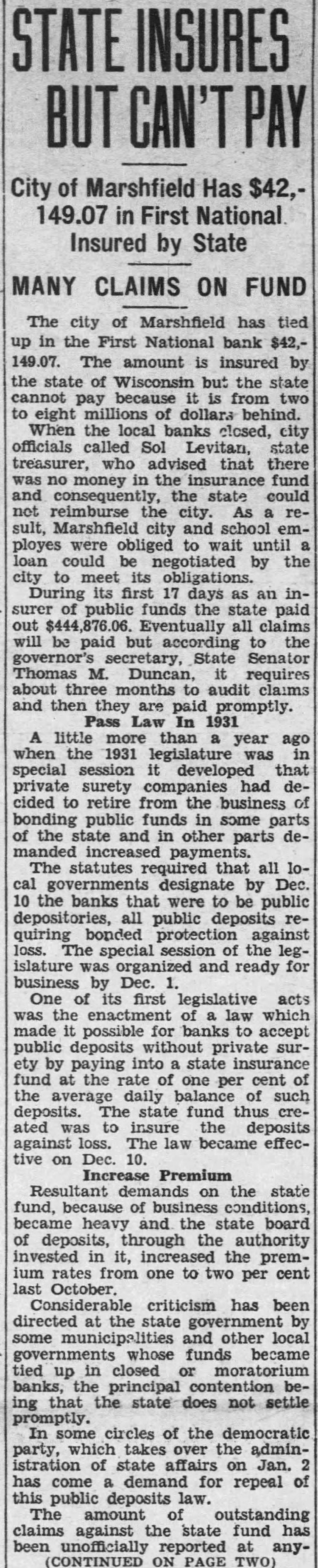 City of Marshfield $42,in First National Insured by State MANY CLAIMS ON FUND The city of Marshfield has tied up in the First National bank $42,The amount insured by the state of Wisconsin but the state pay because from eight of dollars behind. When the local banks closed, city officials called Sol who that there money the fund and the state could not reimburse the city. sult, Marshfield and school ployes were obliged to loan could be negotiated by the city to meet its During its first 17 days an infunds the state paid Eventually all paid but the State Senator Thomas M. Duncan, requires about months audit claims and then they are promptly. Pass Law In 1931 little than year when 1931 legislature special session that private surety had cided to retire from the of public funds in some the state and in other parts deThe statutes that all designate by Dec. 10 the banks that to be public depositories, public deposits quiring bonded protection against loss. special islature organized and ready for Dec. One its first legislative acts law which made possible for banks accept public deposits without surety into state insurance fund the one per cent of the daily of such deposits. state fund thus ated insure deposits loss. The became effective Premium the state fund, heavy and the state board deposits, through the authority invested it, premrates from one to two per cent Considerable criticism has been directed state by some municipalities and other local whose funds became tied up in closed banks, the principal contention that the state does not settle some circles of the democratic party, which the administration of state on has come for repeal public deposits amount outstanding claims against the state fund been (CONTINUED PAGE