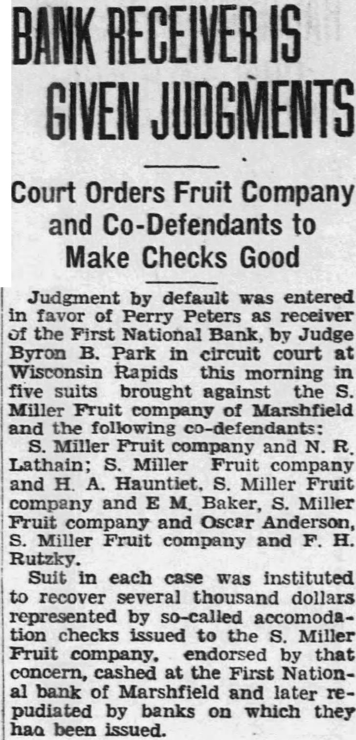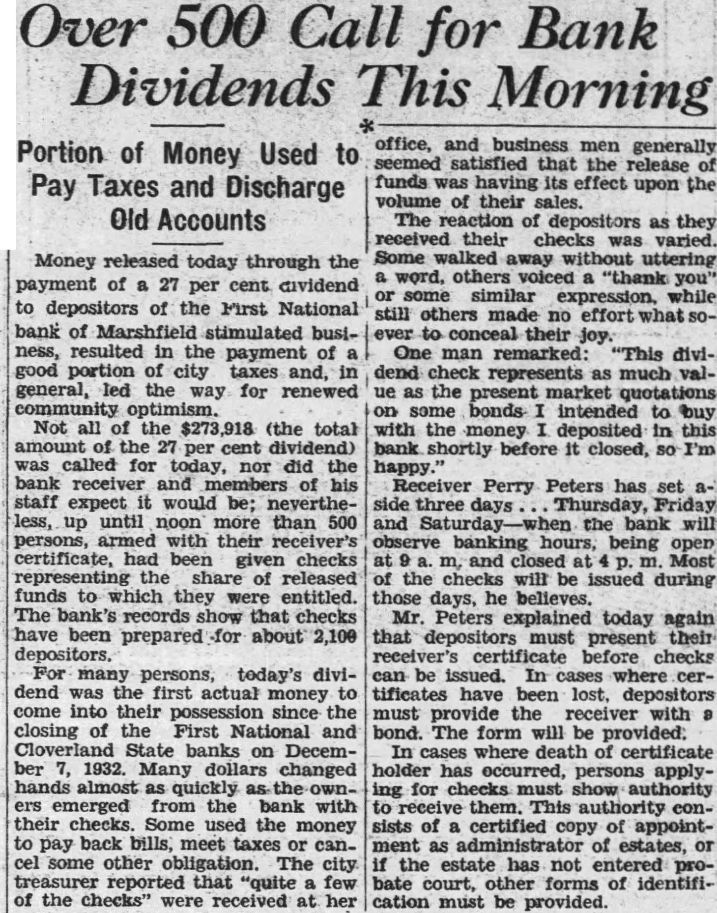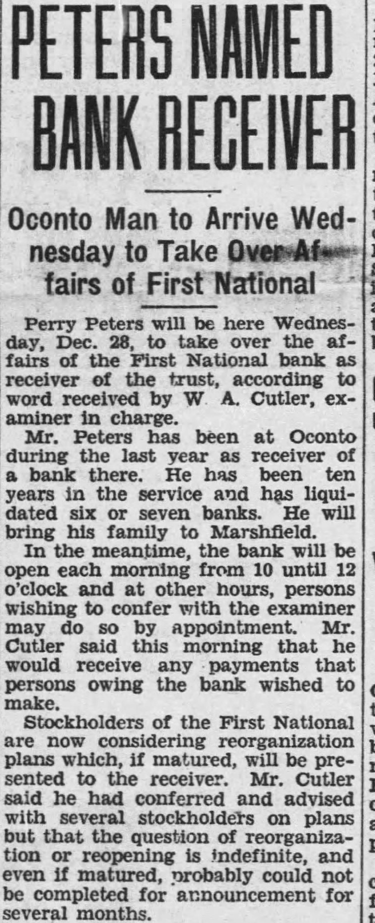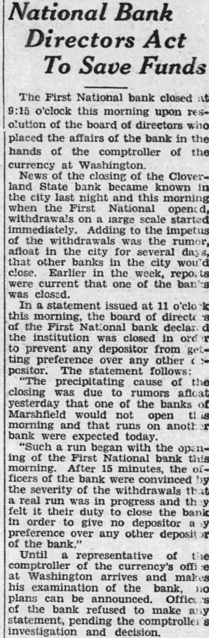 National Directors Act To Save Funds The First National bank closed o'clock this morning upon olution of the board of directors who placed the affairs of the bank in the hands of comptroller of the currency Washington News closing the CloverState bank known the city night and morning when First National withdrawals large scale started immediately. Adding the impetus of the withdrawals the rumor, afloat in the city for several that other banks the city close. Earlier the week, current that one of the closed. statement issued at this morning, the board directo the First bank declar the institution closed prevent depositor from ting preference over any other positor. The follows: precipitating cause of the closing due rumors afloat yesterday that one the banks Marshfield would not open morning that anoth bank were expected today. "Such run began with the of the First National bank this morning. After 15 minutes, the ficers the bank were convinced the severity of the withdrawals real was progress and their duty close the bank in order give no depositor preference over any other deposit the Until representative of comptroller currency's Washington arrives and examination of the bank, plans be announced. Office the bank refused to make statement, pending the comptrolle investigation and decision.