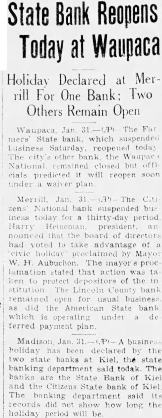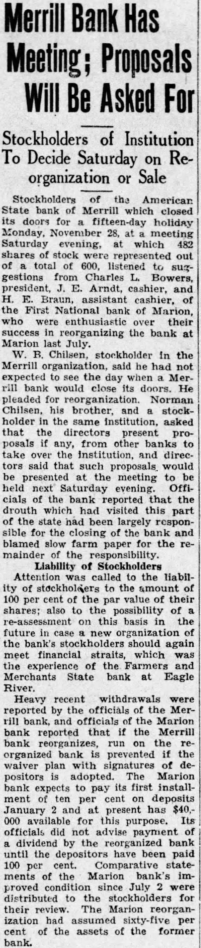 Merrill Bank Has Meeting; Proposals Will Be Asked For Stockholders of Institution To Decide Saturday on Reorganization or Sale Stockholders the American State bank which closed its for fifteen-day holiday Monday, 28, meeting Saturday evening, which 482 shares out total of listened suggestions Charles president, Arndt, cashier, and H. of the First bank of Marion, who enthusiastic their success reorganizing the bank at Marion Chilsen, stockholder in the Merrill organization, he had not expected day rill bank close its doors. He pleaded reorganization. Norman Chilsen, his brother. stockholder the same institution, asked that the directors present posals any, from banks to take the Institution and directors said that would meeting to be evening. Officials the bank reported that the drouth visited this part of state had been largely responsible the closing the bank and blamed slow farm paper the remainder responsibility. Liability of Stockholders Attention called to the liability of stockholders to the amount 100 per cent of the par value their shares: also to possibility of re-assessment on this basis the future new the bank's stockholders should again meet financial straits, which was the the Farmers and Merchants State bank at Eagle River. Heavy recent withdrawals were reported by officials Merrill bank, and officials the Marion bank reported that the Merrill bank reorganizes, on the reorganized bank is prevented the waiver plan with signatures of depositors adopted. Marion bank expects to pay its first installment ten per cent on deposits January at present has $40.000 available for this purpose. officials did advise payment dividend reorganized bank until the depositors have been paid 100 cent. Comparative ments the Marion bank's improved condition since July distributed to stockholders for their The Marion ization assumed per cent the assets of the former bank.