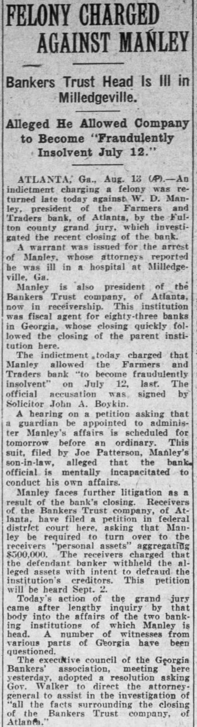 LIGHT. thought impossible that there could any longer of at least, in regard to the recent flurry which bowled over number Georgia and Florida banks that were links what stands revealed weak bank chain. held certain officers the defunct Bankers Trust company, which brought all the trouble, would not brought forward nesses what happened. has turned out In its issue of Aug. 26, the Banker, published New York and of the counoutstanding banking and nancial magazines, carried under an Atlanta date line this of officer of the BankTrust company" to why what happened did happen: Bankers Trust company and allied could have pulled through everything righted except Florida which was part responsible for the disruption of the rehabilita- would seem that the ida state chamber of commerce, the Florida Bankers' association, the other or both, should immediately take matter up the American Banker, to the end that the actual facts of this chapter our experiences shall set by that publication. There no doubting that the carrying that statement in the Banker calculated to do Florida great and altogether deserved harm. In meantime an Associated Press Atlanta terday calculated to shed great light upon this matter. said that the assistant solicitor general Atlanta circuit had asked the Georgia state banking department indictments against Manley, the head of the Bankers Trust company, in every Georgia county which he financed bank and, also, that this action closely followed the presentation to the Fulton county, Georgia, grand jury indictments against Manley and other officers of his bank. charging larceny after trust and that they allowed the Farmers and Traders Atlanta, member of the Bankers Trust chain, fraudulently insolvent during their ministration." Information also given this press dispatch named in these indictments are Manley, Adams, trustee: Paul Baker, and John Russell, assistant secretary and trustee the Farmers and Tradbank. Wonder grows if any these who the statement carried in the American Banker. something have defendant in criminal proceedings, possible defendant such proceedings, to forestall conviction in the courts by unloading their wrong before door of state. that the fact appears that Manley and his associates against whom indictments have been returned and against more indictments are being sought should illumine the whole far as arriving and what are responsible happened concerned. No thought any grand jury's dicting the state Florida business tertained. Officers the an almost invariable way going after those who the proof shows to guilty they criminal proceedings We rather upon the judgment the Atlanta solicitor general fixing the cause of the aster than upon all the statements which Manley any crowd make the columns the American Banker or for other columns. Florida doesn't deserve what the American Banker has done her by the publication referred She appreciate Whole and immediate should made have the American Banker the facts the Florida nothing fear from truthful setting forth these facts. no satisfaction to know that weather conditions in Kansas such are here out. Certainly regret to know that many farmers in Kansas who have depended upon this year have witnessed its total destruction and that much the Kansas not fit for fodder, which means whole year's work tirely lost. But weather conditions are what they are and, spite attempts men have made change them our opinion, always be beyond mortal control. impressed, however, the difference sas and Florida in regard weather crops. With abundance artesian water able, close the top of the ground, no Florida farmer need have his crops burned he the little trouble and not large expense necessary provide irrigation. Even those do to do without hope here. the such others can be in and harvest reached. Making from not an uncomthing with Florida farmers. This another of the things which make Florida most desiraplace for farming.