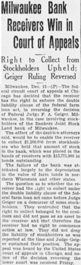Milwaukee Bank Receivers Win in Court of Appeals Right to Collect from Stockholders Upheld; Geiger Ruling Reversed eral circuit court of appeals at Chicago has decided that the receiver has the right to enforce the double liability clause of the federal farm loan act, in reversing the decision of Federal Judge F. A. Geiger. Milwaukee, in the case involving stockholders of the Bankers Joint Stock Land bank of Milwaukee. The effect of the decision attorneys said, would be to enable the receiver to collect $1,200,000 from stockholders who held that amount of stock in the bank, which was placed in the hands of receivers with $15,771,000 in bonds outstanding The failure of the bank was attributed largely to the depreciation in the value of farm lands in northern Wisconsin and other states. The question as to whether the receiver had the right 10 collect under the double liability clause of the federal farm loan act came before Judge Geiger on a demurrer of some stock holders. They contended that the right to collect belonged to the creditors and did not pass as an asset to the receiver and that therefore the receiver had no right to action at law. They did not deny the liability of stockholders as was reported at the time and Judge Gelger sustained their position. The appeal was heard by the United States court of appeals in Chicago, and notice of the decision reversing the lower court was received Friday.