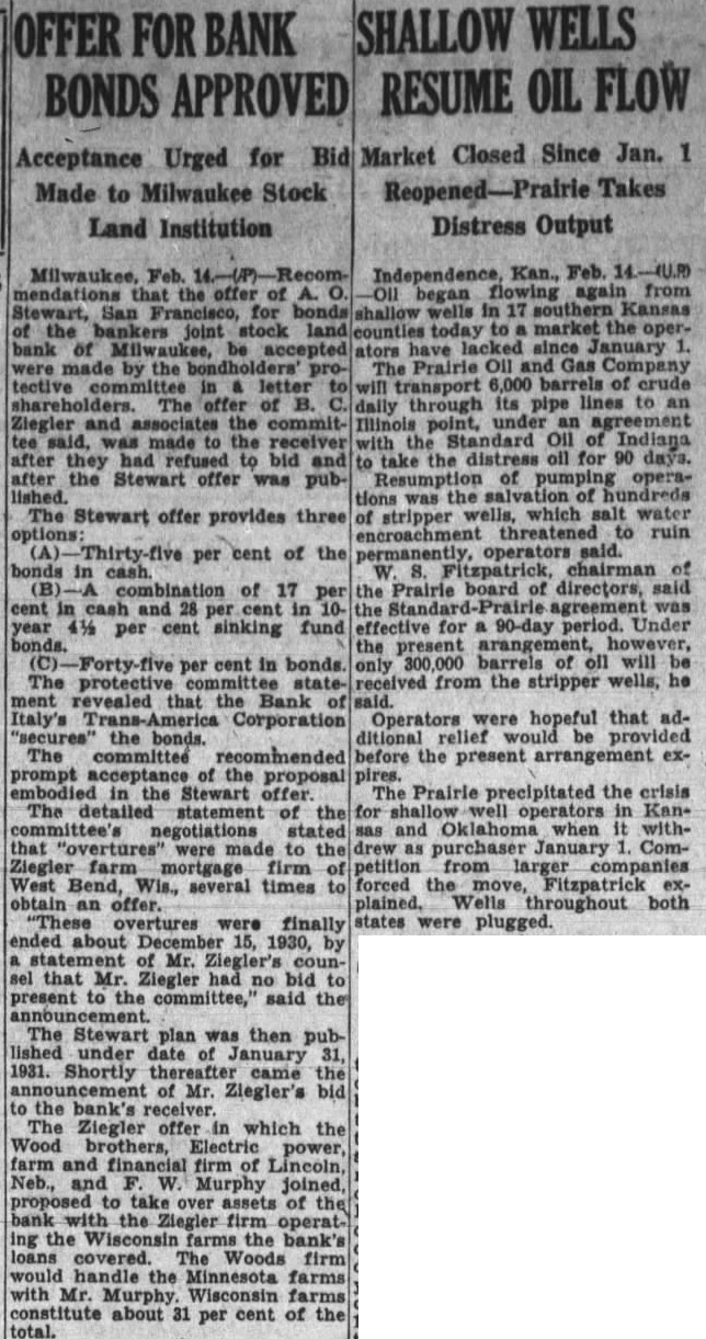 SHALLOW WELLS OFFER FOR BANK RESUME OIL FLOW BONDS APPROVED Acceptance Urged for Bid Made to Milwaukee Stock Land Institution Market Closed Since Jan. 1 Reopened Prairie Takes Distress Output mendations that the offer of A. O. Oil began flowing again from Stewart, San Francisco, for bonds shallow wells in 17 southern Kansas of the bankers joint stock land counties today to a market the operbank of Milwaukee, be accepted ators have lacked since January 1. were made by the bondholders' pro- The Prairie Oil and Gas Company tective committee in letter to will transport 6,000 barrels of crude shareholders. The offer of B. C. daily through its pipe lines to an Ziegler and associates the commit- Illinois point, under an agreement tee said, was made to the receiver with the Standard Oil of Indiana after they had refused to bid and to take the distress oil for 90 days. after the Stewart offer was pub Resumption of pumping operations was the of hundreds The Stewart offer provides three of stripper wells, which salt water options: encroachment threatened to ruin Thirty-five per cent of the permanently operators said. bonds in W. S. Fitzpatrick chairman of cash (B) combination of 17 per the Prairie board of directors, said in cash and 28 per cent in 10 the Standard-Prairie agreement was 4½ per cent sinking fund effective for 90-day period. Under the present arangement, however, -Forty- five per cent in bonds only 300,000 barrels of oil will be The protective state- received from the stripper wells, he ment revealed that the Bank of said. Italy's Trans-America Corporation Operators were hopeful that ad"secures" the bonds. ditional relief would provided The committee recommended before the present arrangement exprompt acceptance of the proposal pires. embodied in the Stewart offer The Prairle precipitated the crisis The detailed statement of the for shallow well operators in Kancommittee's negotiations stated sas and Oklahoma when it with"overtures" were made to the drew as purchaser January ComZiegler farm mortgage firm of petition from larger companies West Bend, Wis., several times to forced the move, Fitzpatrick exobtain an offer. plained. Wells throughout both "These overtures were finally states were plugged. ended about December 15, 1930, by a statement of Mr. Ziegler's counsel that Mr. Ziegler had no bid to present to the committee," said the announcement. The Stewart plan was then published under date of January 31, 1931. Shortly thereafter came the announcement of Mr. Ziegler's bid to the bank's receiver. The Ziegler offer in which the Wood brothers, Electric power farm and financial firm of Lincoln Neb., and F. W. Murphy joined proposed to take over assets of the bank with the Ziegler firm operating the Wisconsin the bank's loans covered The Woods firm would handle the Minnesota farms with Mr. Murphy Wisconsin farms constitute about 31 per cent of the total.