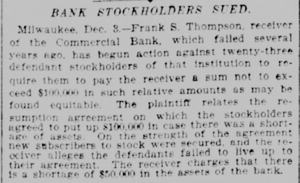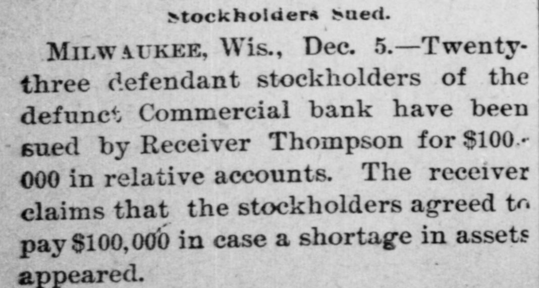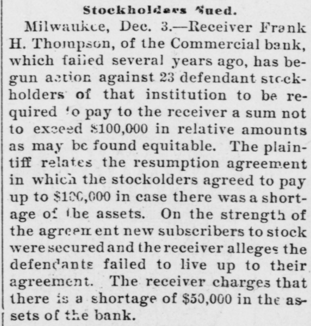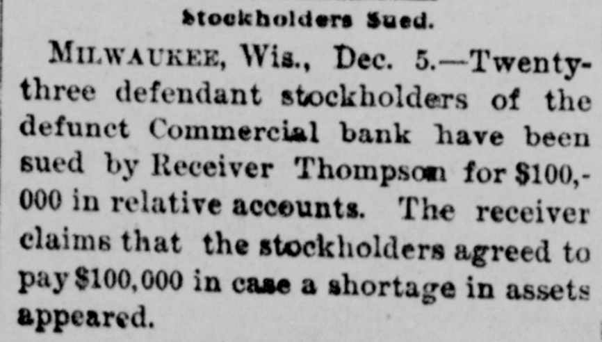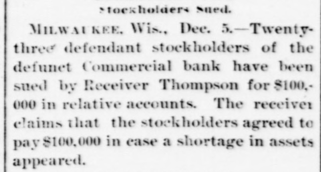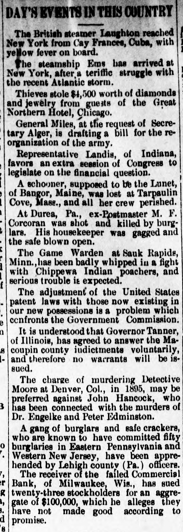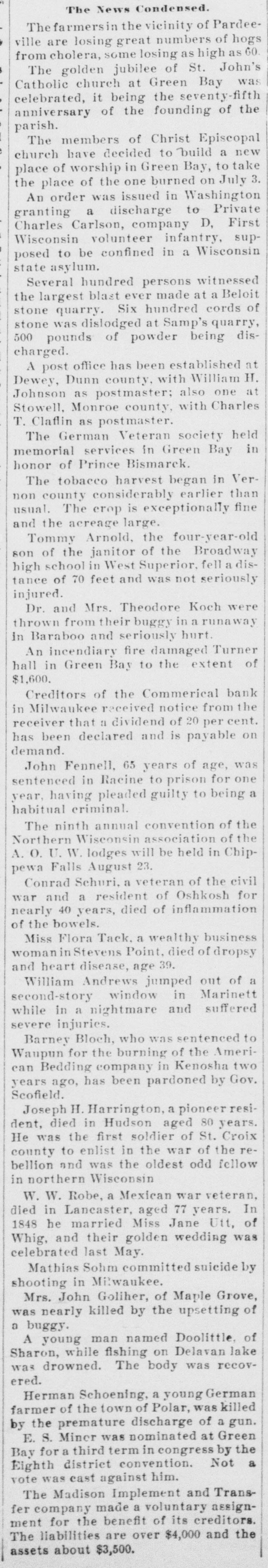 The News Condensed. The farmersin the vicinity of Pardeeville are losing great numbers of hogs from cholera, some losing as high as 60. The golden jubilee of St. John's Catholic church at Green Bay was celebrated, it being the seventy-fifth anniversary of the founding of the parish. The members of Christ Episcopal church have decided to build a new place of worship in Green Bay, to take the place of the one burned on July 3. An order was issued in Washington granting a discharge to Private Charles Carlson, company D, First Wisconsin volunteer infantry, supposed to be confined in a Wisconsin state asylum. Several hundred persons witnessed the largest blast ever made at a Beloit stone quarry. Six hundred cords of stone was dislodged at Samp's quarry, 500 pounds of powder being discharged. A post office has been established at Dewey, Dunn county, with William H. Johnson as postmaster; also one at Stowell, Monroe county, with Charles T. Claflin as postmaster. The German Veteran society held memorial services in Green Bay in honor of Prince Bismarck. The tobacco harvest began in Vernon county considerably earlier than usual. The erop is exceptionally fine and the acreage large. Tommy Arnold, the four-year-old son of the janitor of the Broadway high school in West Superior, felladistance of 70 feet and was not seriously injured. Dr. and Mrs. Theodore Koch were thrown from their buggy in a runaway in Baraboo and seriously hurt. An incendiary fire damaged Turner hall in Green Bay to the extent of $1,600. Creditors of the Commerical bank in Milwaukee received notice from the receiver that a dividend of 20 per cent. has been declared and is payable on demand. John Fennell, 65 years of age, was sentenced in Racine to prison for one year, having pleaded guilty to being a habitual criminal. The ninth annual convention of the Northern Wisconsin association of the A. O. U. W. lodges will be held in Chippewa Falls August 23. Conrad Schuri. a veteran of the civil war and a resident of Oshkosh for nearly 40 years, died of inflammation of the bowels. Miss Flora Tack, a wealthy business womaninStevens Point, died of dropsy and heart disease, age 39. William Andrews jumped out of a second-story window in Marinett while in a nightmare and suffered severe injuries. Barney Bloch, who was sentenced to Waupun for the burning of the American Bedding company in Kenosha two years ago, has been pardoned by Gov. Scofield. Joseph H. Harrington, a pioneer resident, died in Hudson aged 80 years. He was the first soldier of St. Croix county to enlist in the war of the rebellion and was the oldest odd fellow in northern Wisconsin W. W. Robe, a Mexican war veteran, died in Lancaster, aged 77 years. In 1848 he married Miss Jane Utt, of Whig, and their golden wedding was celebrated last May. Mathias Sohm committed suicide by shooting in Milwaukee. Mrs. John Goliher, of Maple Grove, was nearly killed by the upsetting of a buggy. A young man named Doolittle. of Sharon, while fishing on Delavan lake was drowned. The body was recovered. Herman Schoening, a young German farmer of town was premature the discharge of Polar, of killed by the a gun. E. S. Miner was nominated at Green Bay for a third term in congress by the a Eighth district convention. Not vote was cast against him. The Madison Implement and Transfer company made a voluntary assignment for the benefit of its creditors. The liabilities are over $4,000 and the assets about $3,500.