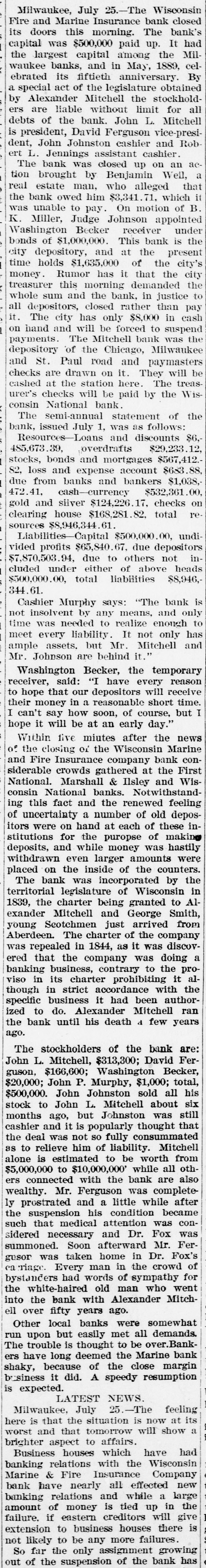 CONTINUED PROSPERITY(i) "The Best Financial System in the World" and "Reform" Continues to Turn Out Victims by the Hundreds----Bank and Commercial Failures Growing More Numerous--A Few of the Largest. Maj J. B. Neal. a large farmer and merchant near Neal's Station, N C., made an assignment on the 17th of July. Edward L. Pell, publisher of a religious paper at Richmond, Va, has assigned. Liabilities $1,300. Mr. Kenny Rose, merchant, Winston, assigned last week. INDIANAPOLIS, Ind., July 25.-The Bank of Commerce and the Indianapolis National Bank have closed. MILWAUKEE, Wis., July 25.-The Fire Insurance Bank has closed. No statement. MILWAUKEE, Wis., July 25 -Cashier Koetting, of the suspended South Side Savings Bank, is missing and also the general ledger of the bank. The liabilities will run up into the millions. The Southern Electric Company, one of the big enterprises of Baltimora, Md., made a voluntary assignment yesterday. Failure to collect over due accounts made it impossible for the company to meet its obligations. The as sets of the concern are estimated at $175,000, liabilities $100,000. CONNORSVILLE, Ind., July 24.-The Citizens' Bank, owned by ex United States Treasurer Huston, failed toopen its doors this morning, owing to the stringency. Liabilities and assets not yet made known. Depositors ill, it is said, be paid in full. TOLEDO. Ohio, July 24 This morn ing the Ohio Oil Well Supply Com pany, operating in the Ohio oil fields at Findlay, Fostoria, Marietta, Rising Sun, Vanwert and Pittsburg, Pa., went into the hands of a receiver upon the application of Edward H. Cole, of Brooklyn, N. Y. One of the largest stockholders. Eaton, in his petition, states that the company indebtedness will amount to over $800,000. TACOMA, Wash July 24.-The Taco ma National Bank, one of thestrongest in the Northwest, suspended this morning. This bank has been assisting other banks in the city for the past six months. LOUISVILLE. July 24 -The - Lousville City National Bank closed its do rs at 1 15 this afternoon. GREAT FALLS, Mont, July 24 -The Merchants' National Bank closed its doors to-day at noon. A notice, signed by the directors, was posted, and stated that all depositors will be paid in full. The bank held $21,000 city funds, $32, 000 county funds and $20,000 of State funds, There is no uneasiness about other banks here. VERNON. Texas, July 22 -The State National Bank of Vernon closed its doors yesterday. Every cent of money was paid out except ten cents before the doors closed. The failure is due to inability to realize on the securities. The directors state that the depositors will be paid in full. LOUISNILLE, Ky., July 22 - The Kentucky National Bank, of this city, closed its doors this morning The capital stock is $1,000,000, paid up. This bank is also a government de pository and its last statement showed $190,000 to the credit of the government. Loans and discounts outstanding amounted to $1,719,966 and the surplus was $108,500. MEMPHIS, Tenn., July 22.-The Citizens' bank of Jellico, Tenn., the only banking institution at that place, failed to open for business yesterday. No figures are known. GREELEY, Col., July 22 -The Union Bank made an assignment yesterday. It is thought that the step was voluntarily taken to avoid a contingency that might arise should some creditors take advantage of the attachment law. The bank is perfectly solvent. Not a depositor will lose a dollar. MILWAUKEE, Wis., July 22.-The Southside Savings bank did not open its doors this morning. There is a heavy run on the GermanAmerican and Merchants' Exchange banks. LAMPASAS, Tex., July 22 The private banking house of J. and L. W. Gal braith, failed to open its doors yesterday, having made an assignment to J. I. Campbell. The liabilities are $60,000; the assets, $120,000. A run on the First National Bank was started, but it was fortunately in a position to withstand all demands. Depositors in Galbraith's bank will be paid in full. TOPEKA, Kan., July 22 -The First National Bank of Anthony closed its doors yesterday. The assets are $154,000 and the liabilities $50,000. MILWAUKEE, July 21.-The First National Bank of this city has failed. KNOXVILLE, Tenn., July 22.-The State National Bank of this city closed its doors this morning. The bank has long been known to be the weakest in the city. Yesterday when $20,000 in